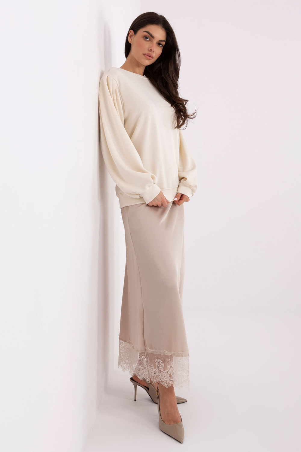 Modelis valkā viena izmēra apģērbu. Modeļa izmēri: augums 173 cm, krūtis 85 cm, viduklis 62 cm, gurni 95 cm.
