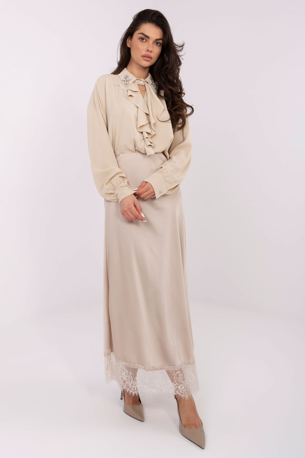 Modelis valkā viena izmēra apģērbu. Modeļa izmēri: augums 173 cm, krūtis 85 cm, viduklis 62 cm, gurni 95 cm.