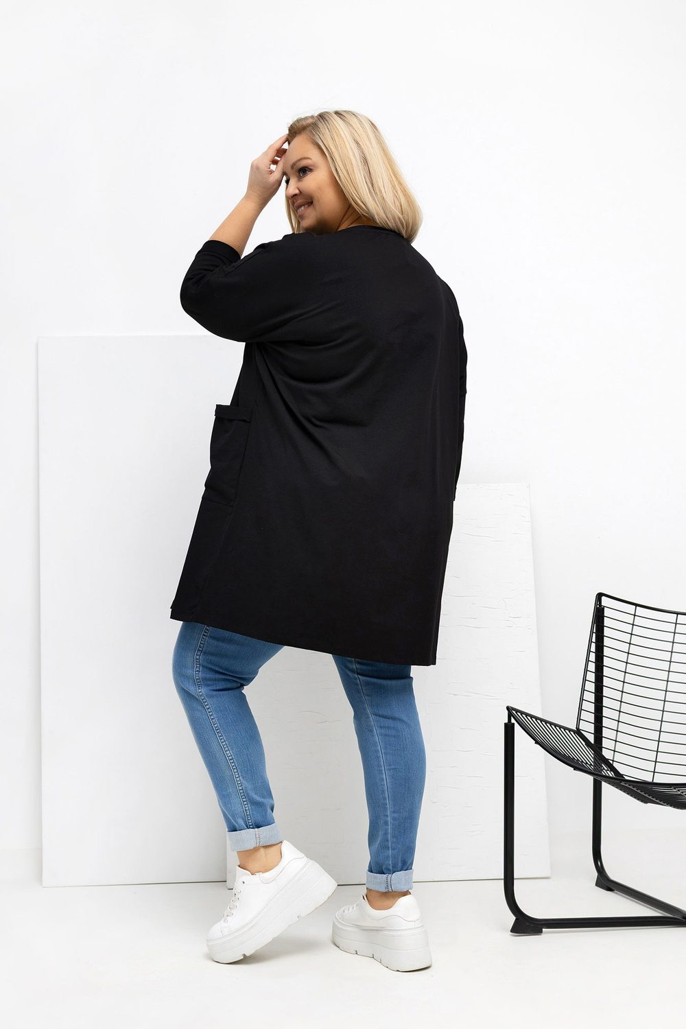 Modelis valkā vienas izmēra apģērbu. Modeļa izmēri: augums 167 cm, krūtis 118 cm, viduklis 90 cm, gurni 118 cm.