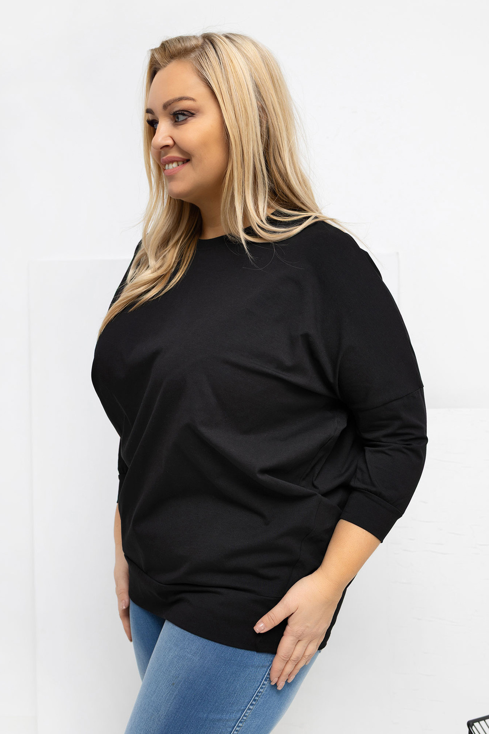 Modelis valkā vienas izmēra apģērbu. Modeļa izmēri: augums 167 cm, krūtis 118 cm, viduklis 90 cm, gurni 118 cm.