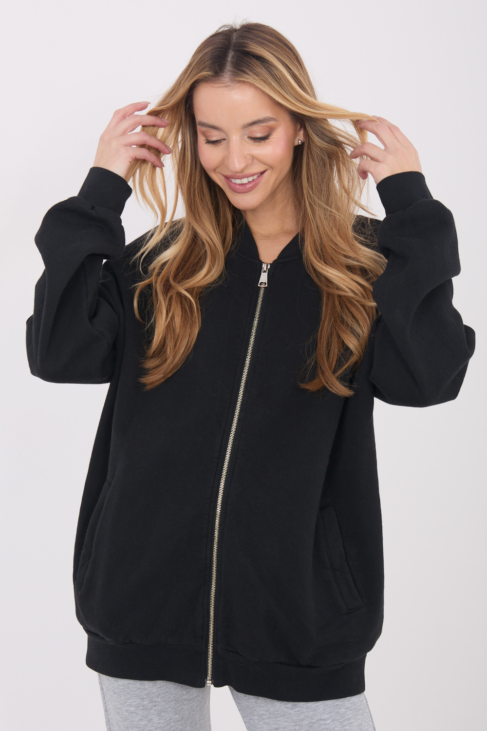Modelis valkā vienas izmēra apģērbu. Modeļa izmēri: augums 169 cm, krūtis 88 cm, viduklis 68 cm, gurni 89 cm.