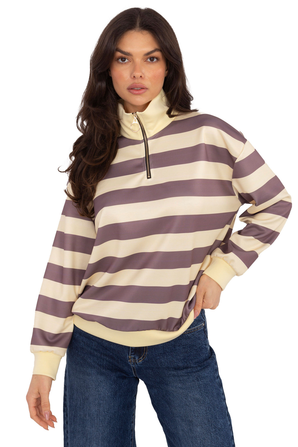 Modelis valkā viena izmēra apģērbu. Modeļa izmēri: augums 173 cm, krūtis 85 cm, viduklis 62 cm, gurni 95 cm .