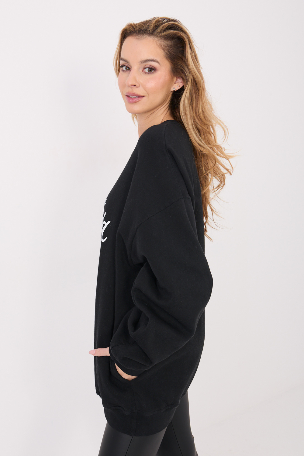 Modelis valkā viena izmēra apģērbu. Modeļa izmēri: augums 169 cm, krūtis 88 cm, viduklis 68 cm, gurni 89 cm.