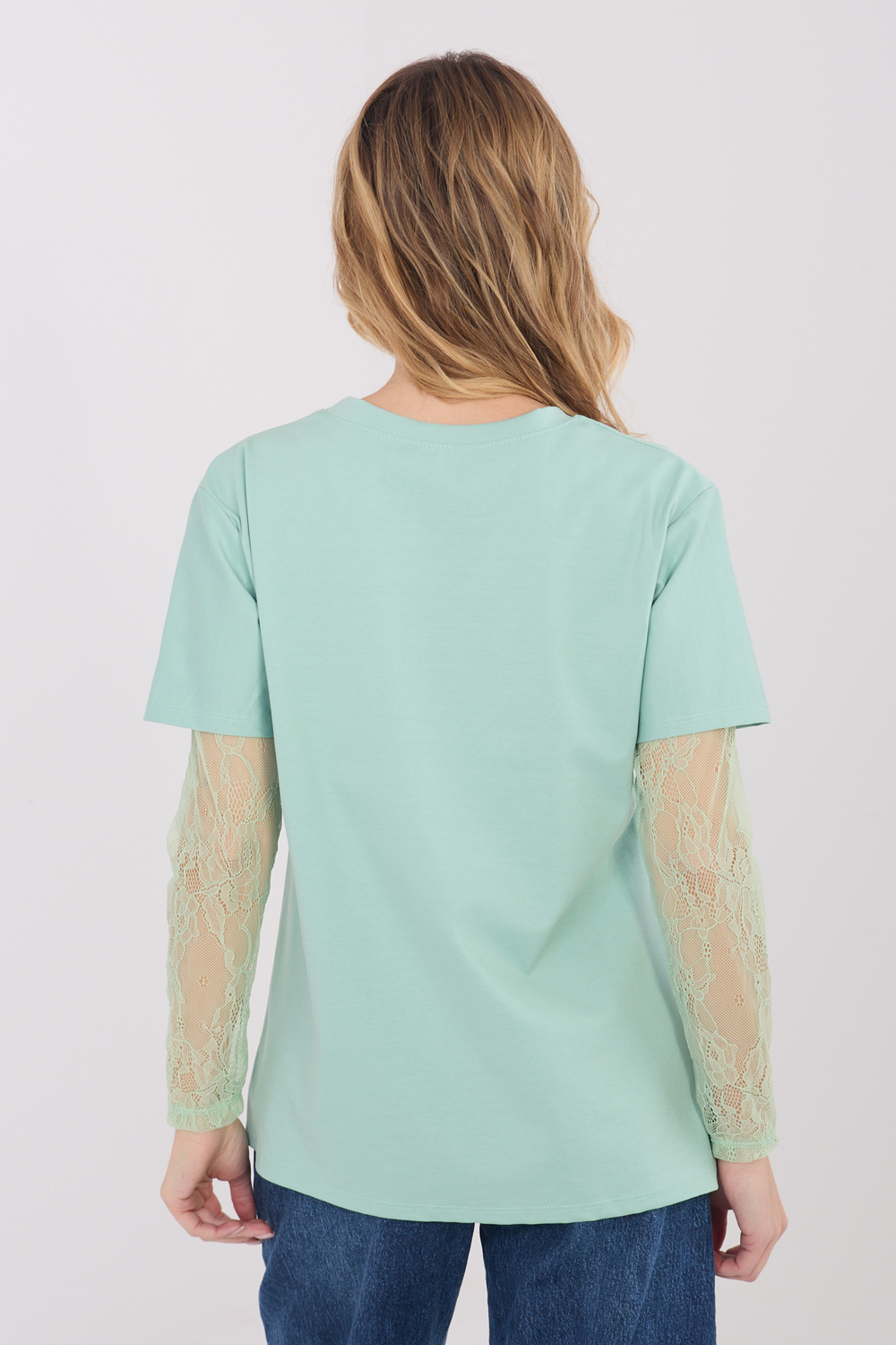 Modelis valkā vienas izmēra drēbes. Modeļa izmēri: augums 169 cm, krūtis 88 cm, viduklis 68 cm, gurni 89 cm.
