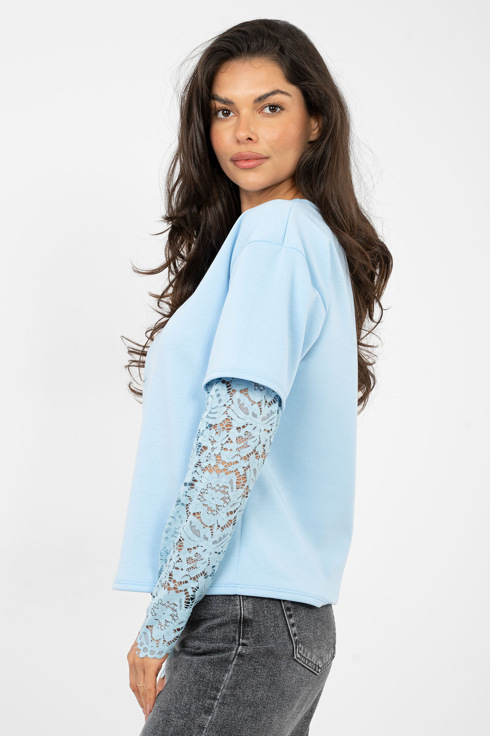 Modelis valkā viena izmēra apģērbu. Modeļa izmēri: augums 173 cm, krūtis 85 cm, viduklis 62 cm, gurni 95 cm.