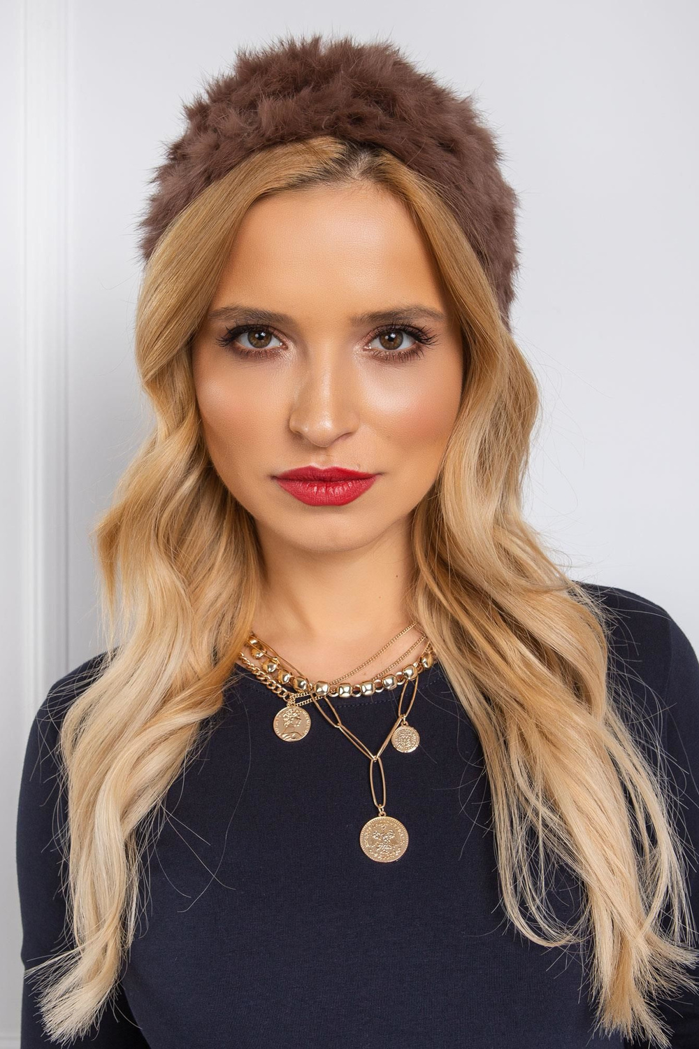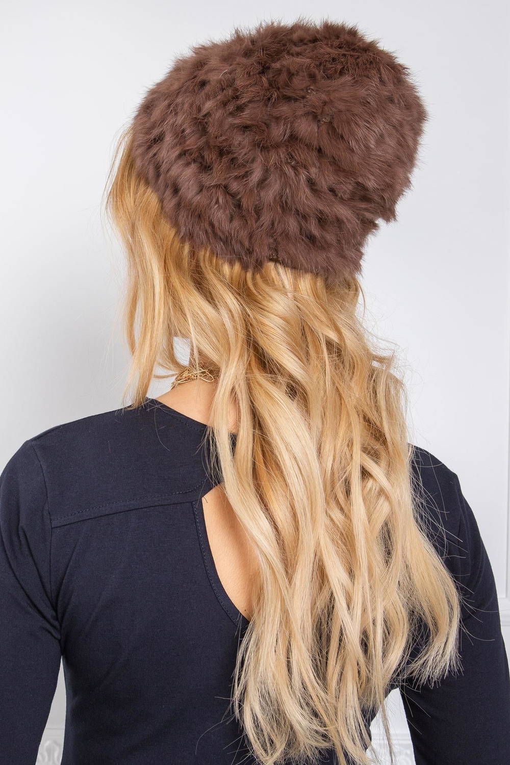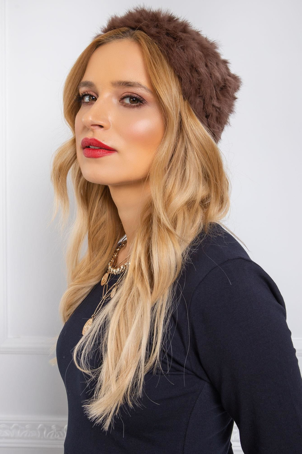 Brūna kažokādas vāciņš. materiāla sastāvs: augšdaļa - 100% lapīns, odere - 100% akrils Mazgāšanas veids: nemazgāt Modelis valkā vienu izmēru. Modeļa izmēri: augums 175 cm, krūtis 84 cm, viduklis 65 cm, gurni 92 cm.