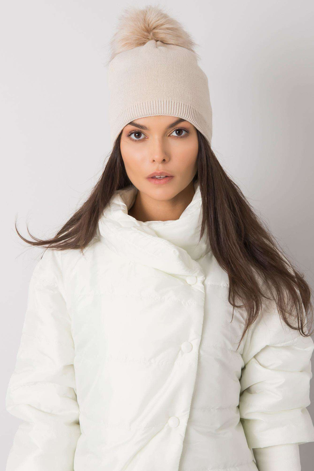 Bēša izolēta sieviešu cepure ar pušķi. Produkta ekstras: flīsa oderes materiālssastāvs: 70% akrils, 30% vilna Mazgāšanas metode: veļas mašīna 30°C.