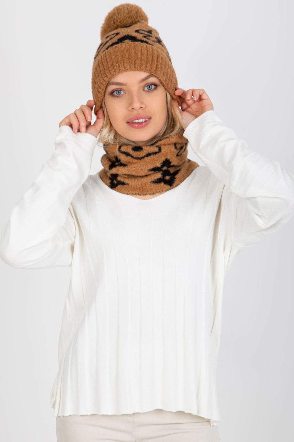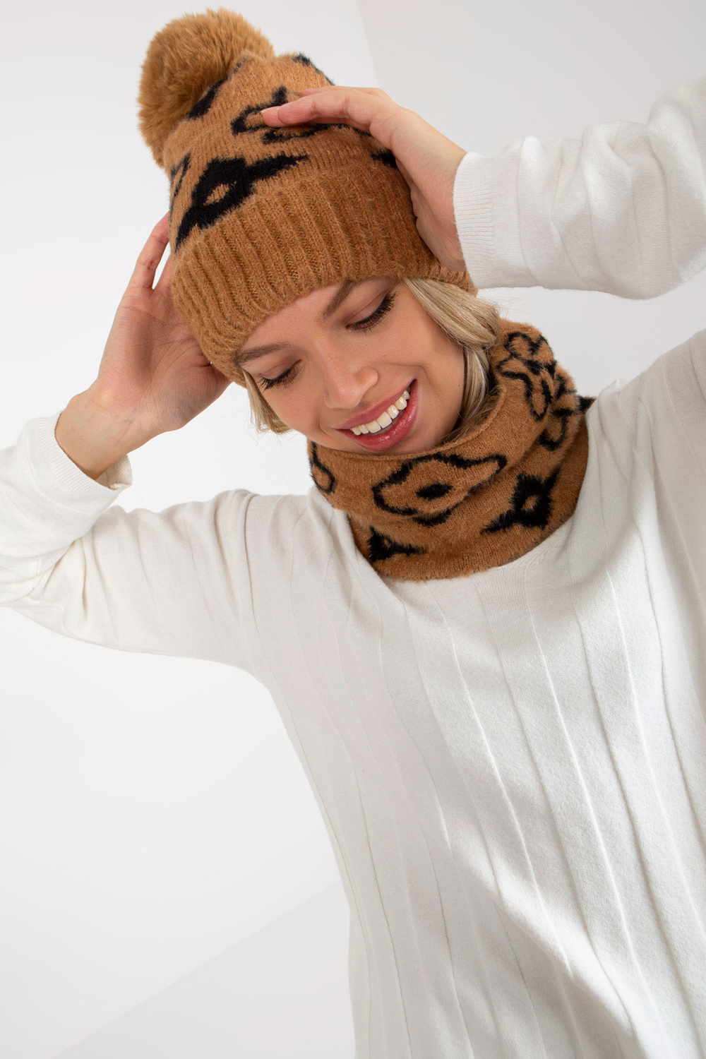 Kamieļu un melna sieviešu ziemas cepure ar pomponu< /strong> .