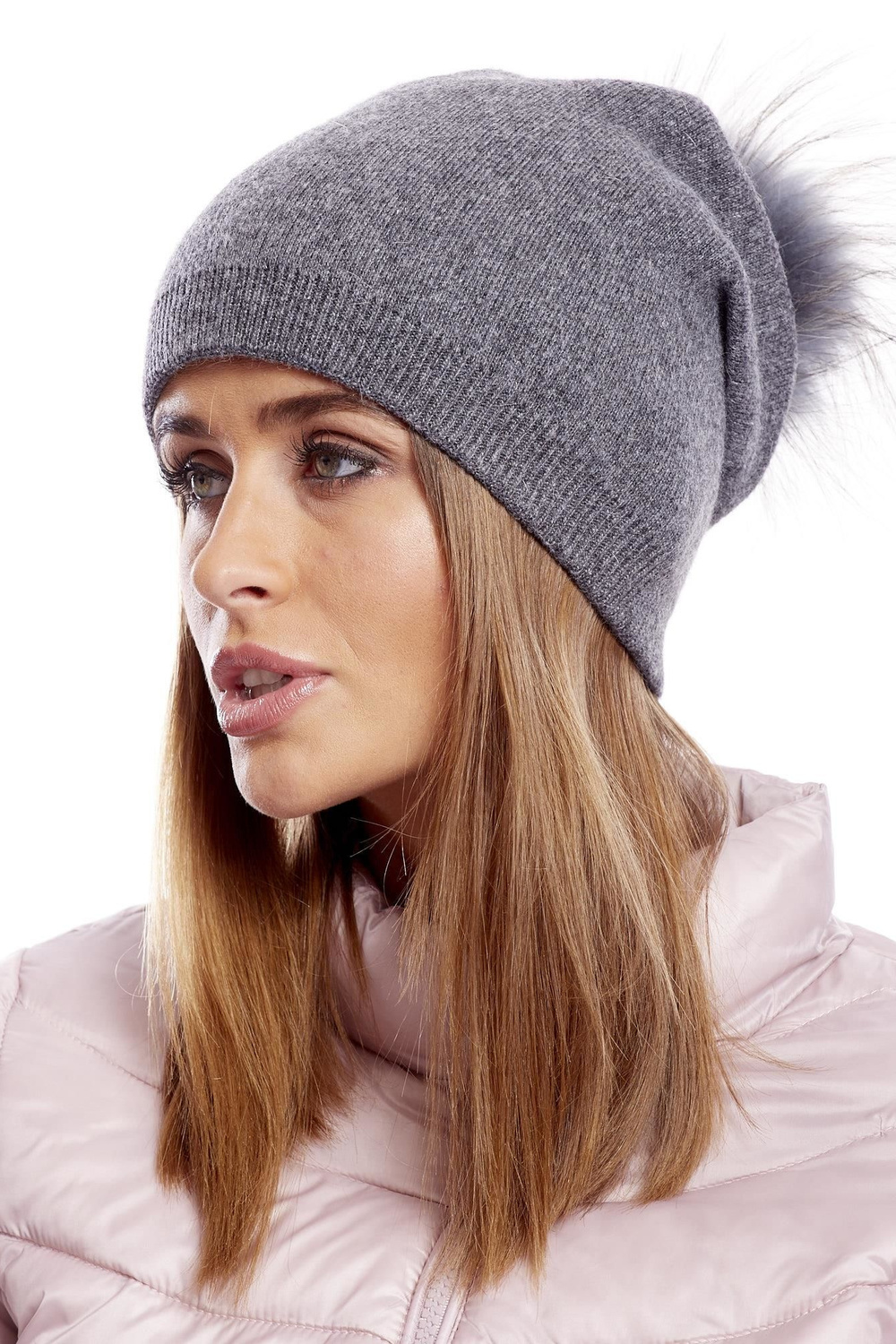 Pelēka sieviešu cepure ar kažokādas pomponu