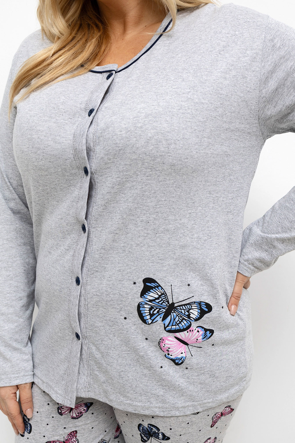Pidžamas izmēri XL izmērā, mērīti guļus stāvoklī: blūze: platums zem padusēm - 55 cm, piedurknes garums - 58 cm, kopējais garums - 70 cm, apakšdaļas platums - 55 cm, bikses: vidukļa platums - 32 cm (guļus), vidukļa platums - 71 cm (izstiepts), gurnu platums - 59 cm, kopējais garums - 97 cm.