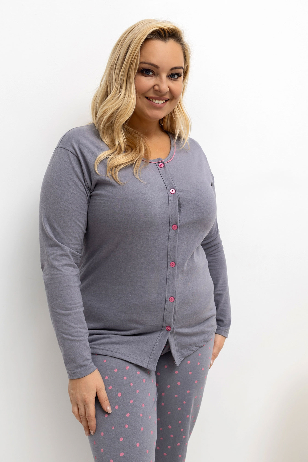 Pidžamas XL izmēra izmēri mērīti guļus pozā: blūze: platums padusēs – 56 cm, piedurknes garums – 60 cm, kopējais garums – 70 cm, apakšdaļas platums – 56 cm, bikses: jostasvietas platums – 38 cm (guļus), jostasvietas platums – 72 cm (izstiepts), gurnu platums – 58 cm, kopējais garums – 97 cm.