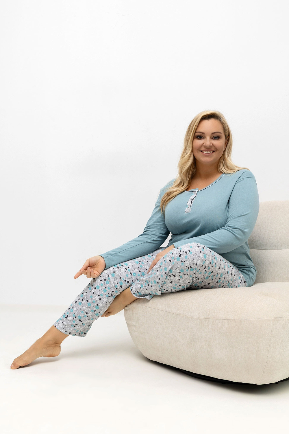 Pidžamas izmēri XL izmērā, mērīti guļus stāvoklī: krekls: platums zem padusēm - 56 cm, piedurknes garums - 59 cm, kopējais garums - 69 cm, apakšas platums - 56 cm, bikses: vidukļa platums - 32 cm (guļot), vidukļa platums - 68 cm (izstiepts), gurnu platums - 56 cm, kopējais garums - 101 cm.