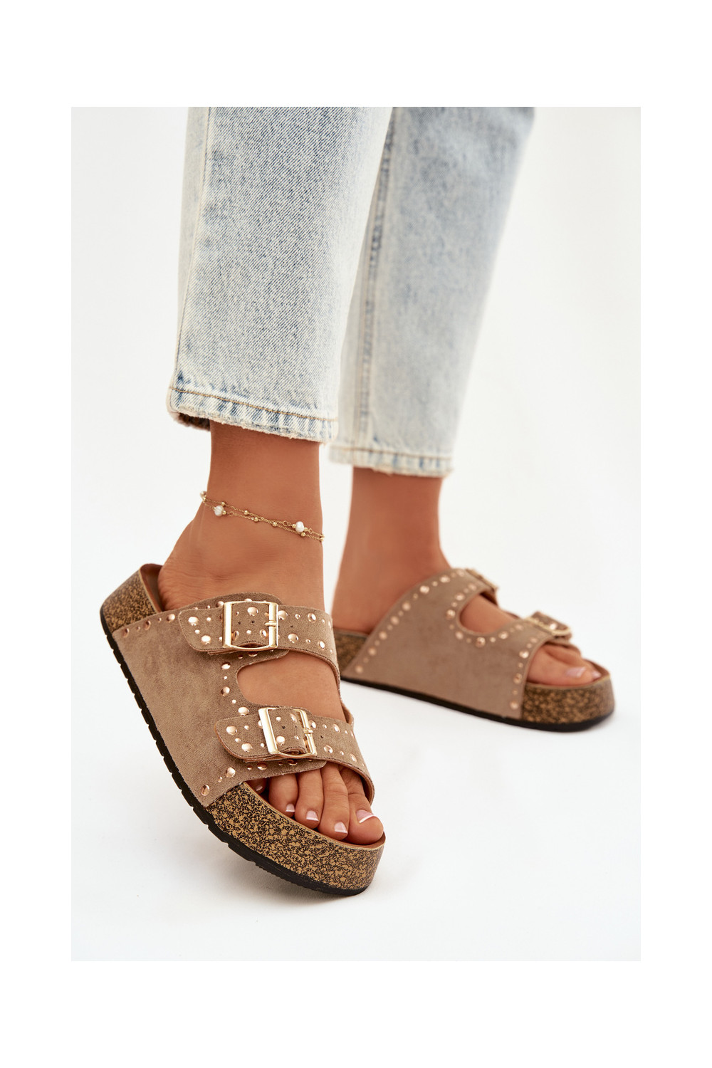Sieviešu haki krāsas čības ar zelta krāsas sprādzēm un naglām Tervina