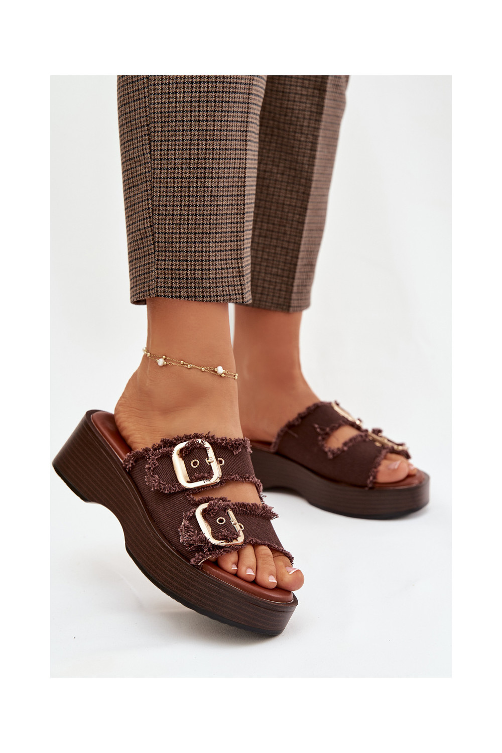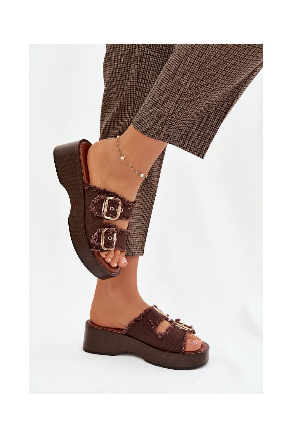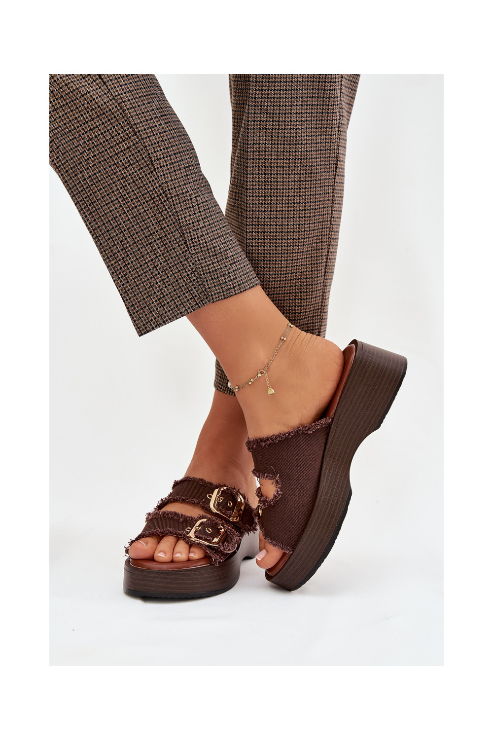 Sieviešu čības ar platformu zelta krāsā ar šokolādes krāsas sprādzēm