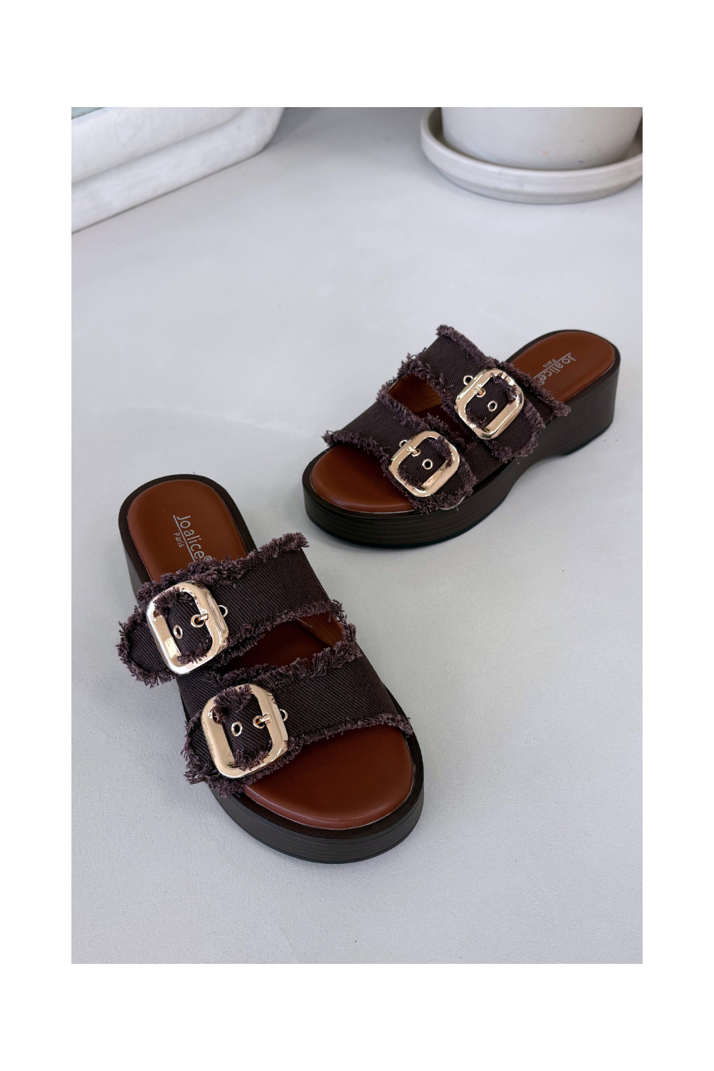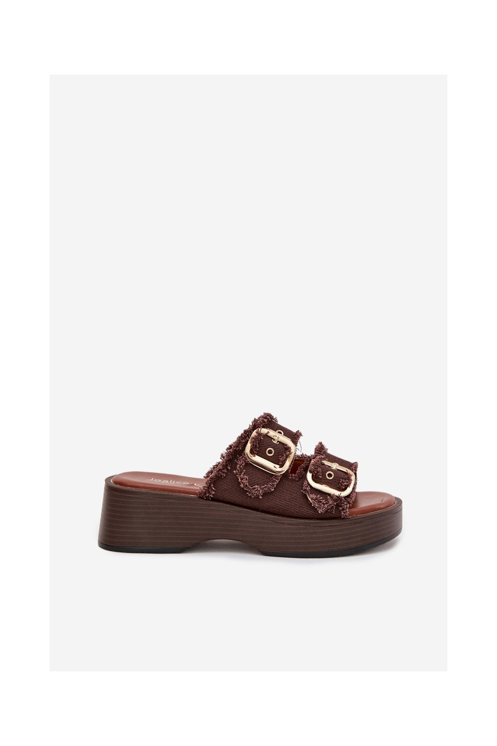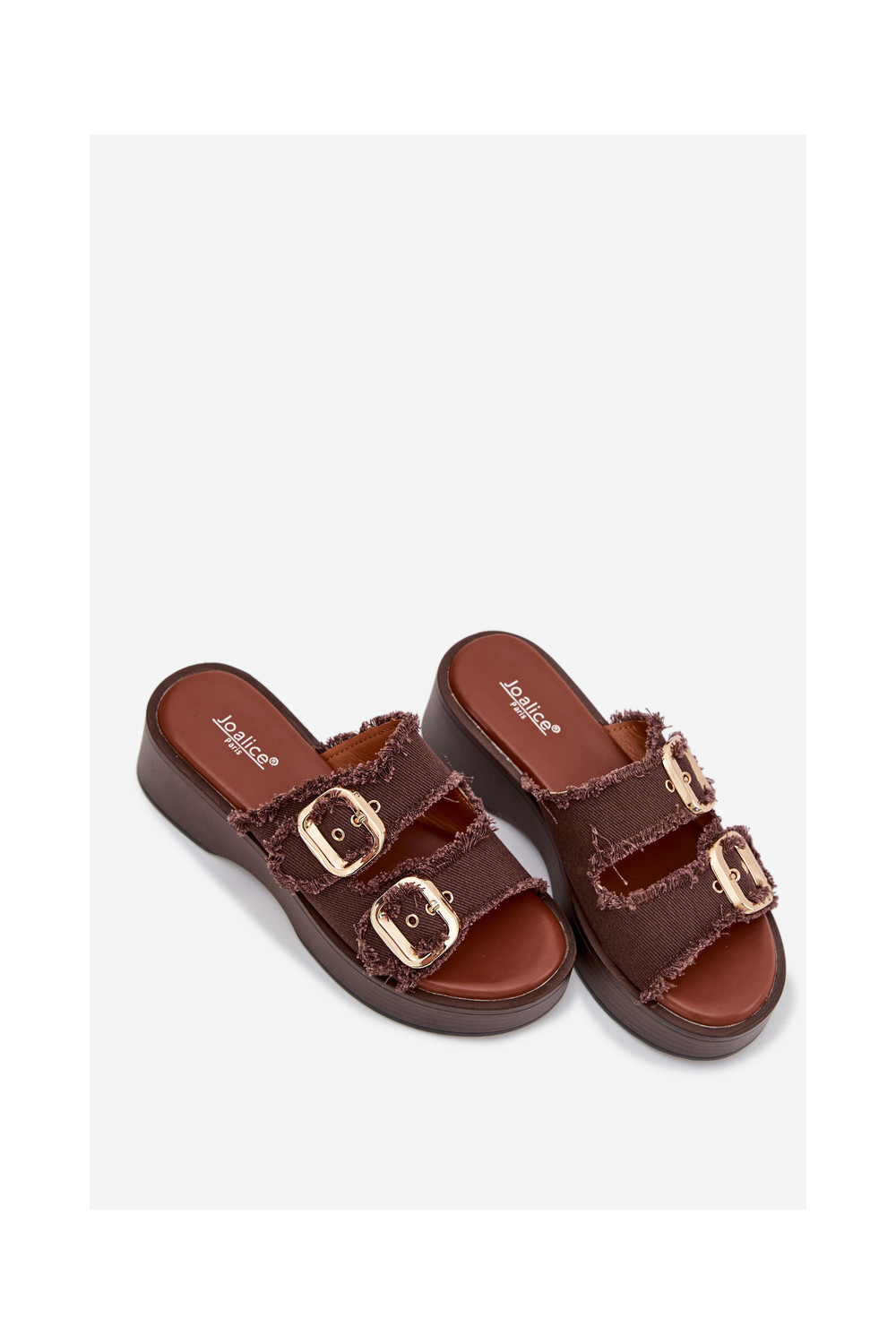 Sieviešu čības ar platformu zelta krāsā ar šokolādes krāsas sprādzēm