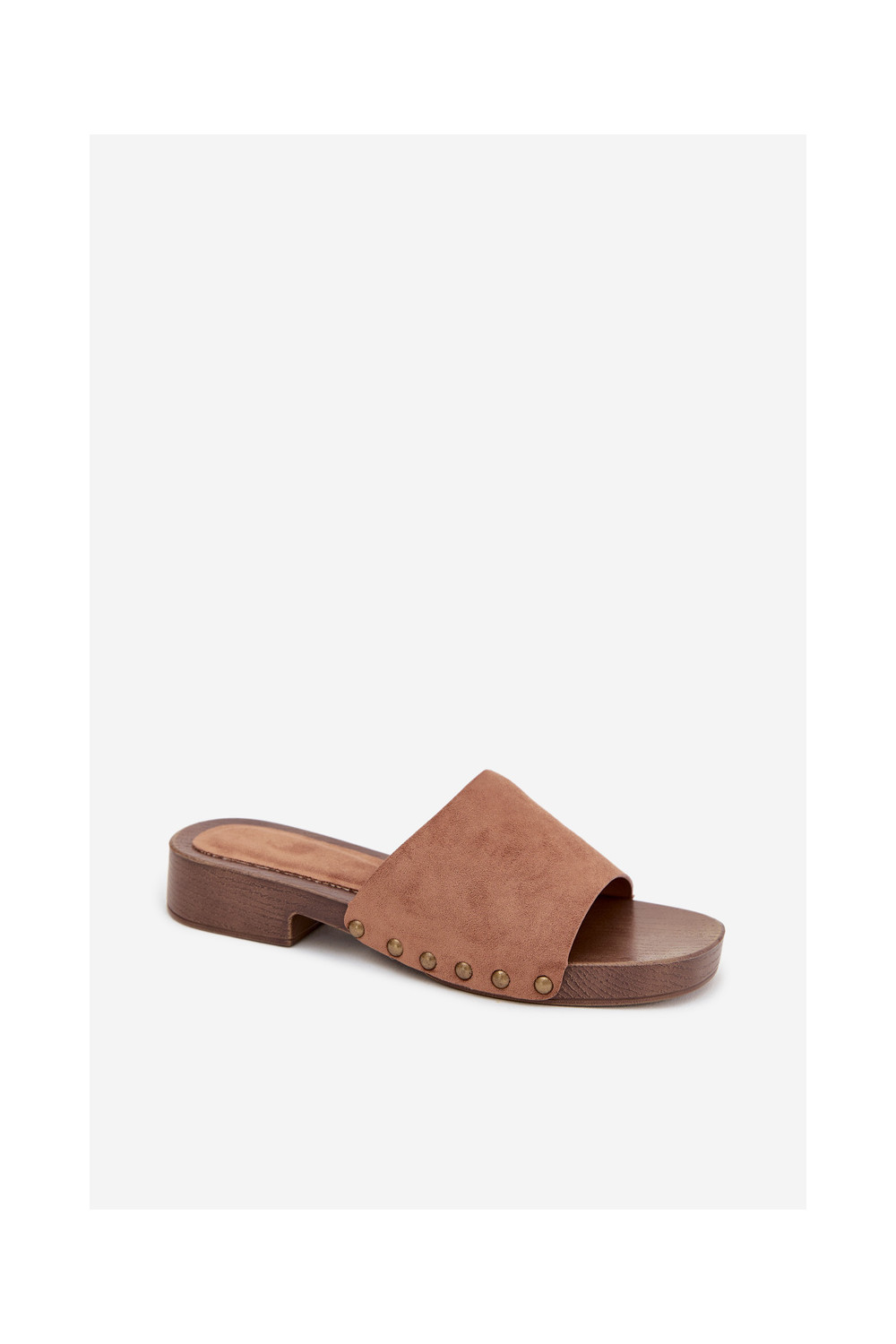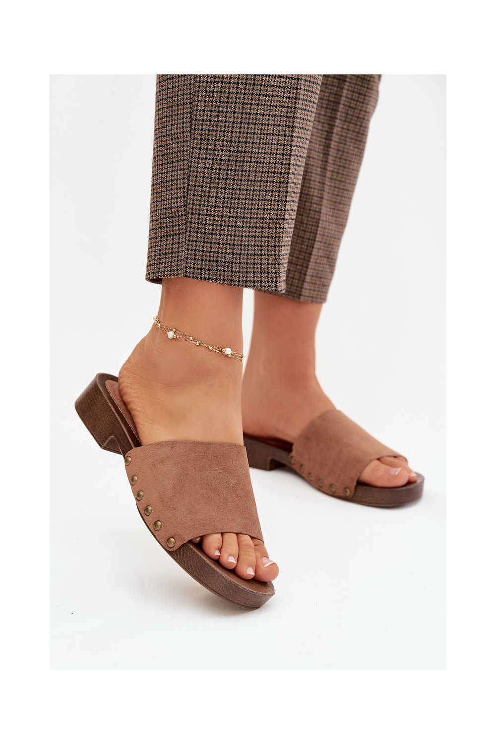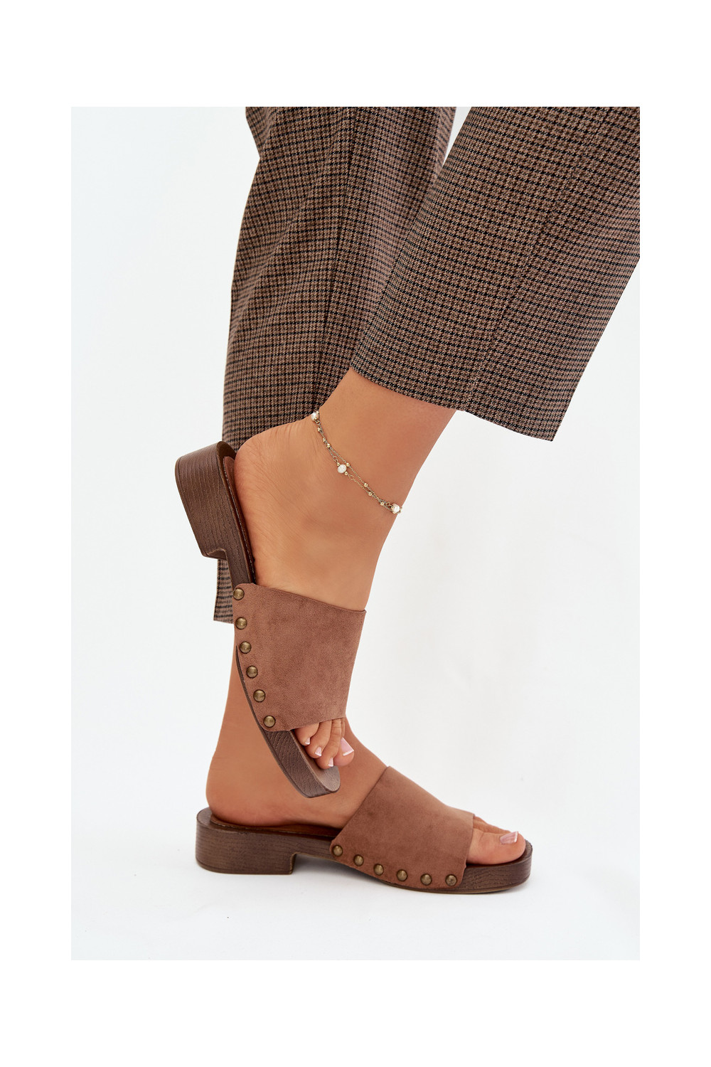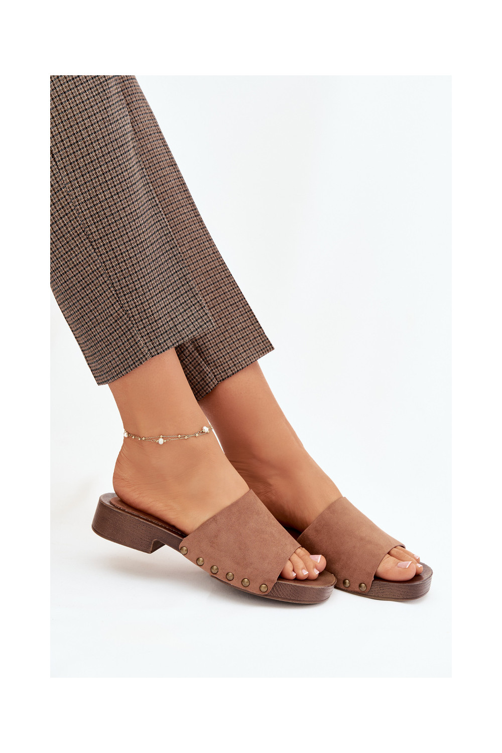 Sieviešu čības ar platām papēžiem zelta krāsā ar brūnā krāsas naglām