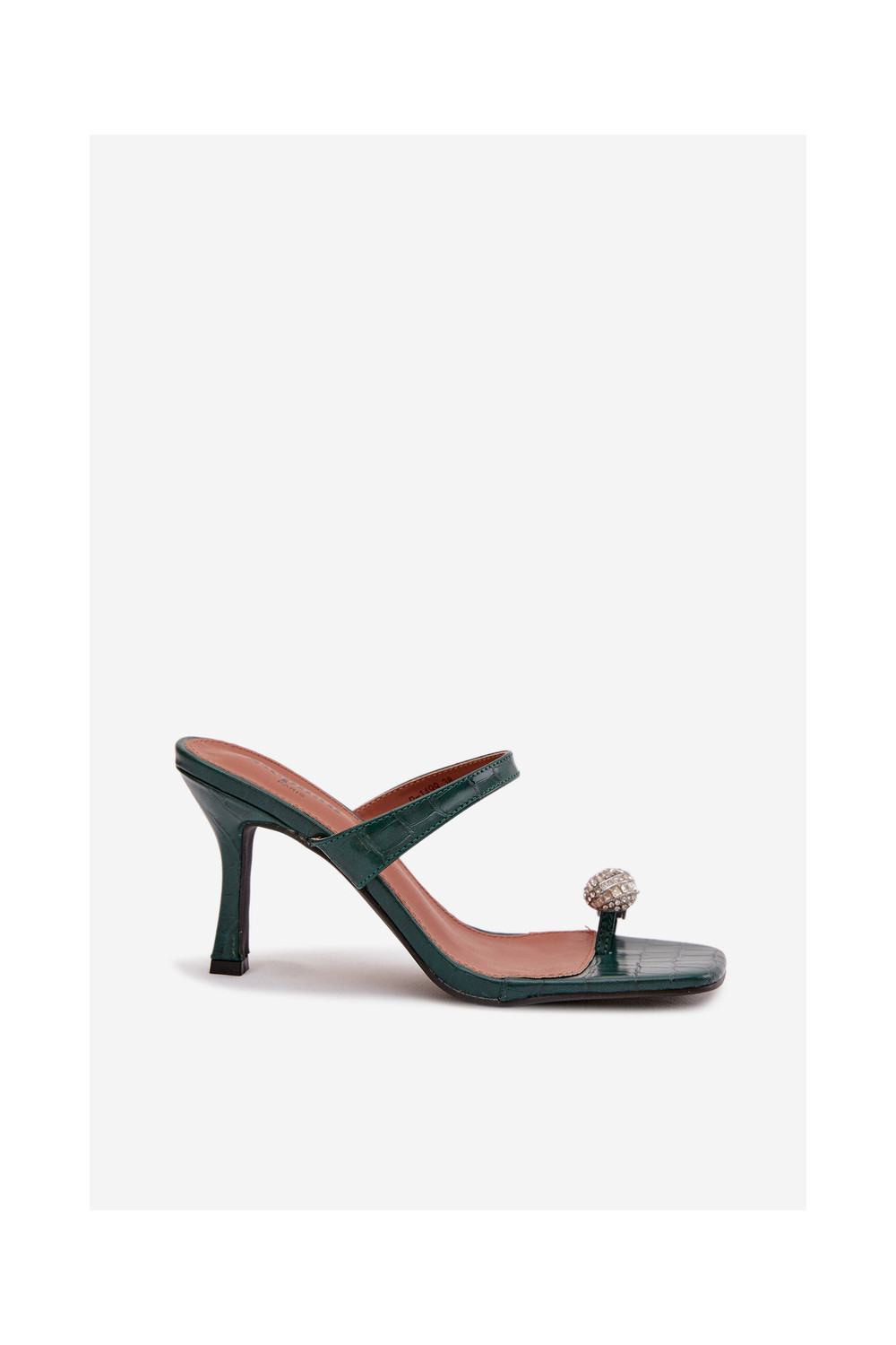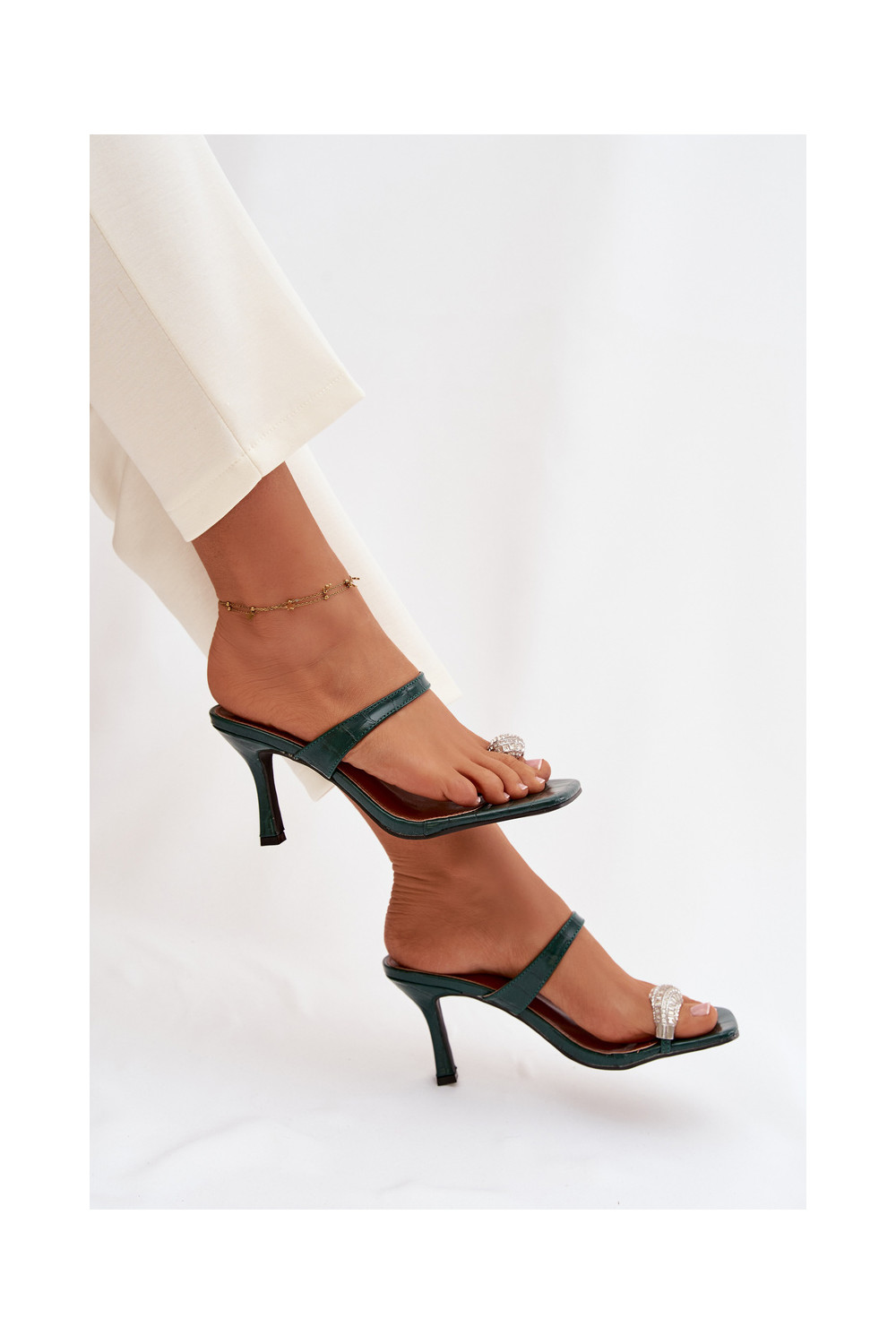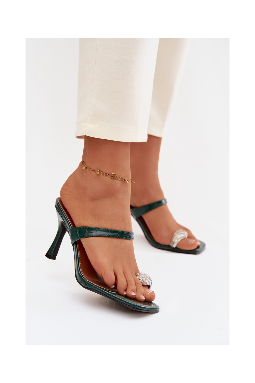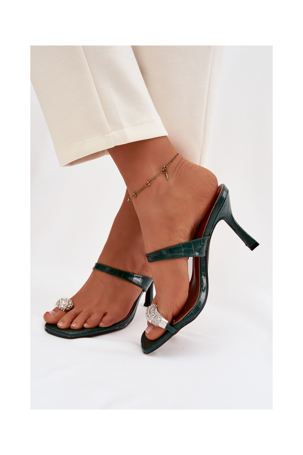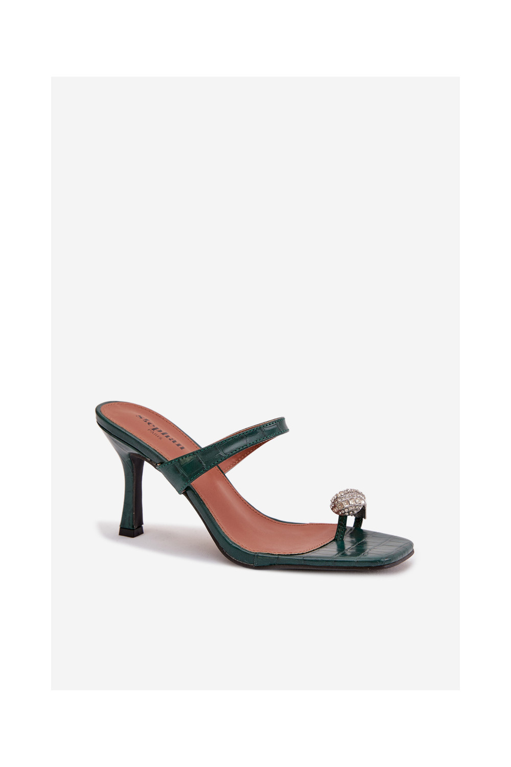 Sieviešu pudeles zaļas krāsas čības ar plāniem papēžiem un grezniem dekoriem Lorissa