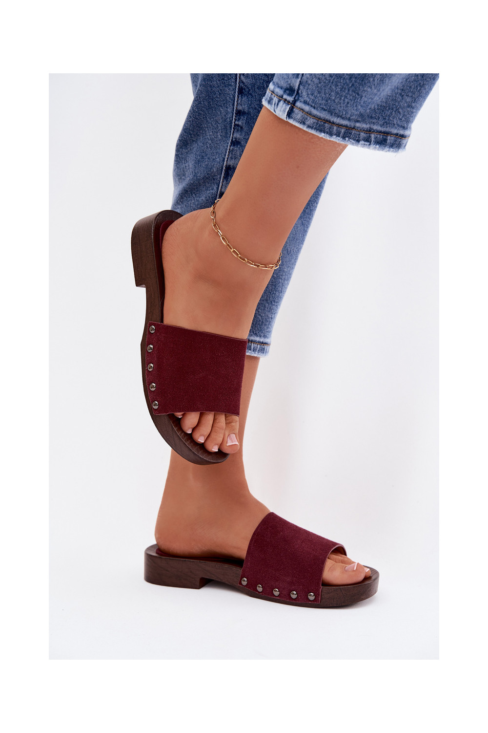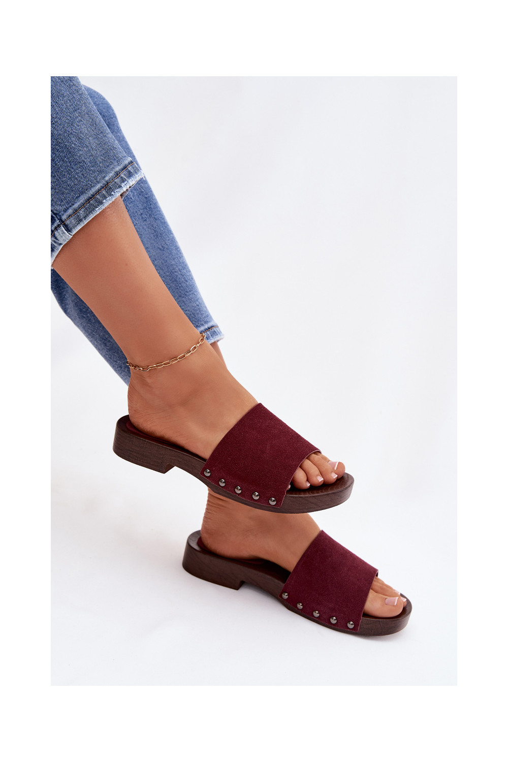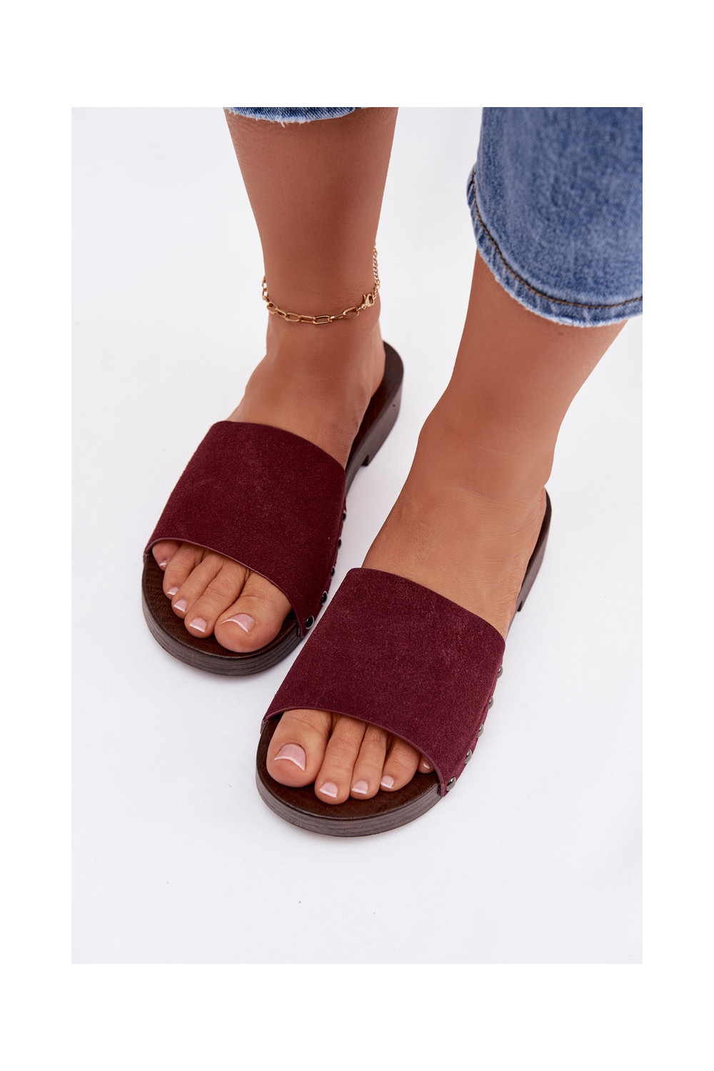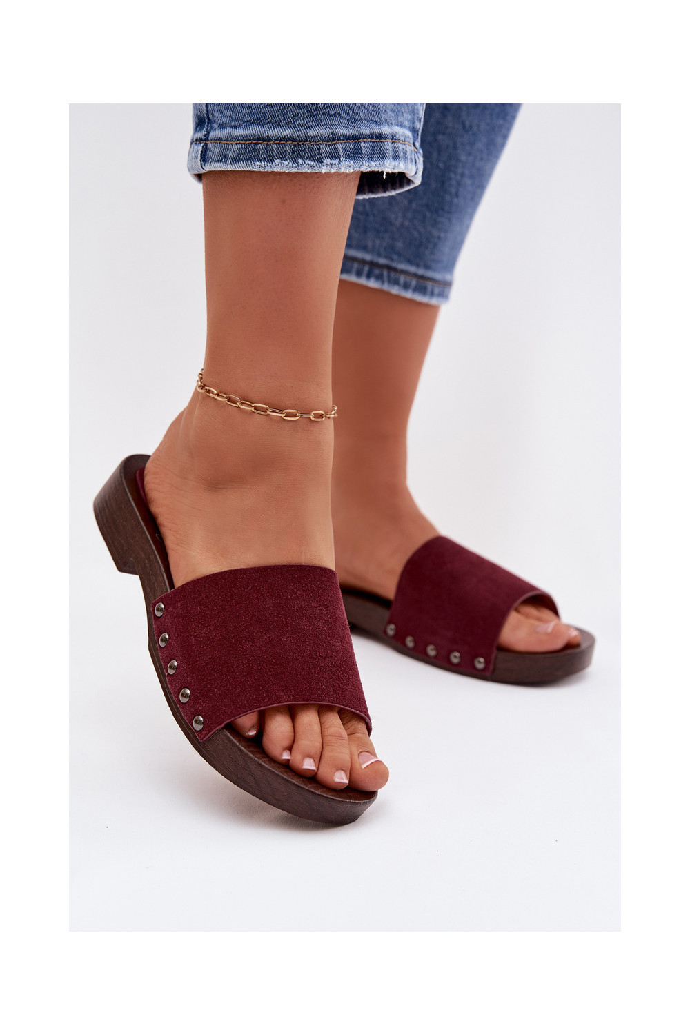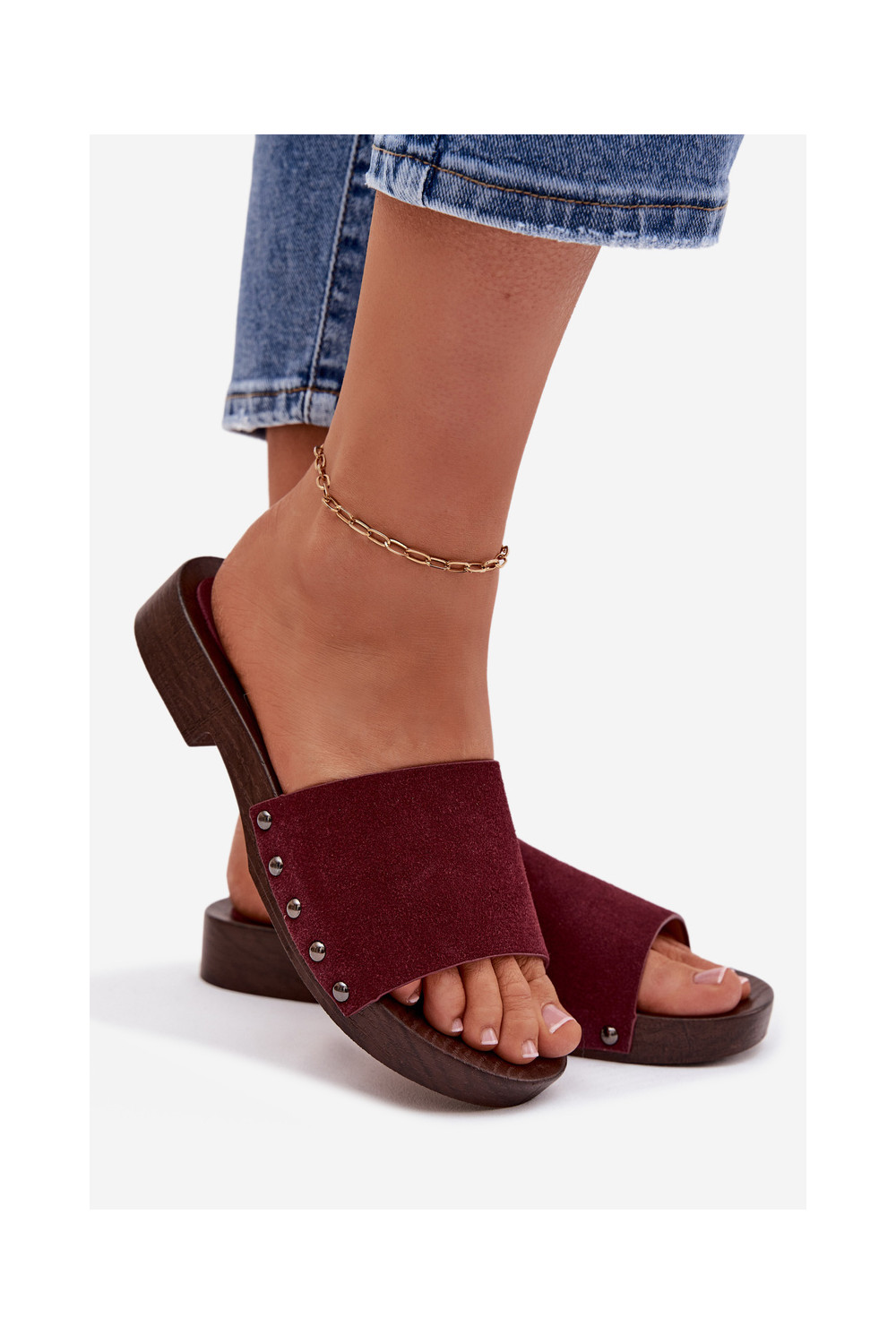 sieviešu čības ar kniedēm ar platiem papēžiem bordo krāsas Amelvessa