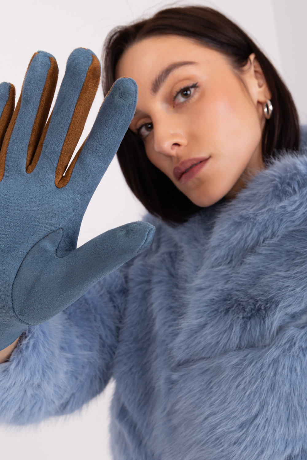Netīri zili cimdi ar pītām siksnām .