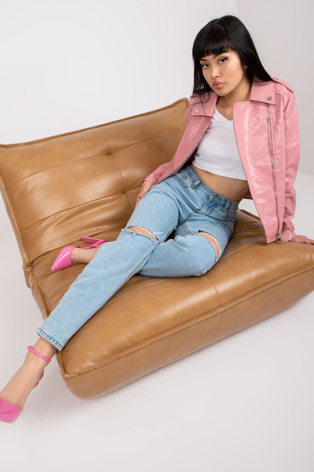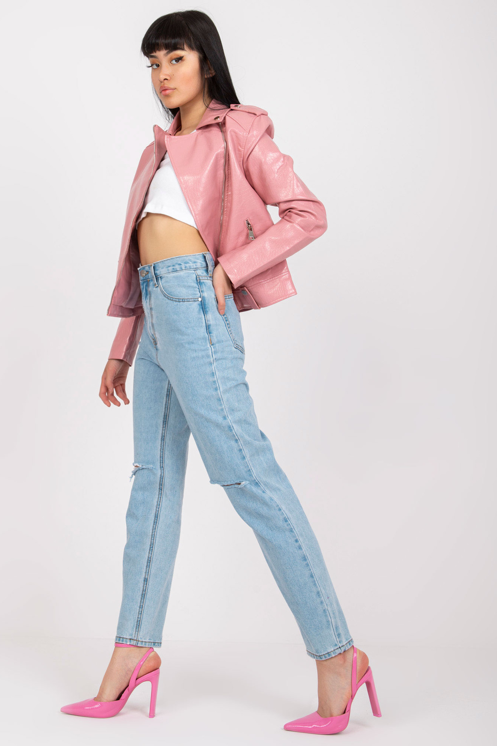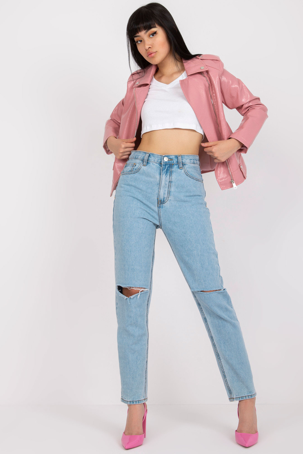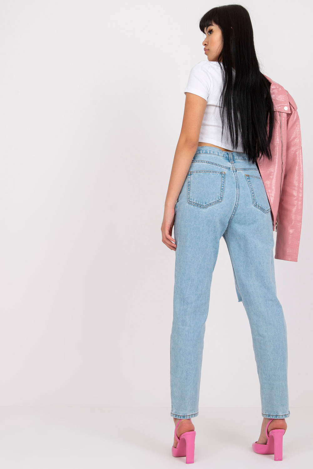 Gaiši zilas mom fit sieviešu džinsa bikses.