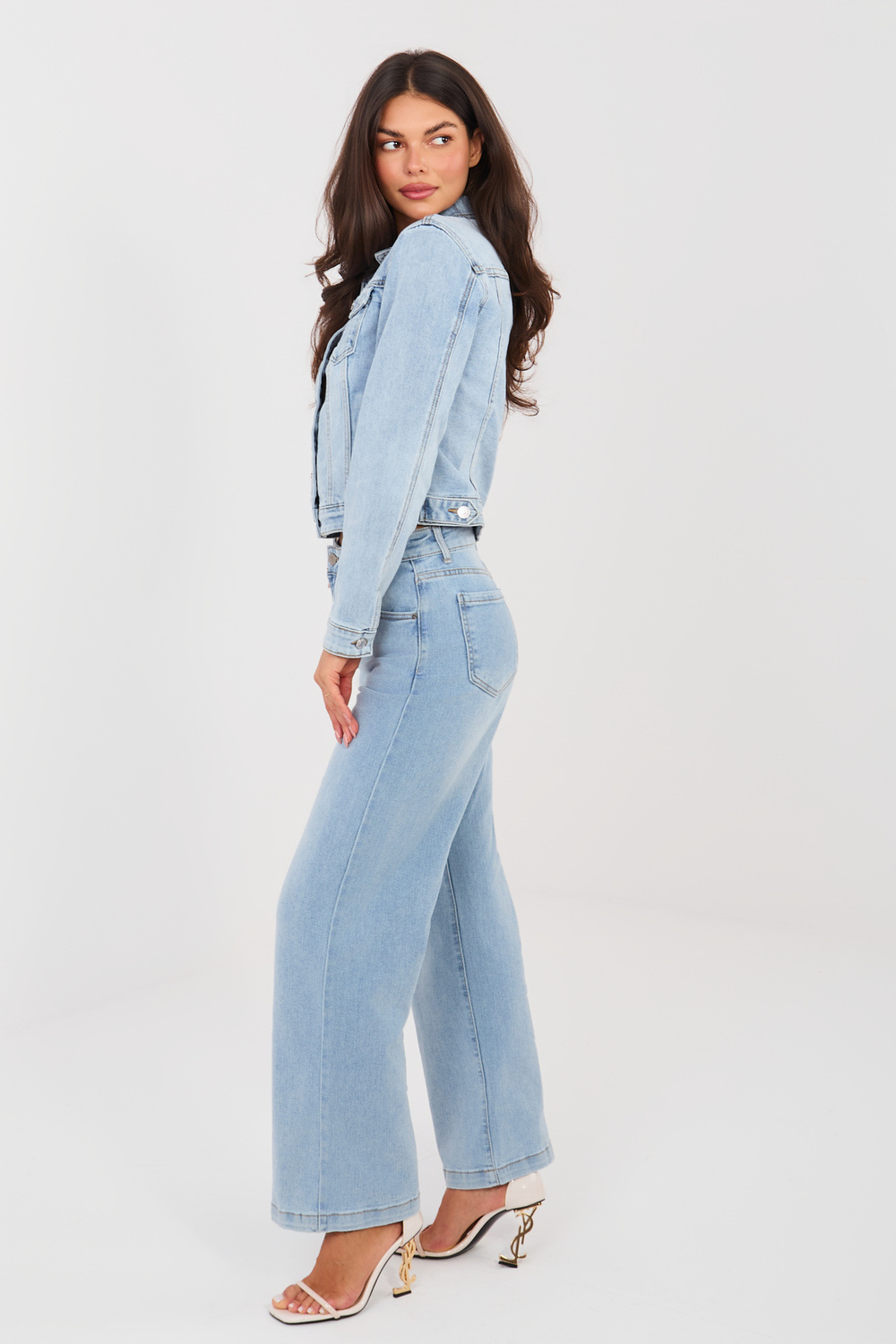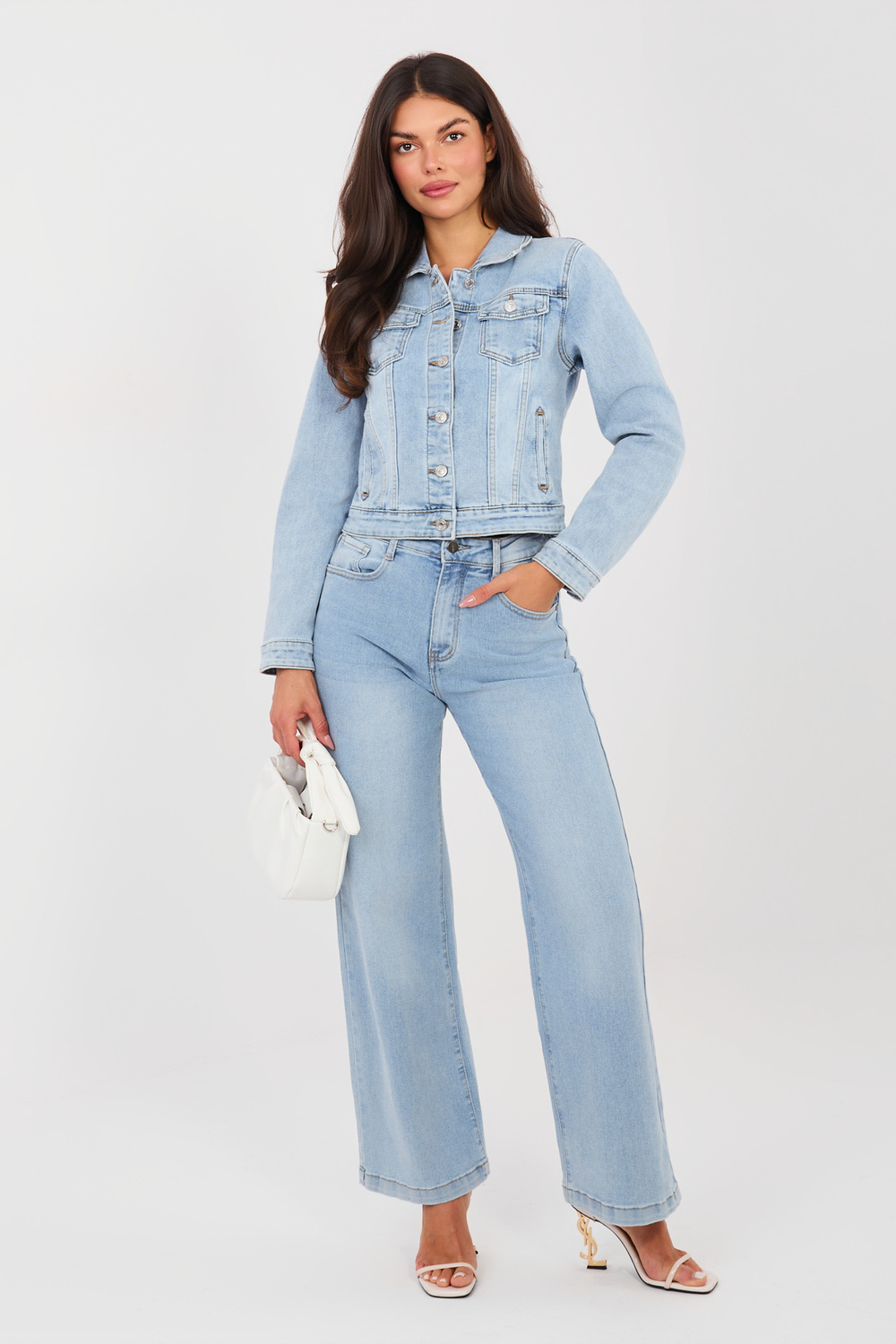 Modelis valkā S izmēru. Modeļa izmēri: augums 173 cm, krūtis 85 cm, viduklis 62 cm, gurni 95 cm.