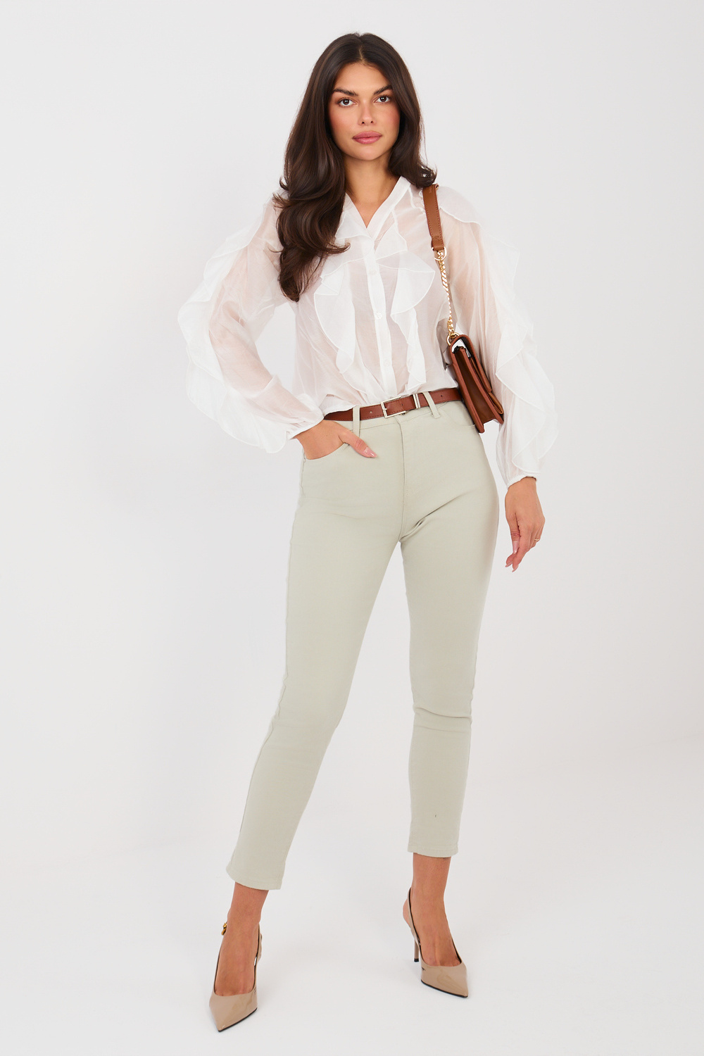 Modelis valkā S izmēru. Modeļa izmēri: augums 173 cm, krūtis 85 cm, viduklis 62 cm, gurni 95 cm.