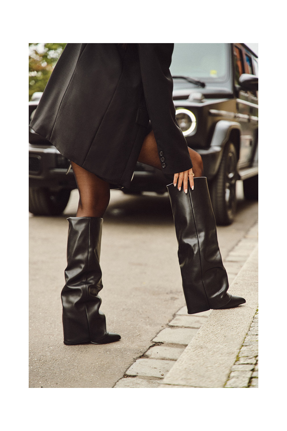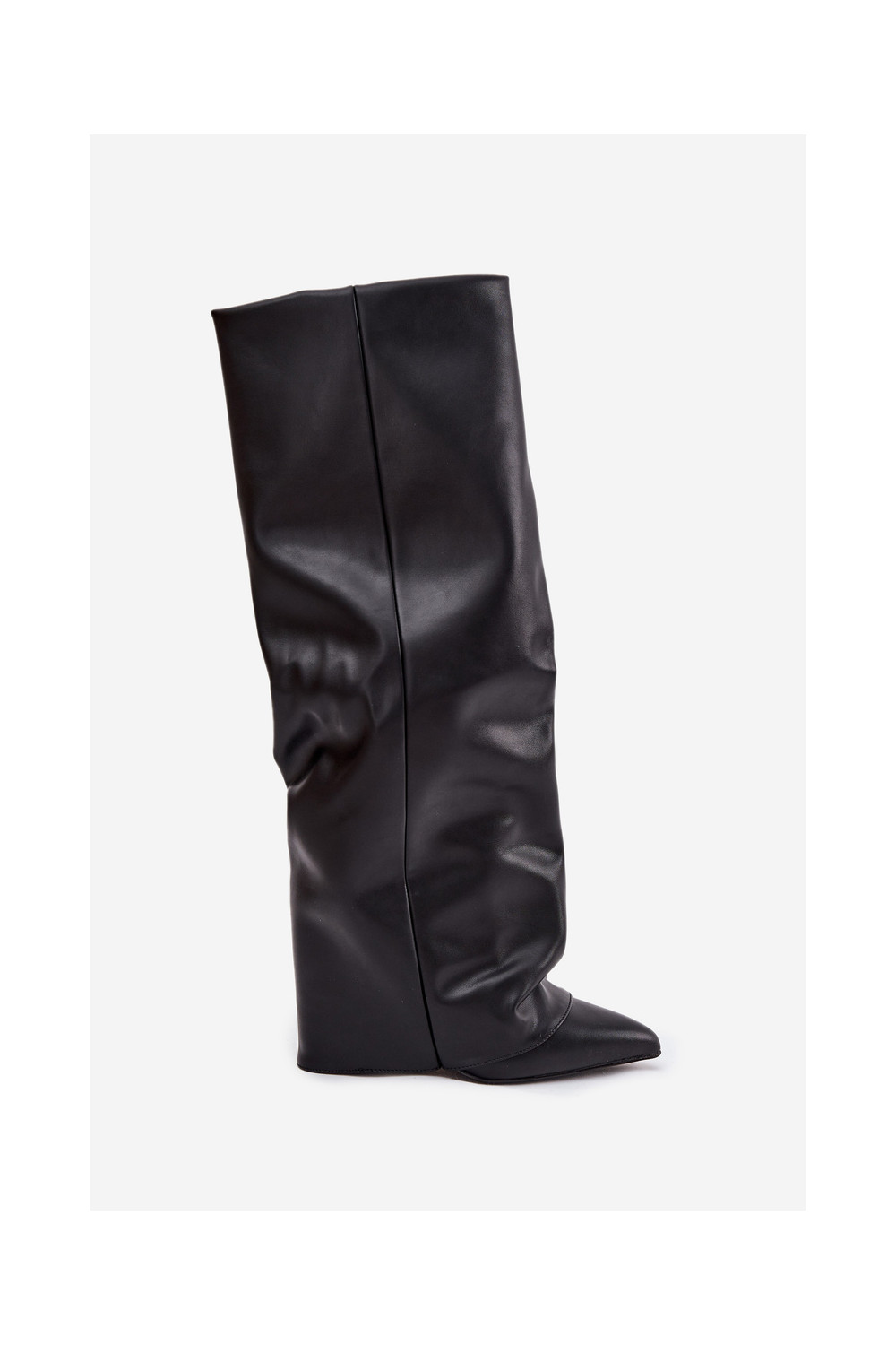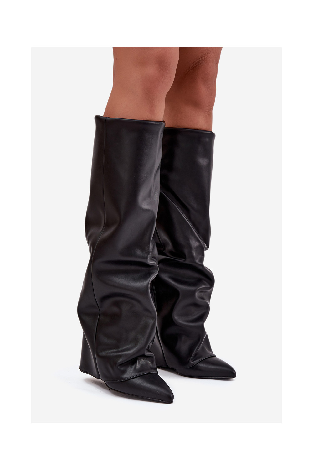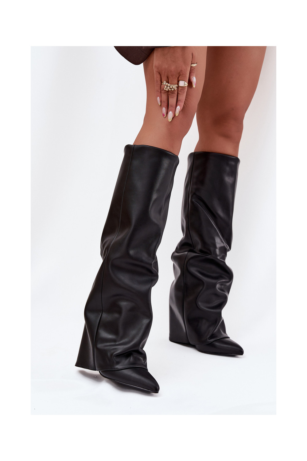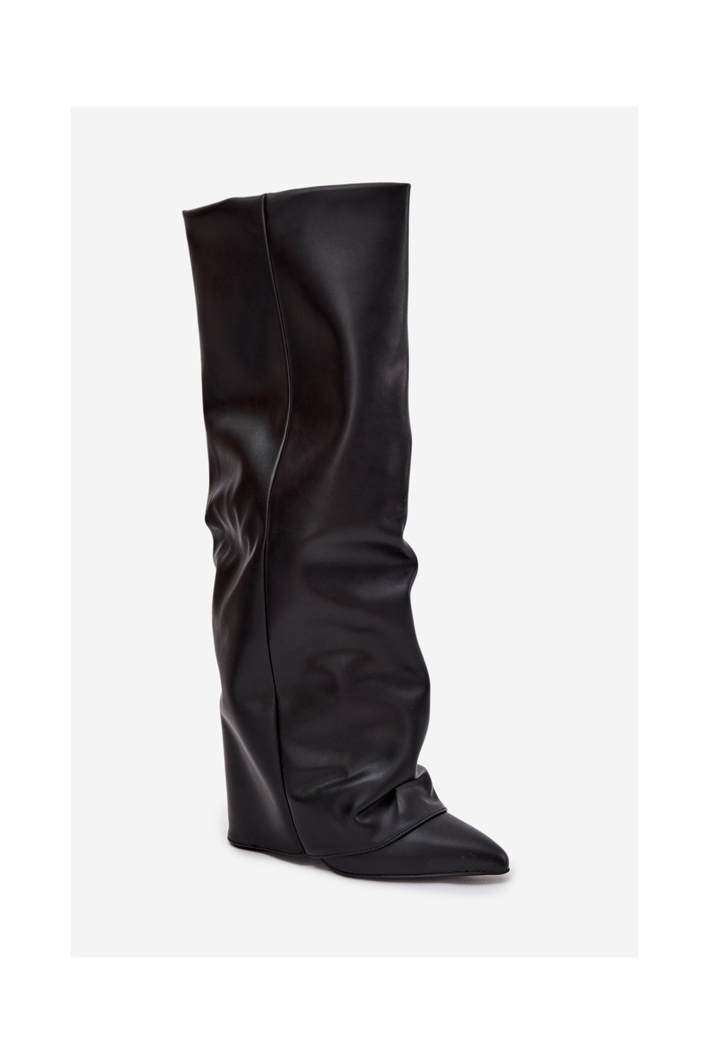 Siltināti sieviešu garie zābaki ar iešūtu šņori un papēžiem, melnā krāsā, Elivira
