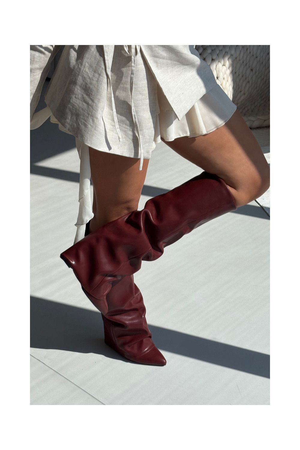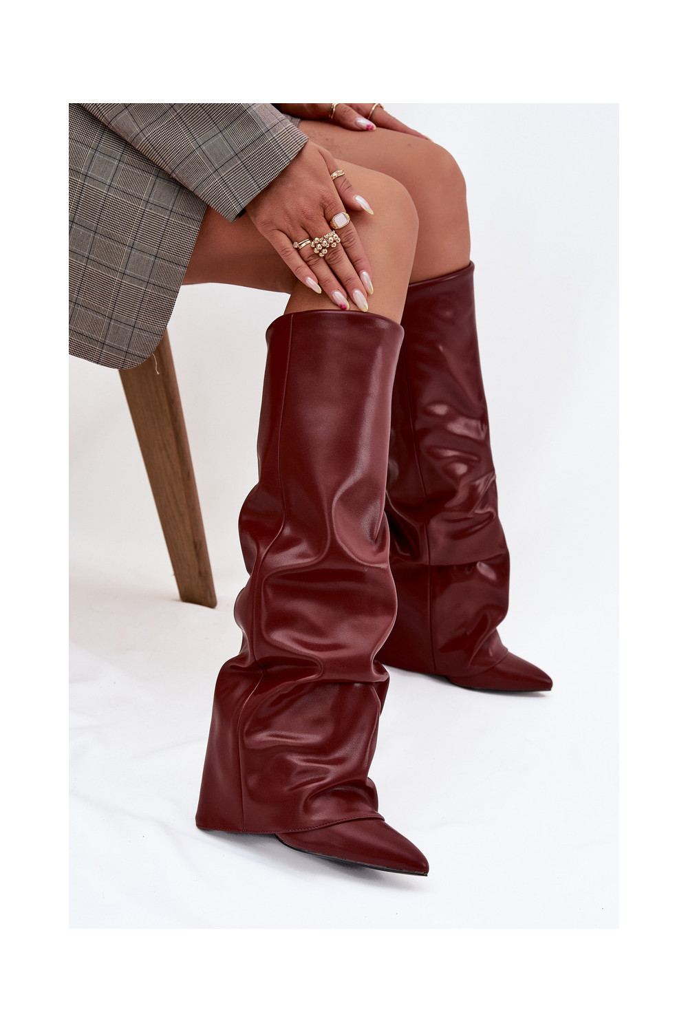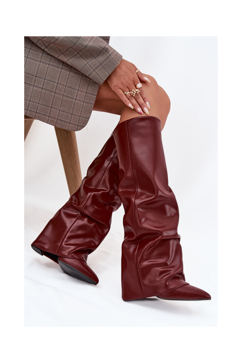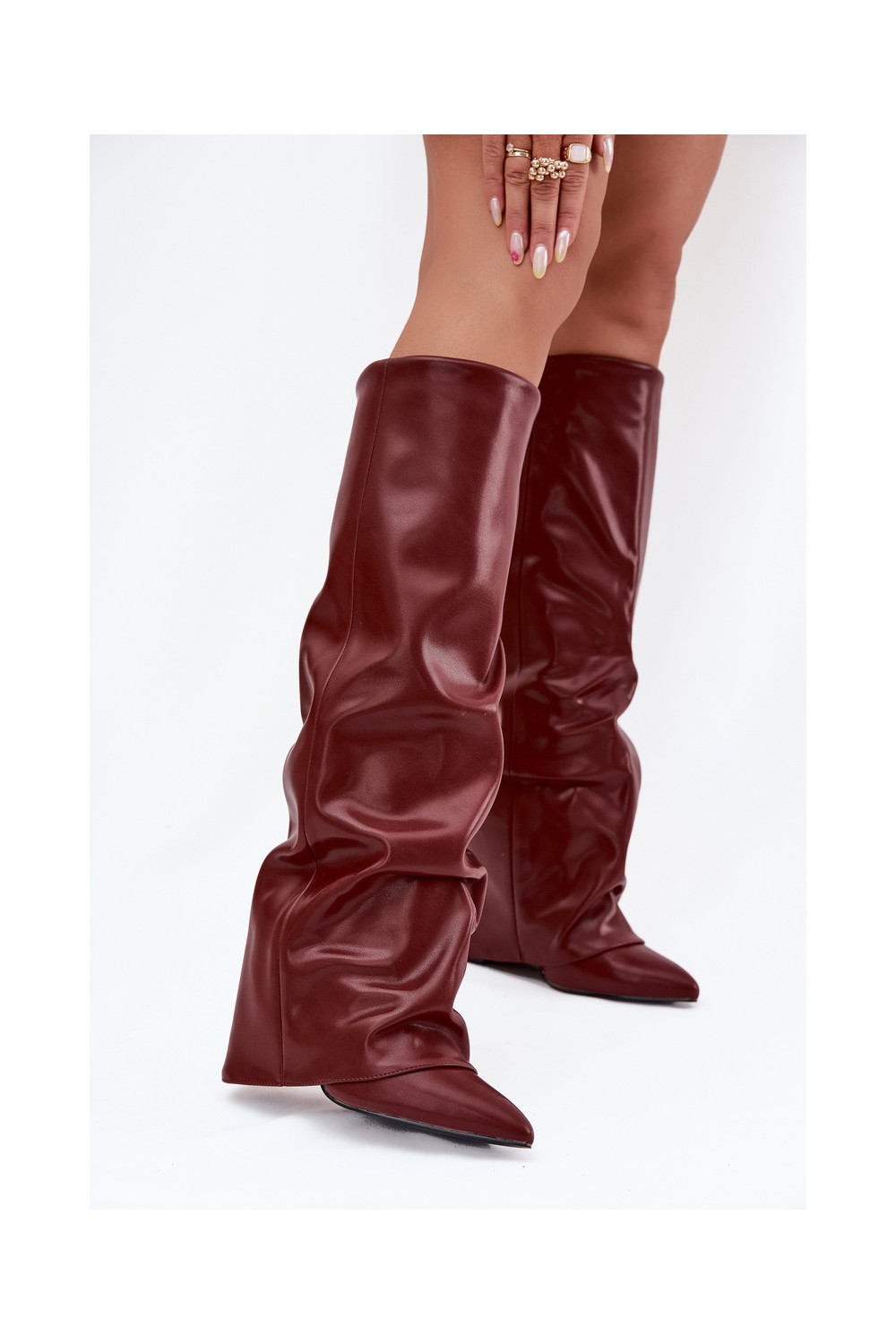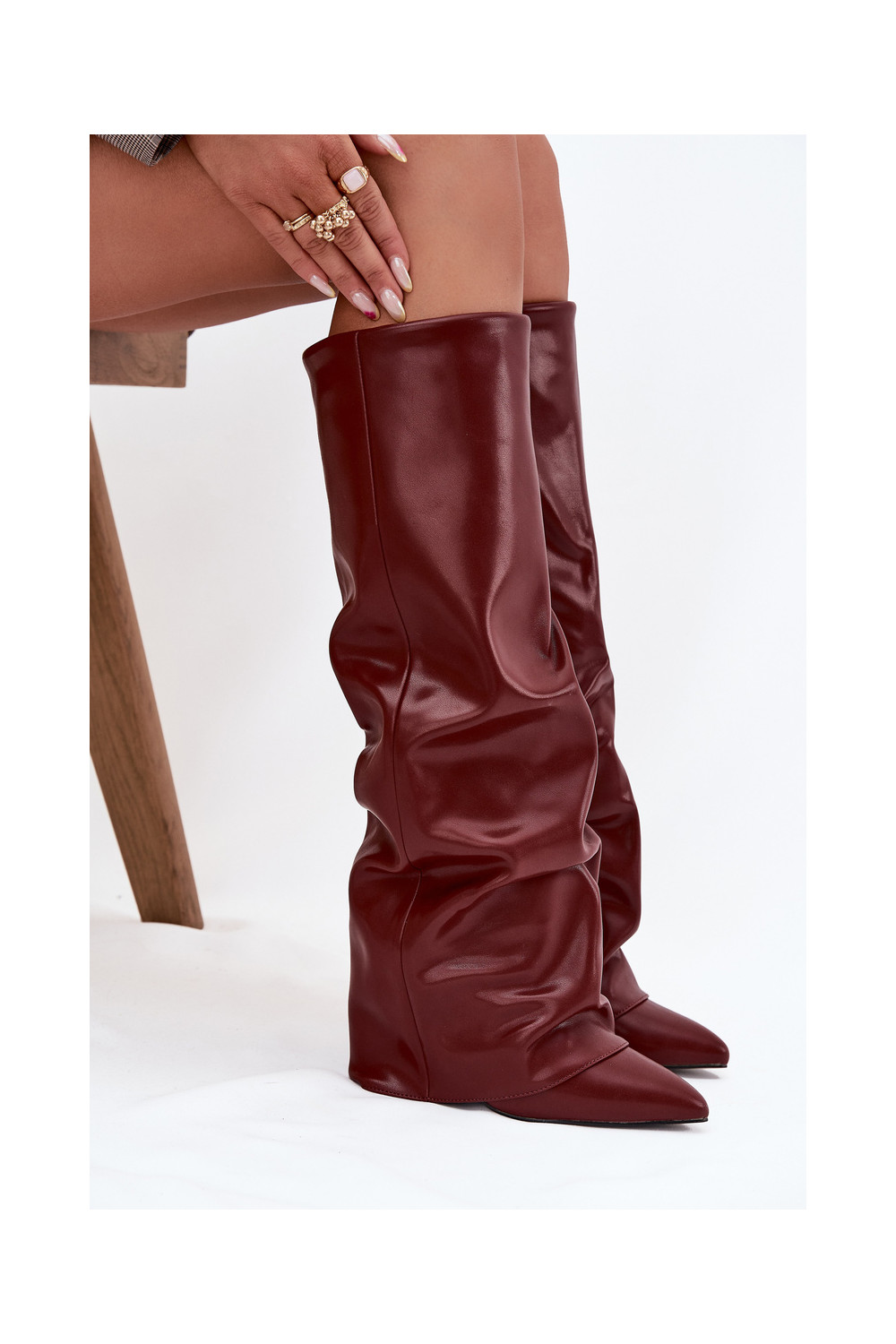 Siltināti sieviešu garie zābaki ar iešūtu šņori un papēžiem, bordo krāsā, Elivira