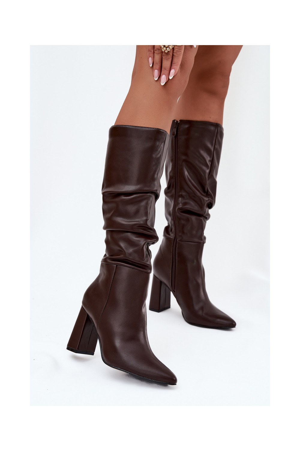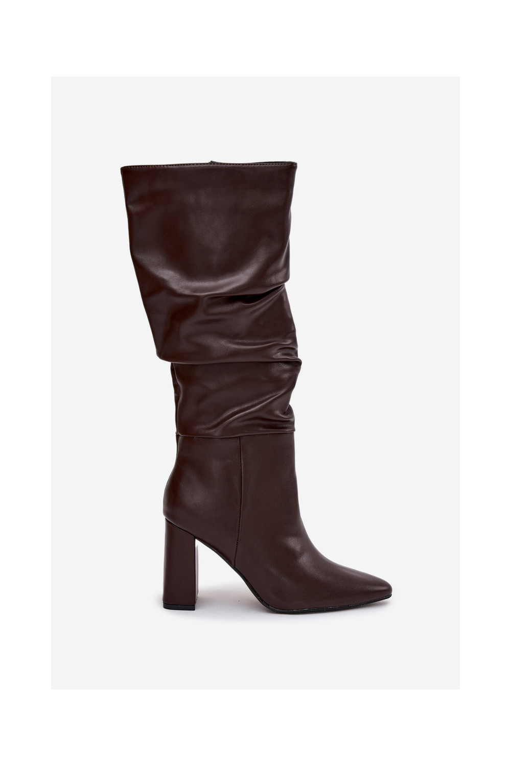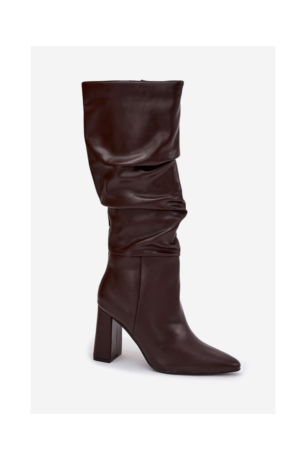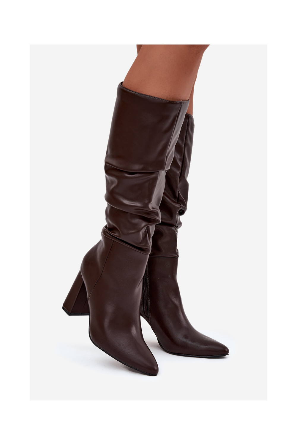 Siltināti sieviešu garie zābaki ar papēžiem un krokām šokolādes krāsā "Dariane"