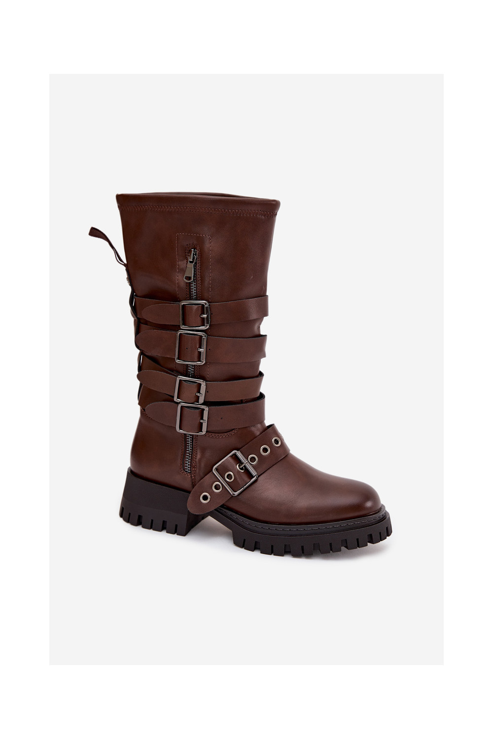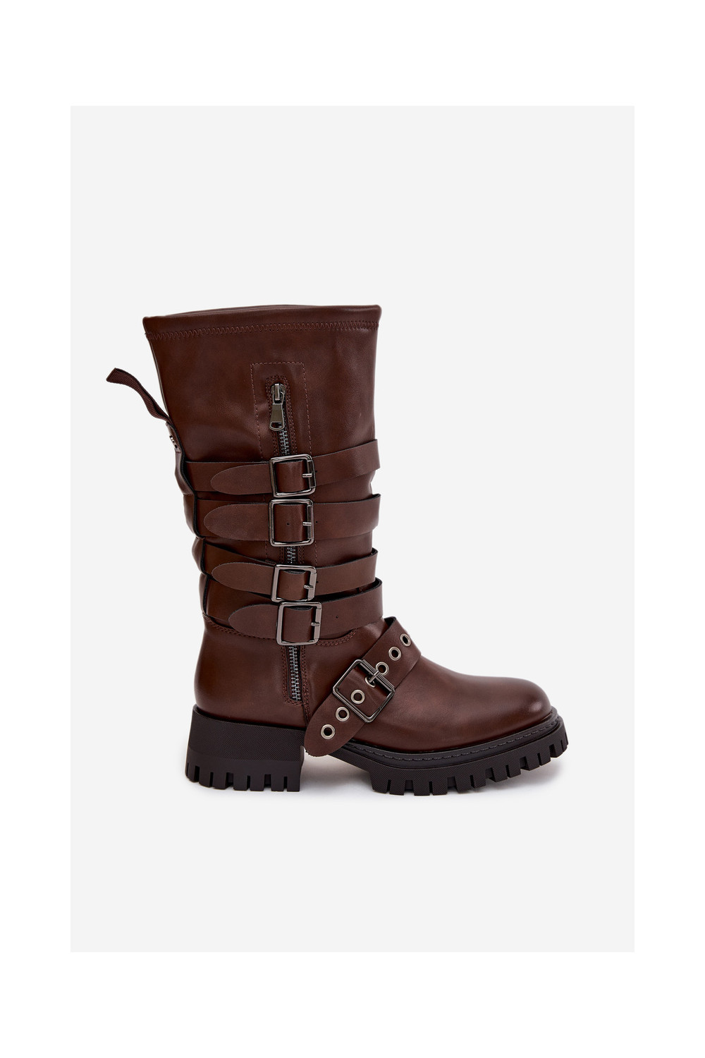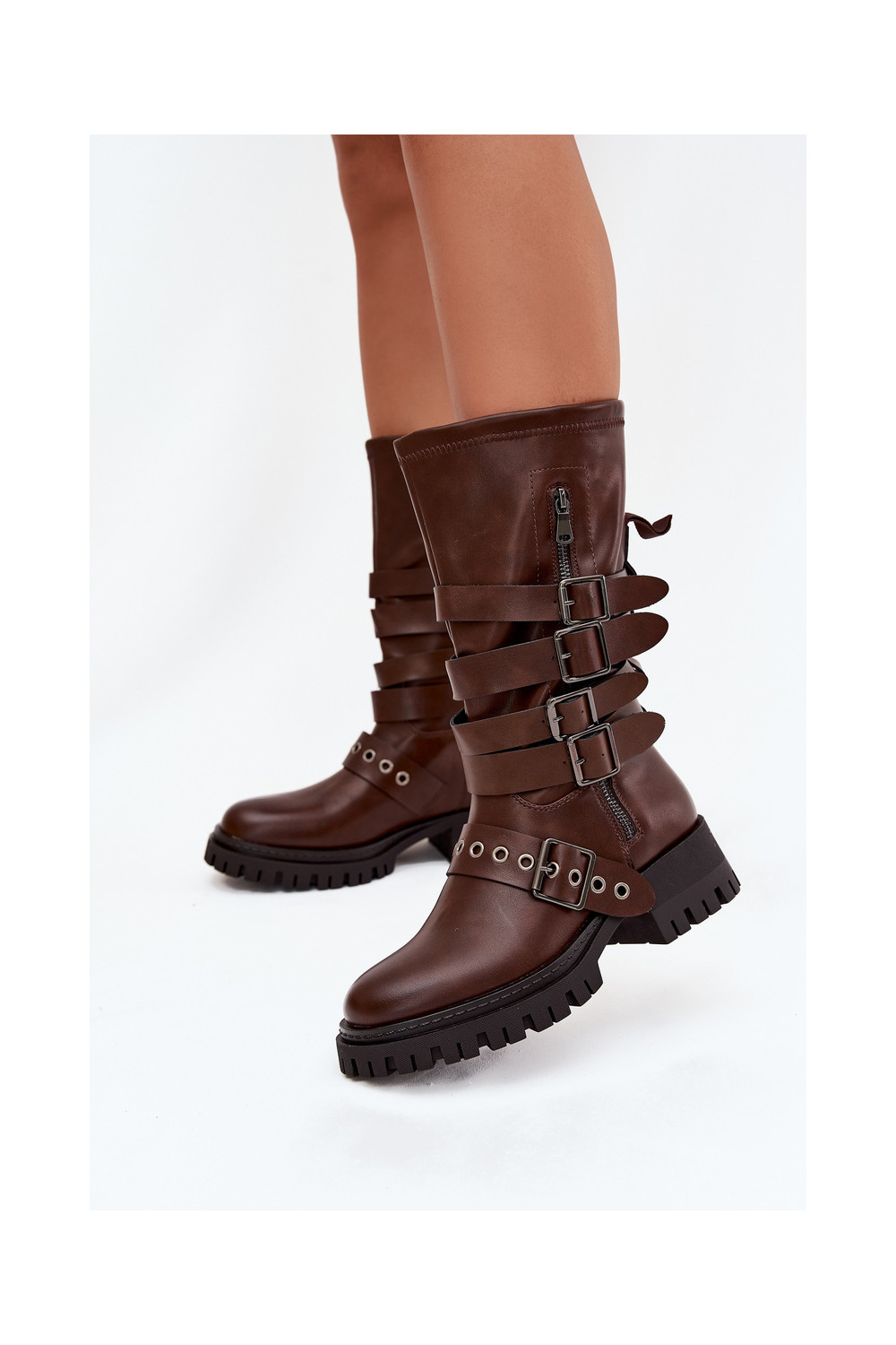 Brūni krāsas siltināti sieviešu garie zābaki ar siksniņām un sprādzēm „Ivaline"