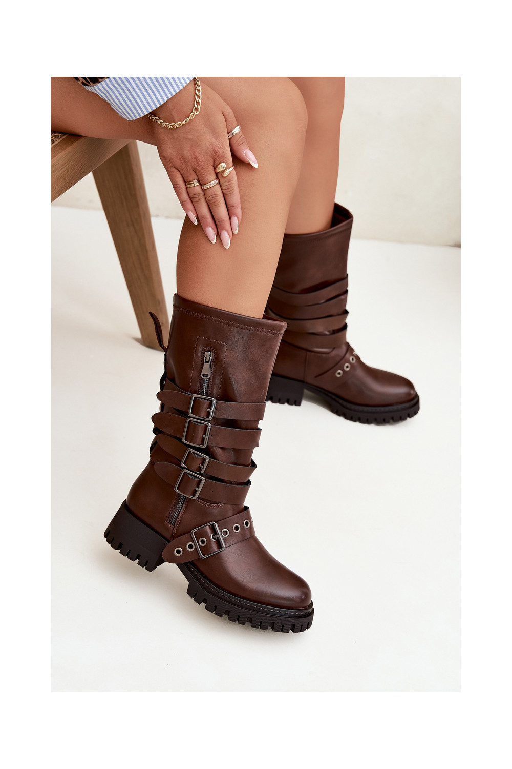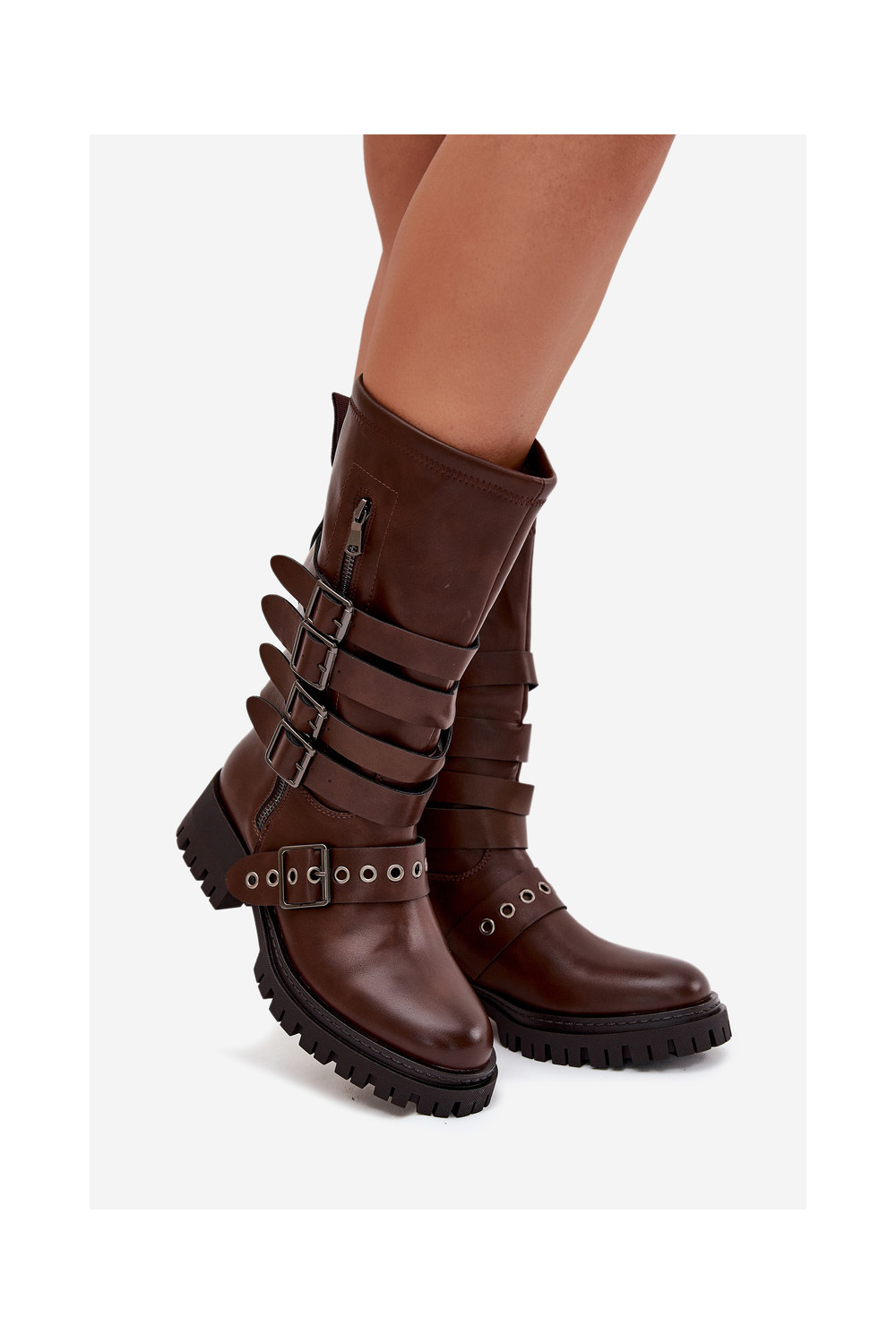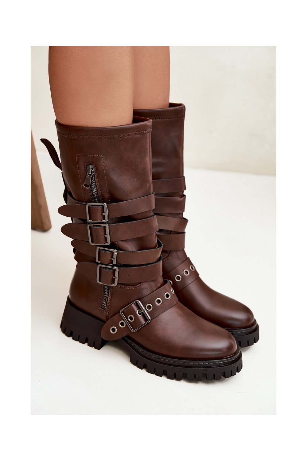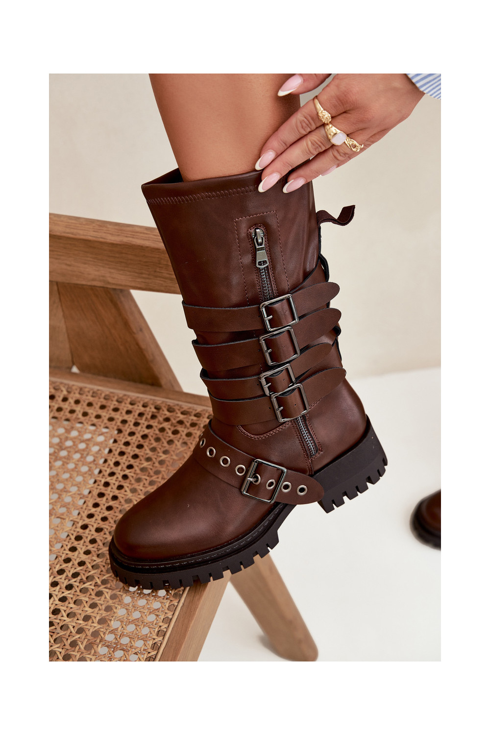 Brūni krāsas siltināti sieviešu garie zābaki ar siksniņām un sprādzēm „Ivaline"