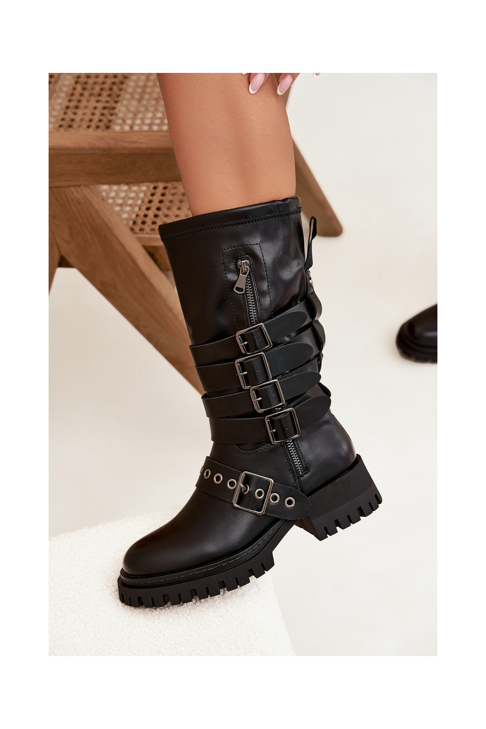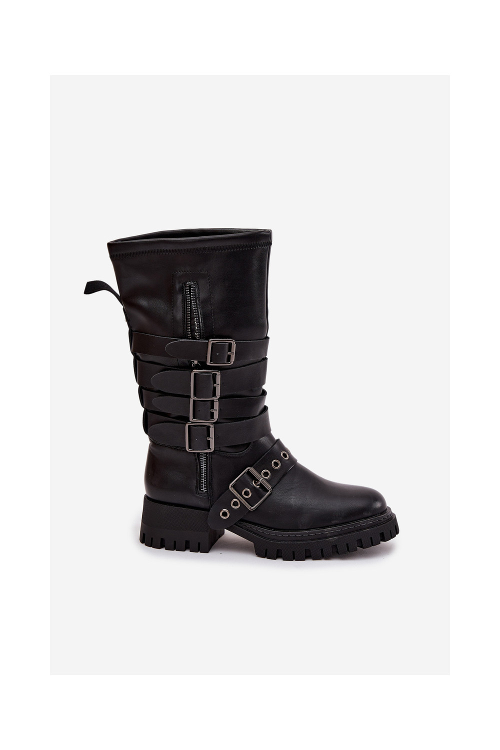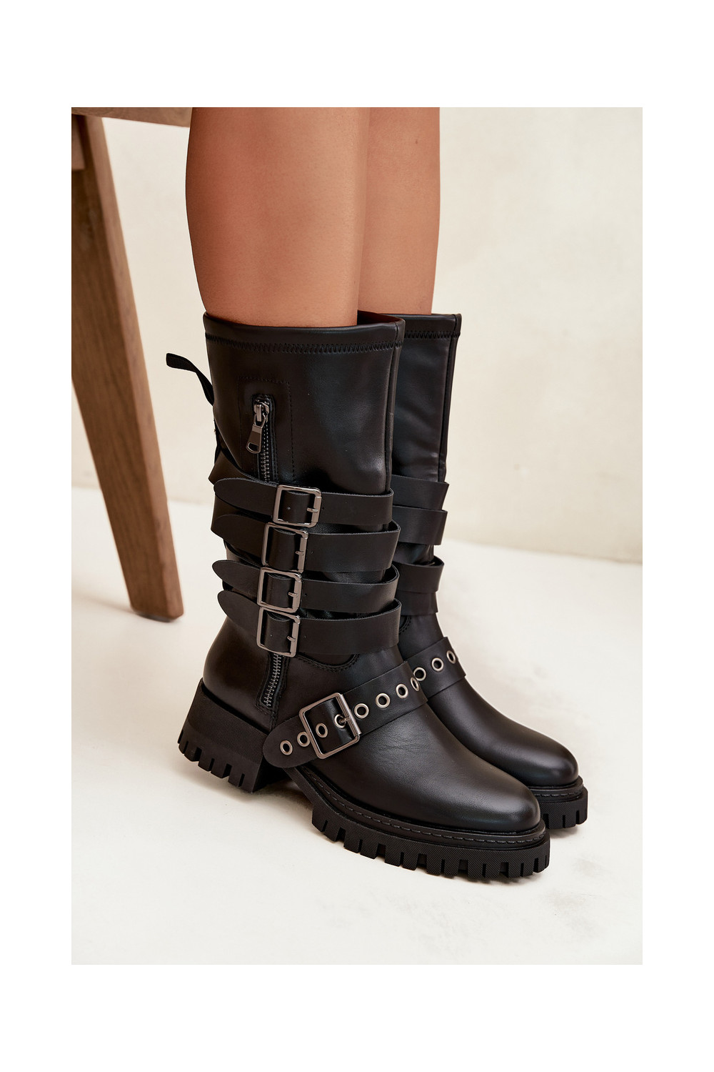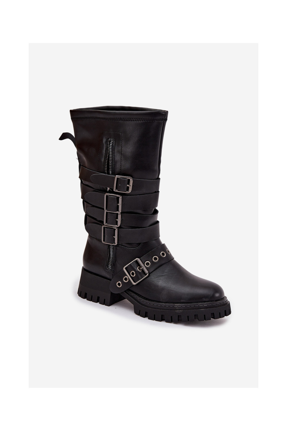 Melni krāsas siltināti sieviešu garie zābaki ar siksniņām un sprādzēm „Ivaline"