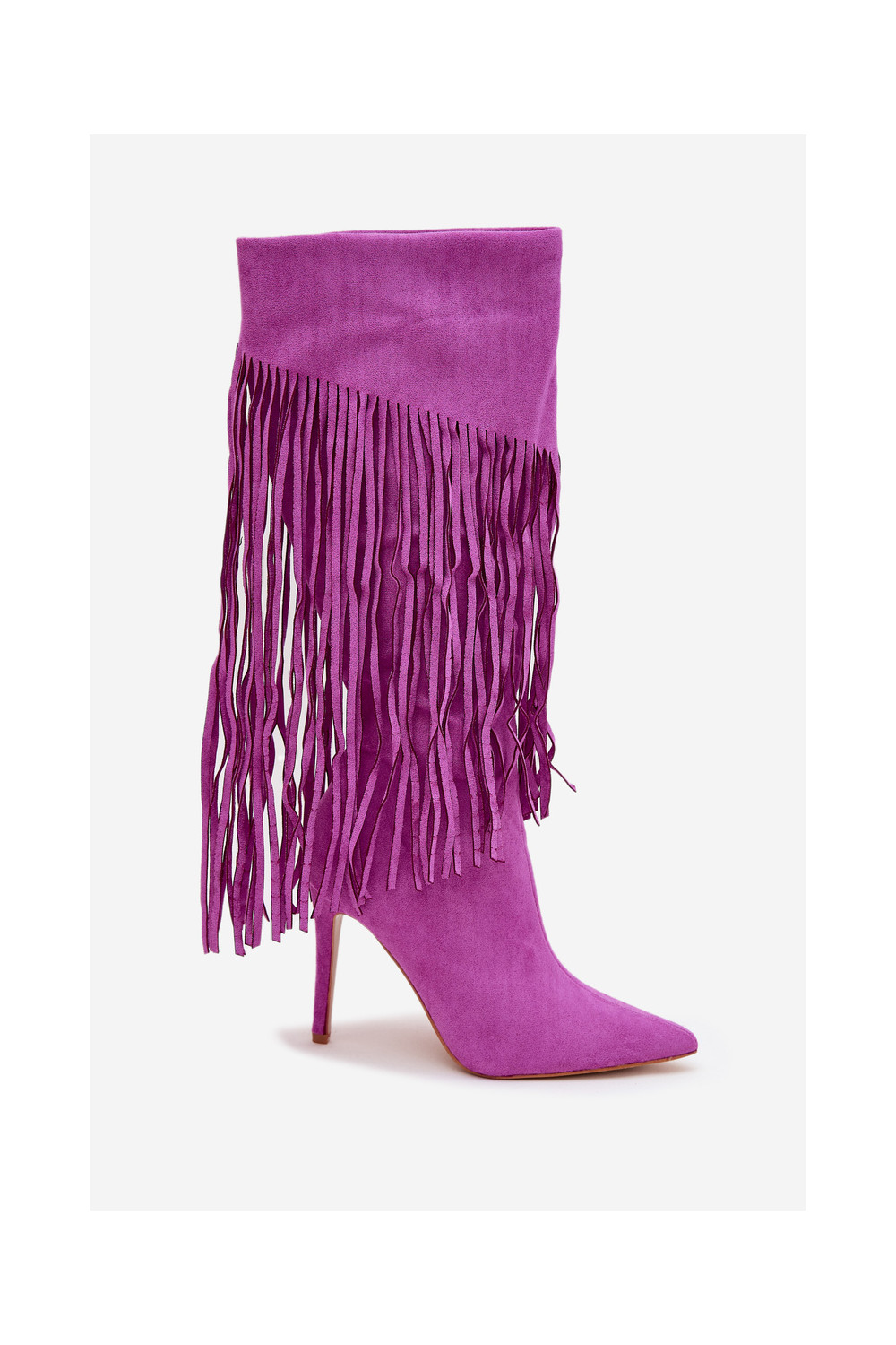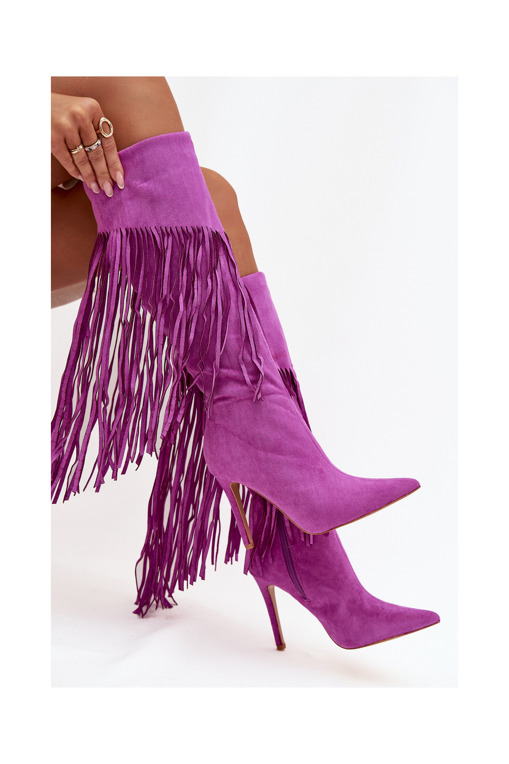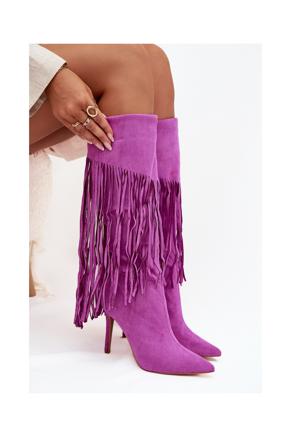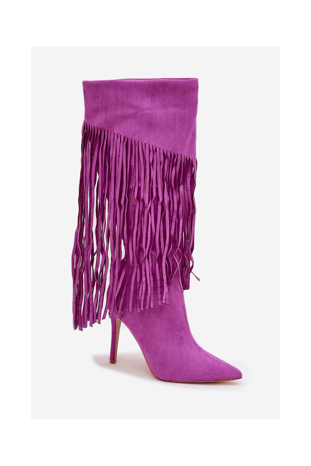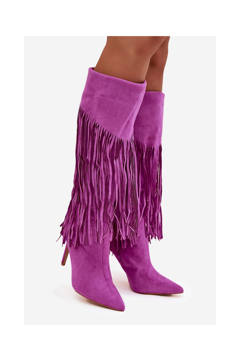 Sieviešu garie zābaki ar plāniem papēžiem un pūkām violetā krāsā Isalune