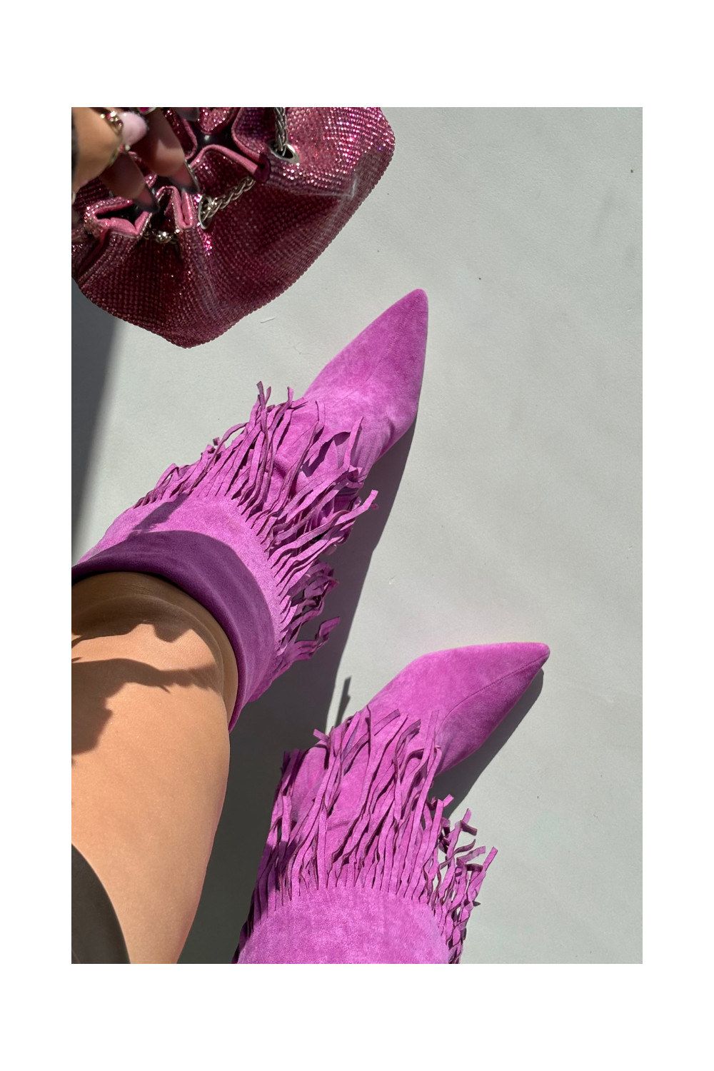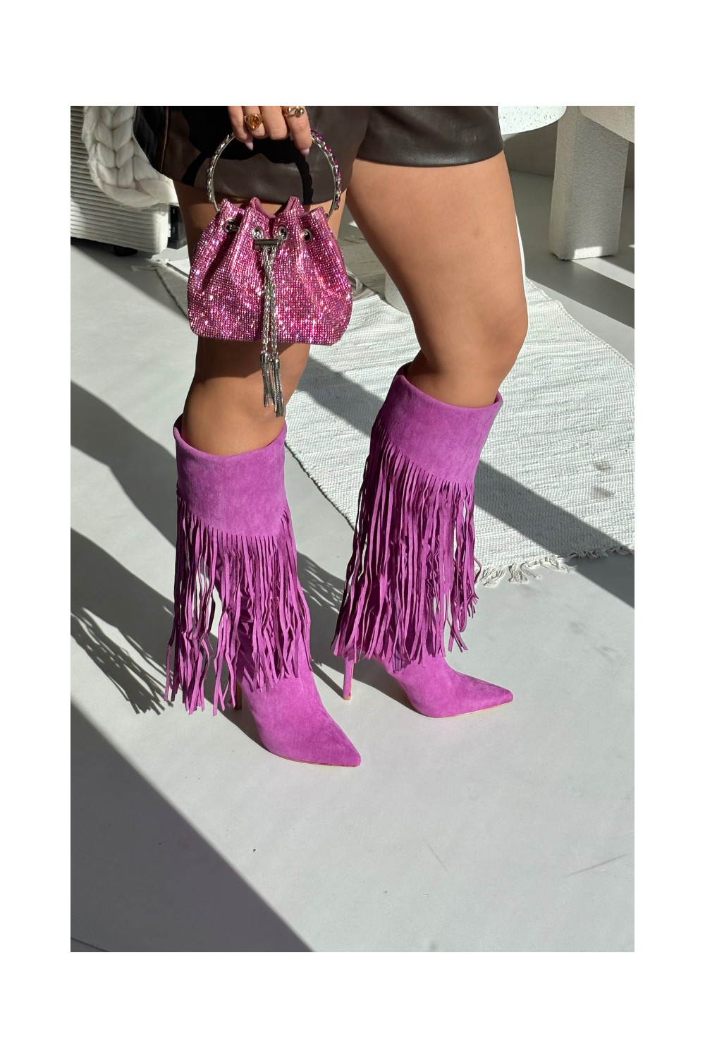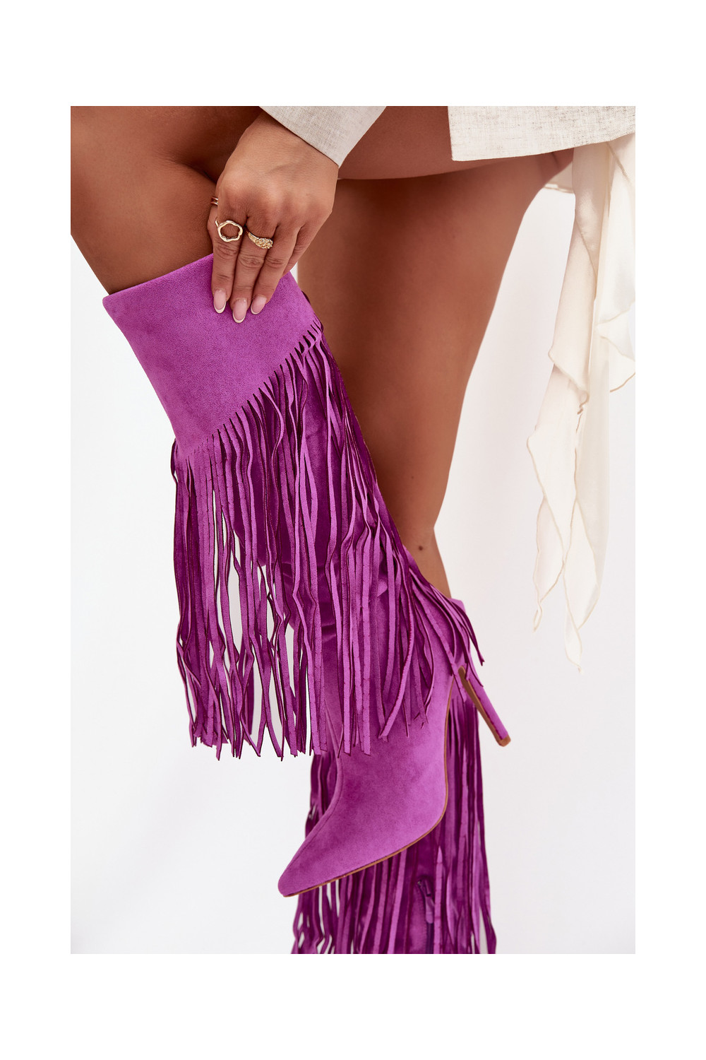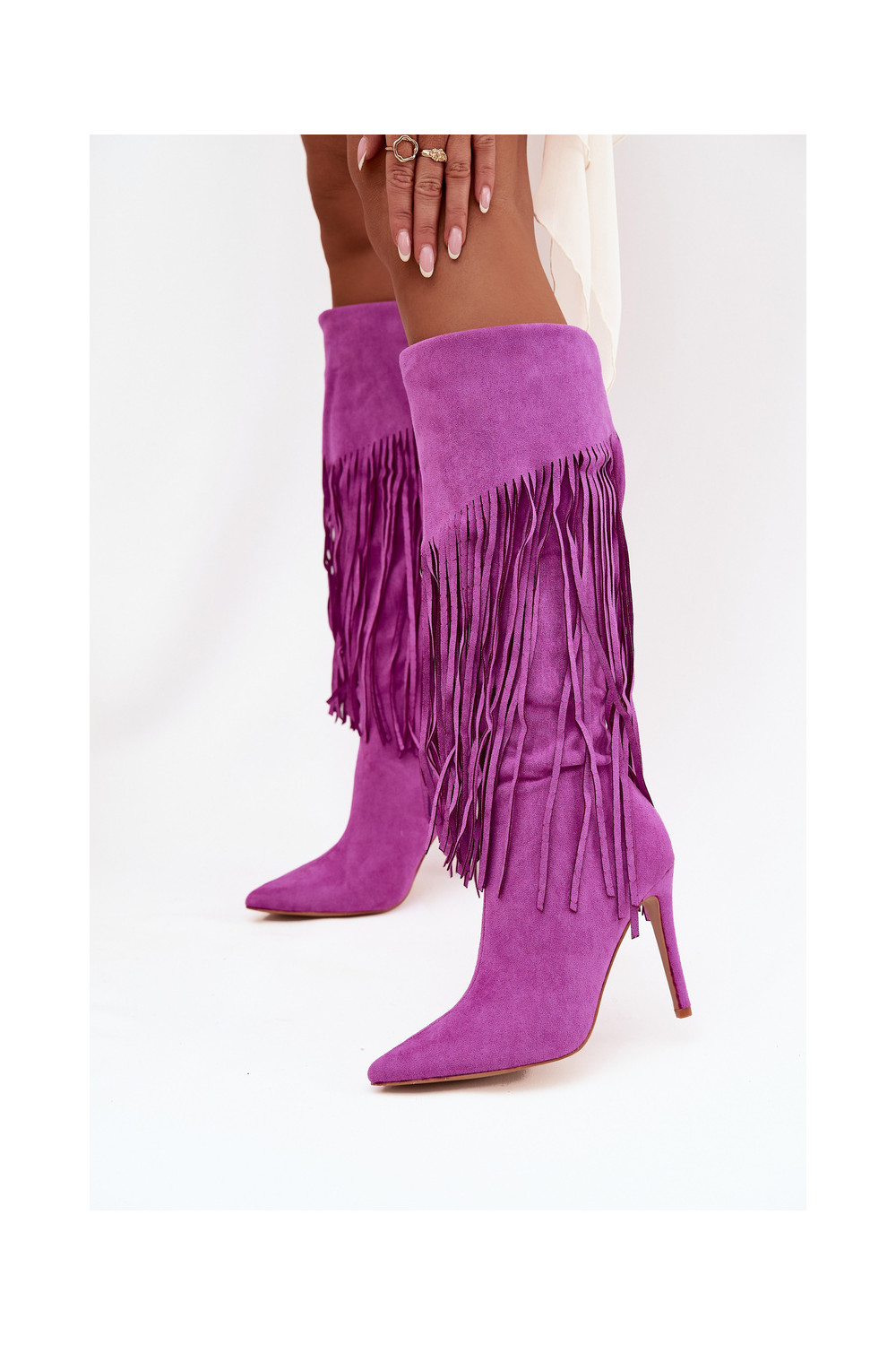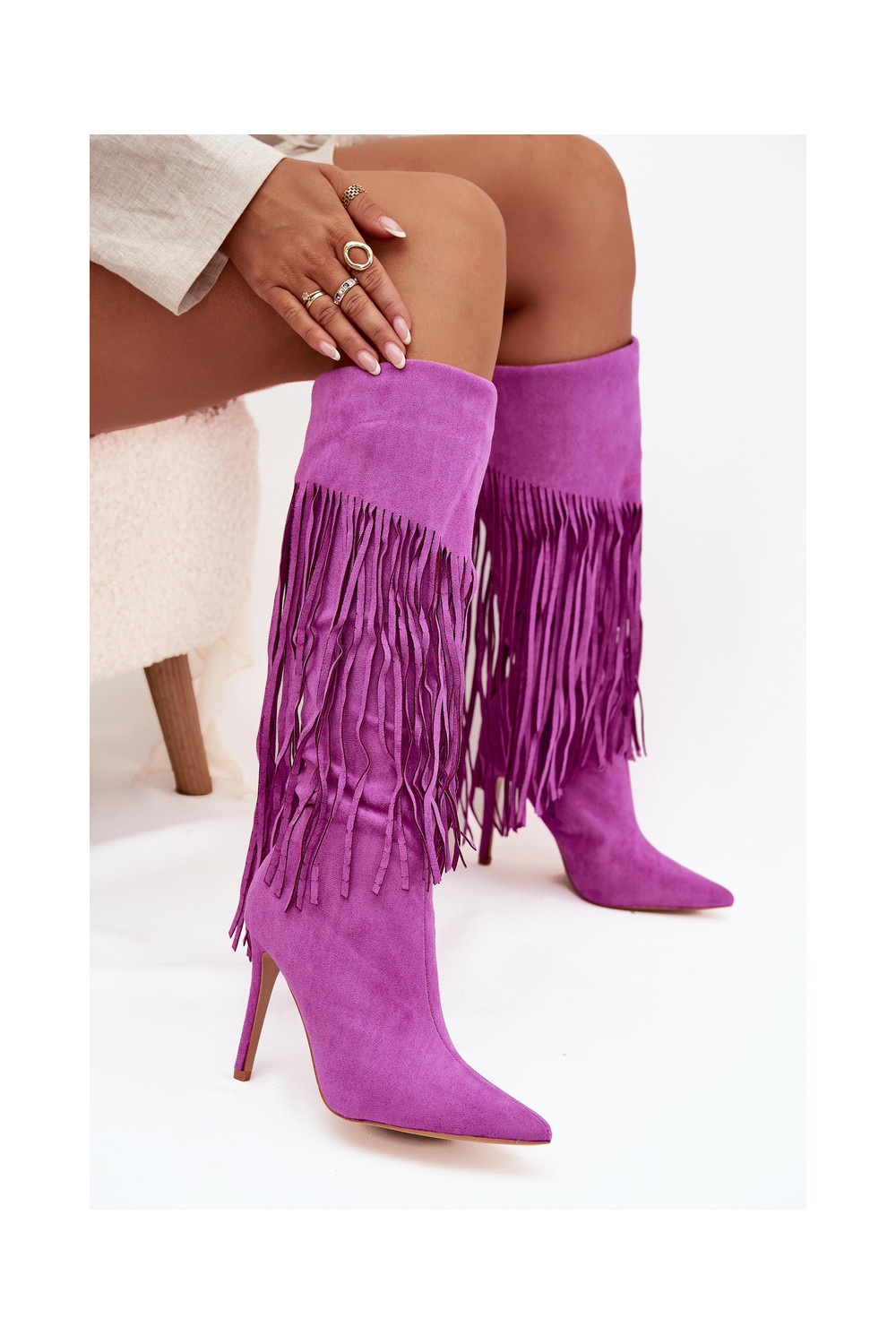 Sieviešu garie zābaki ar plāniem papēžiem un pūkām violetā krāsā Isalune