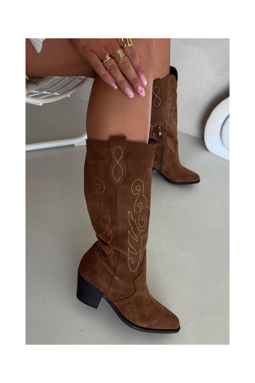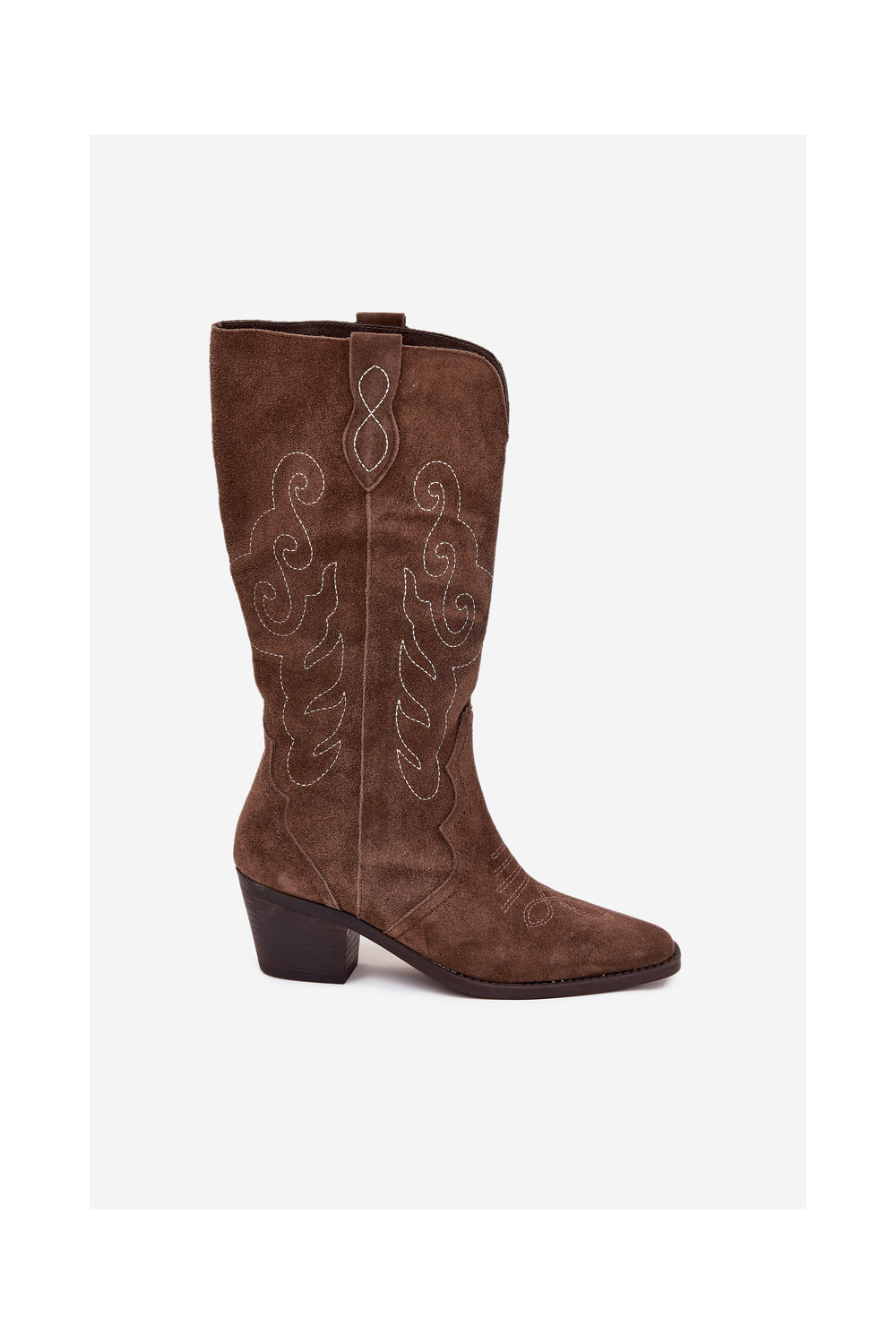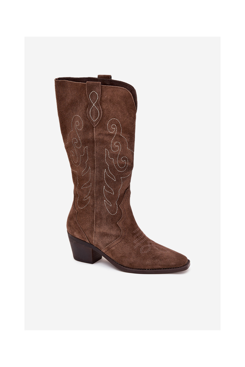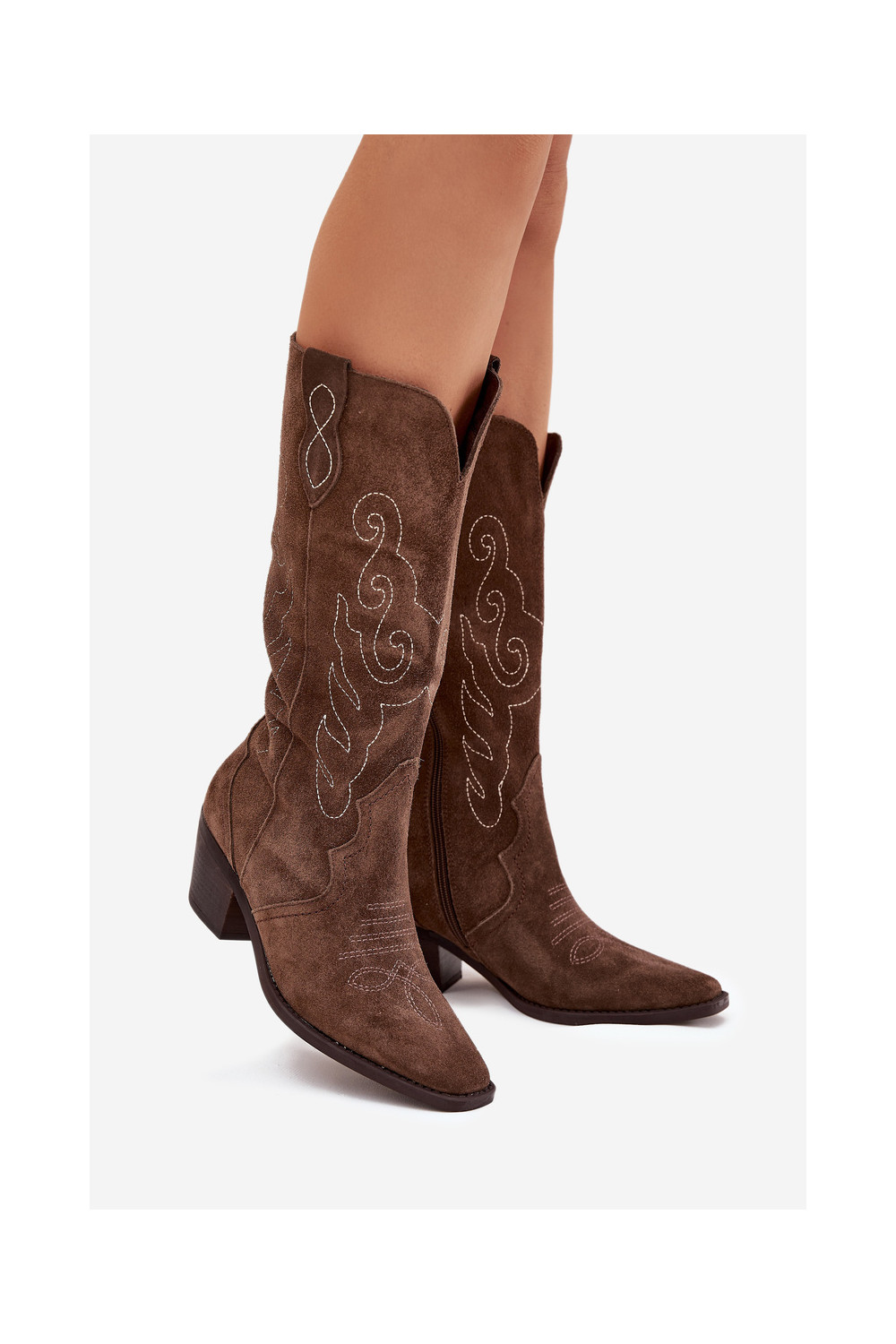 Mākslīgās zamšas garie sieviešu zābaki ar papēžiem, brūni, Karira