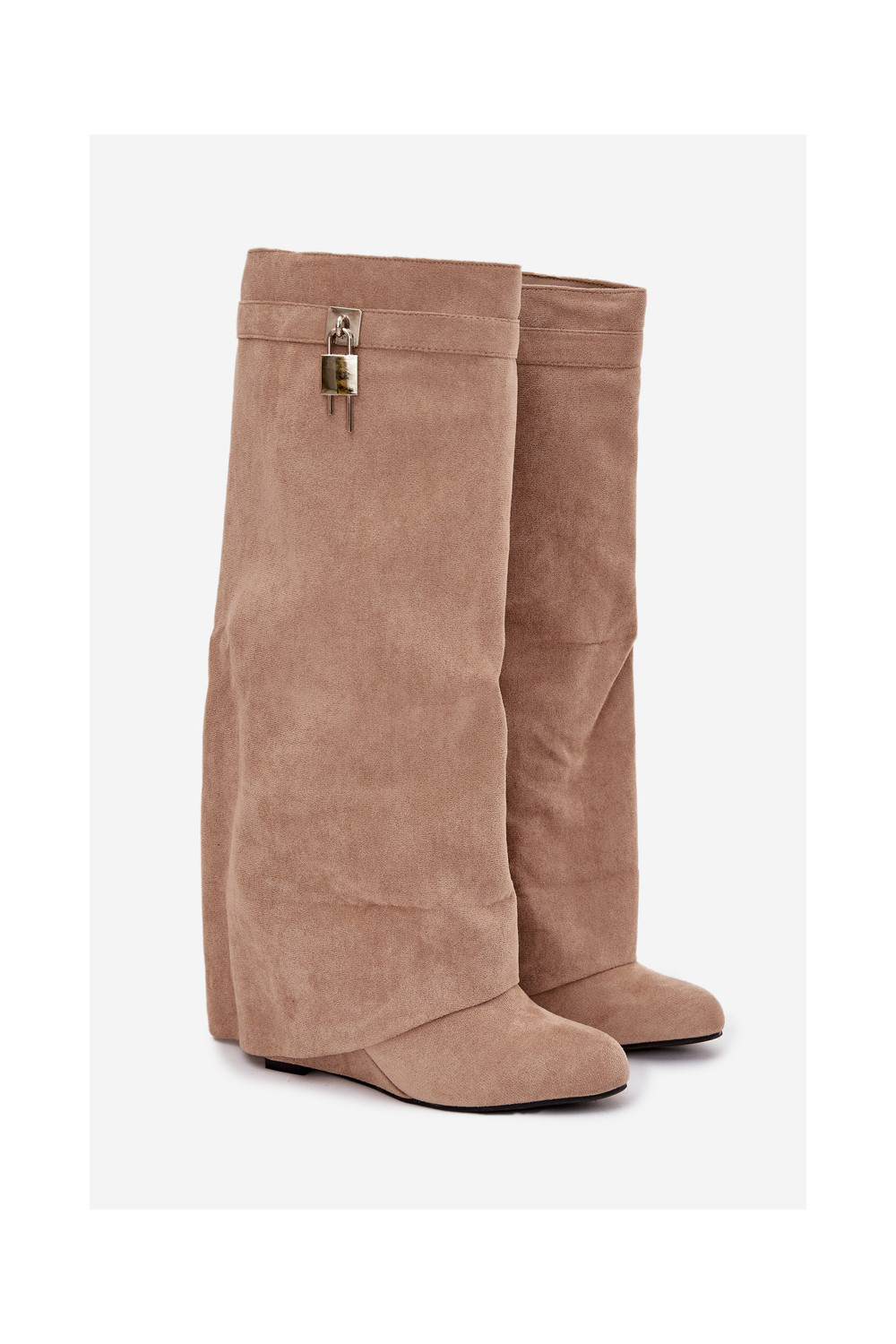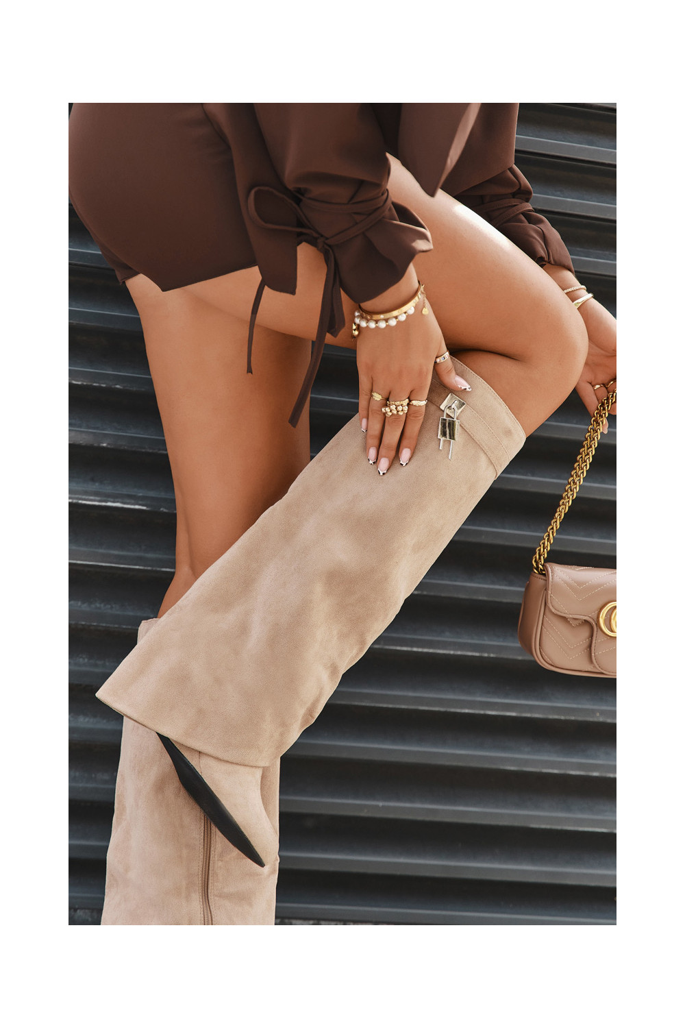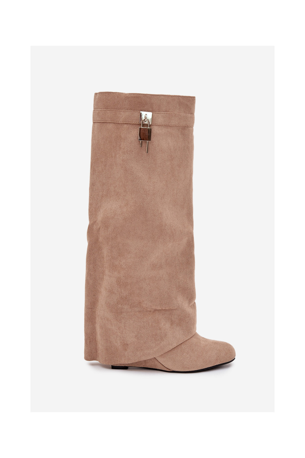 Sieviešu garās zābaki uz platformas ar jostām un sudraba detaļām, smilšu krāsā Korivelle