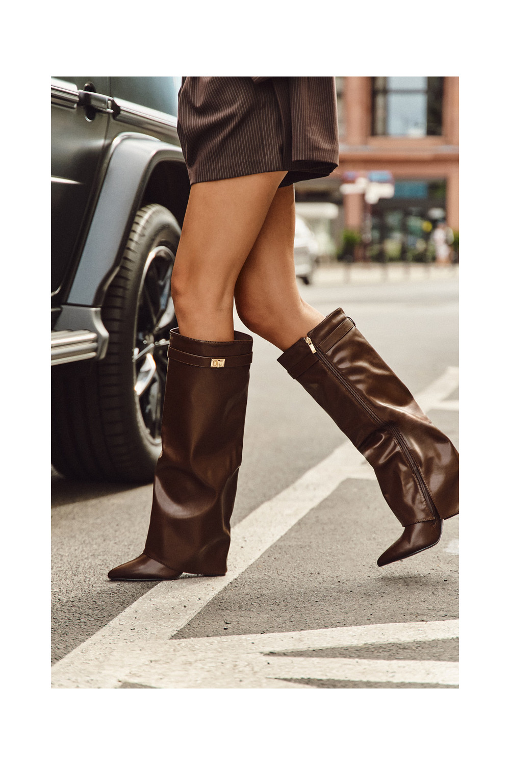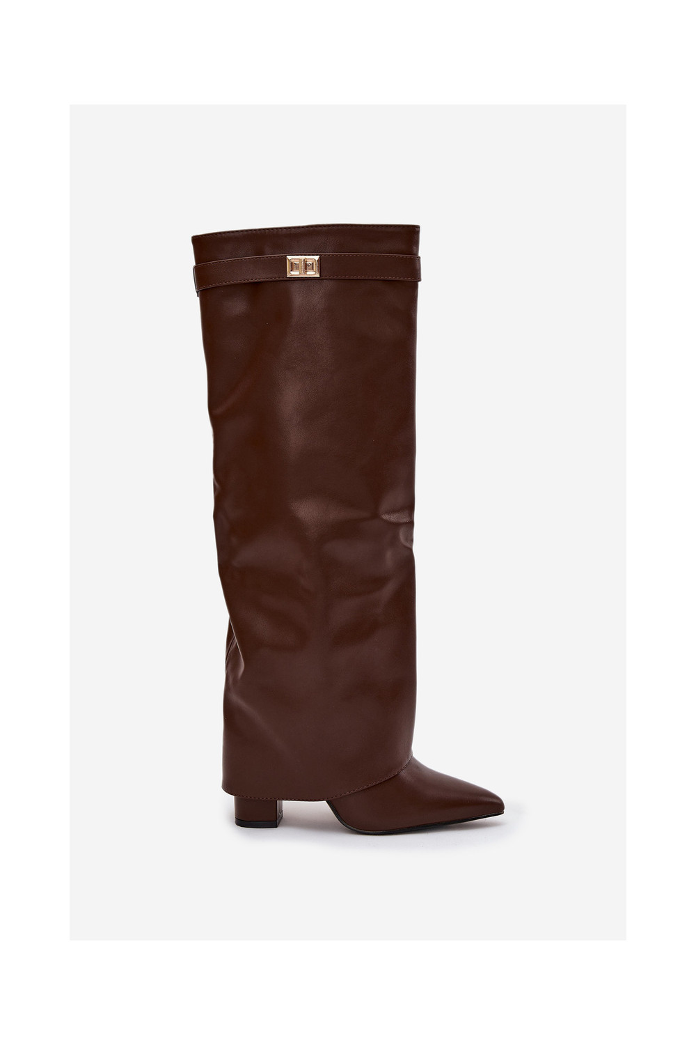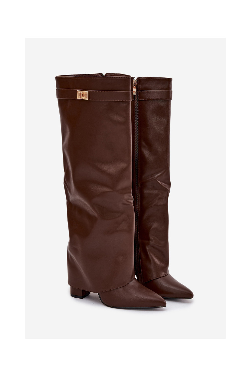 Sieviešu garie zābaki no mākslīgās ādas ar savilktu augšu un papēžiem, brūnā krāsā Avamora