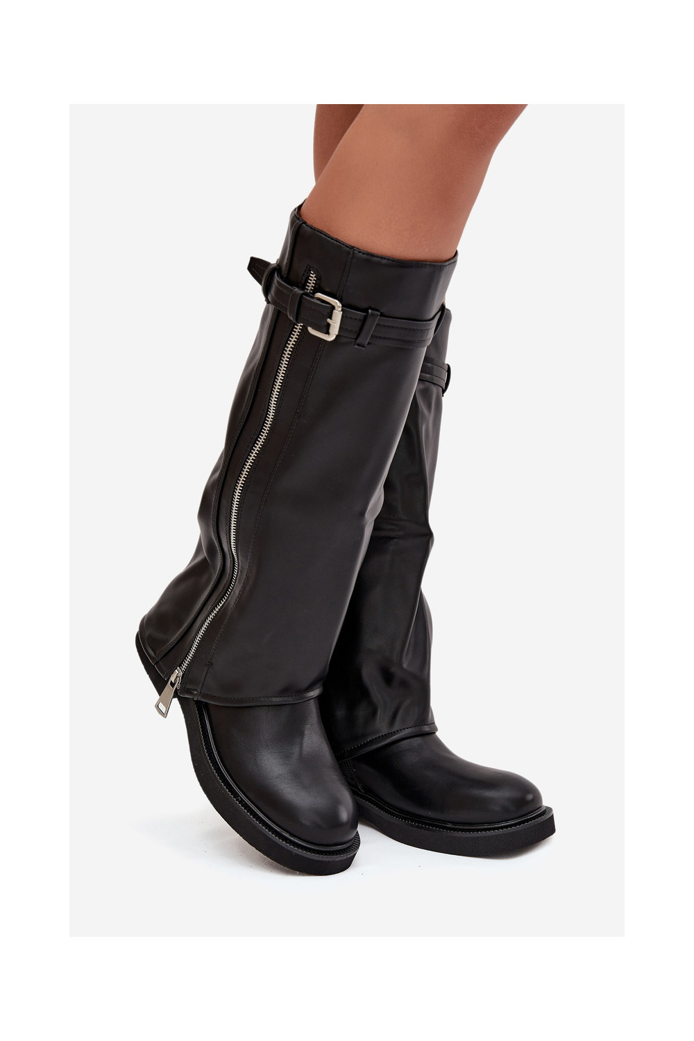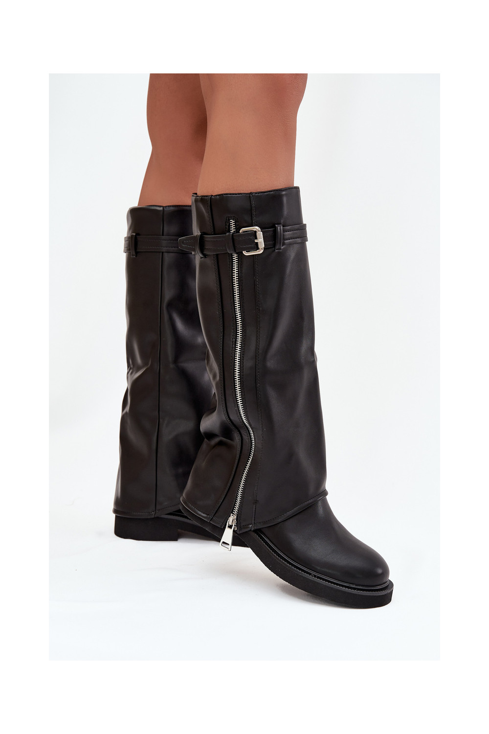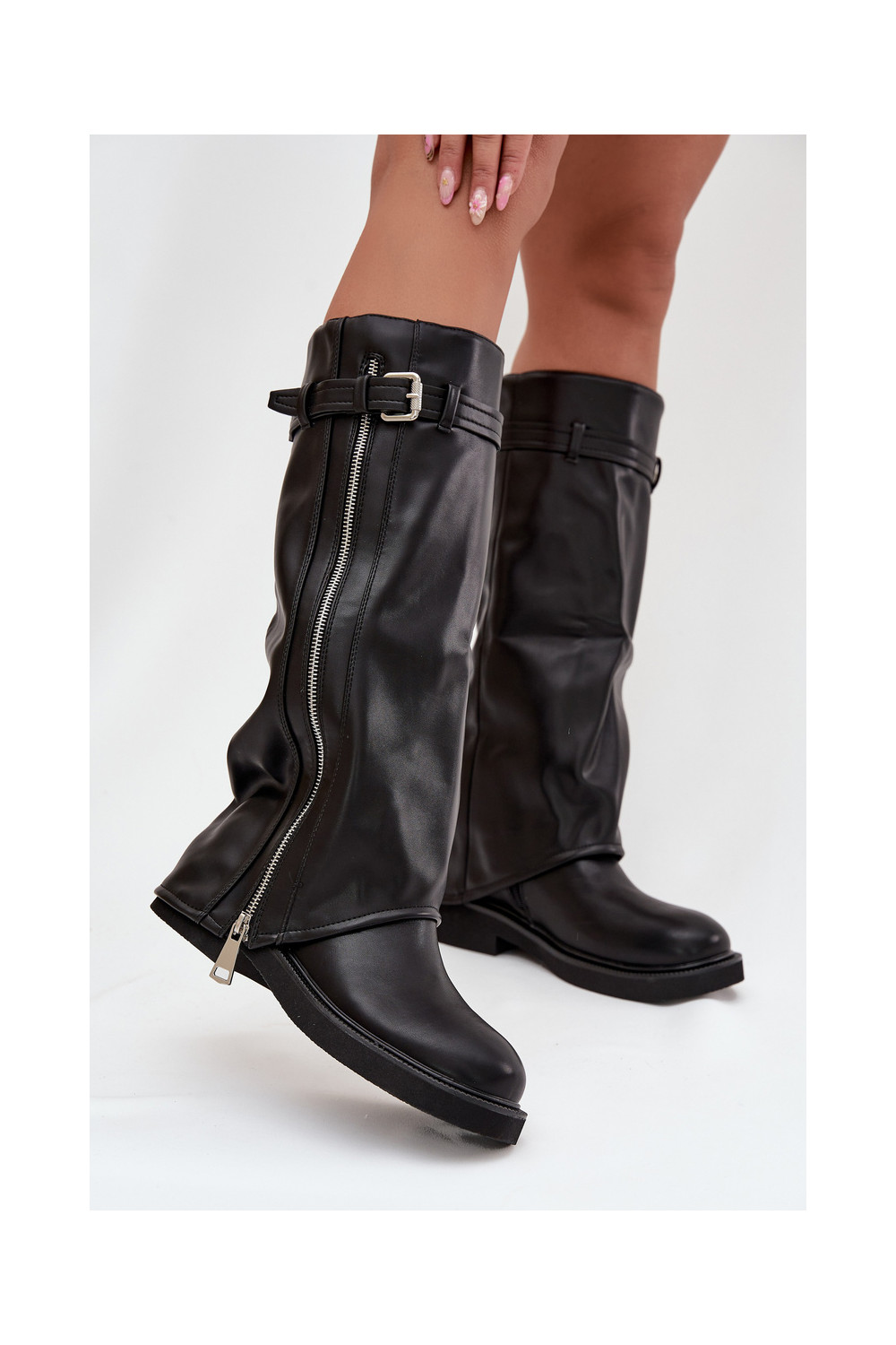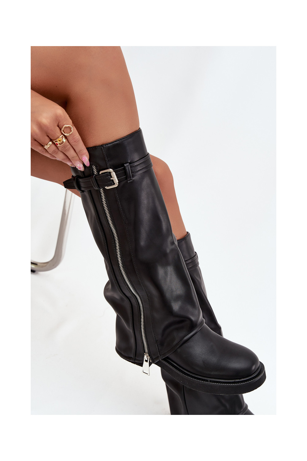 sieviešu garie zābaki Z Wywiniętą Cholewką ar sprādzēm I Sudraba krāsasm Zamkiem siltināti Melns Bressa