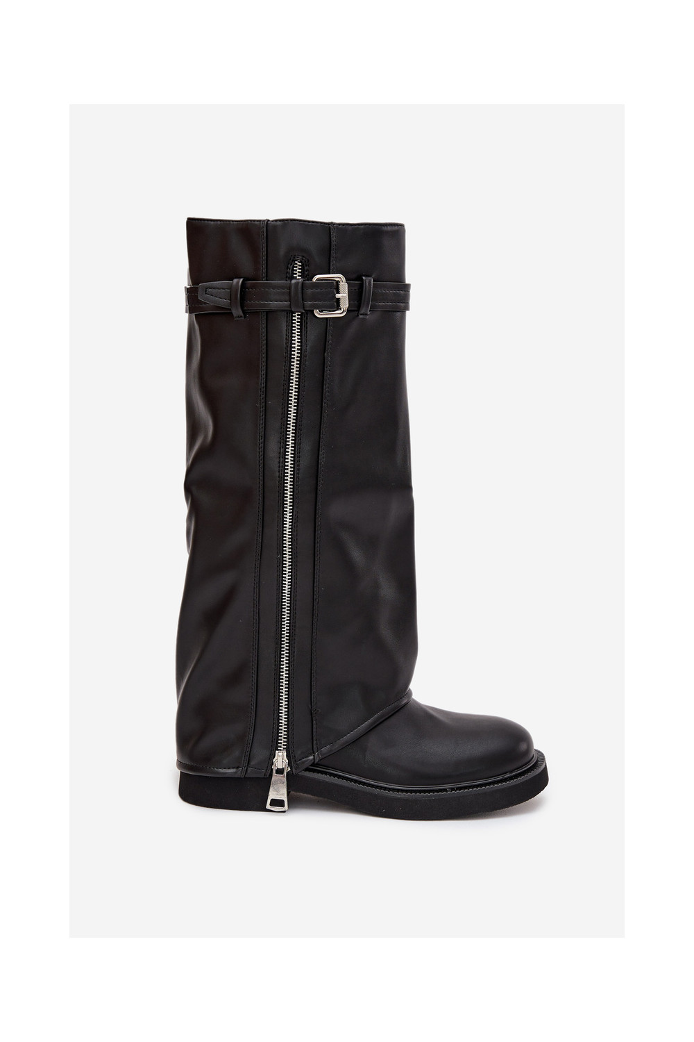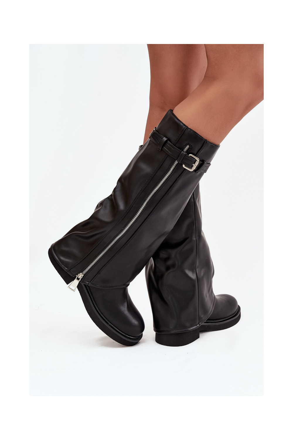 Sieviešu garie zābaki ar paplatinātu zoli, sprādzēm un sudraba rāvējslēdzēju, siltināti, melnā krāsā Bressa