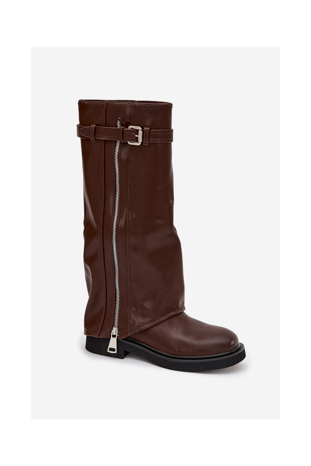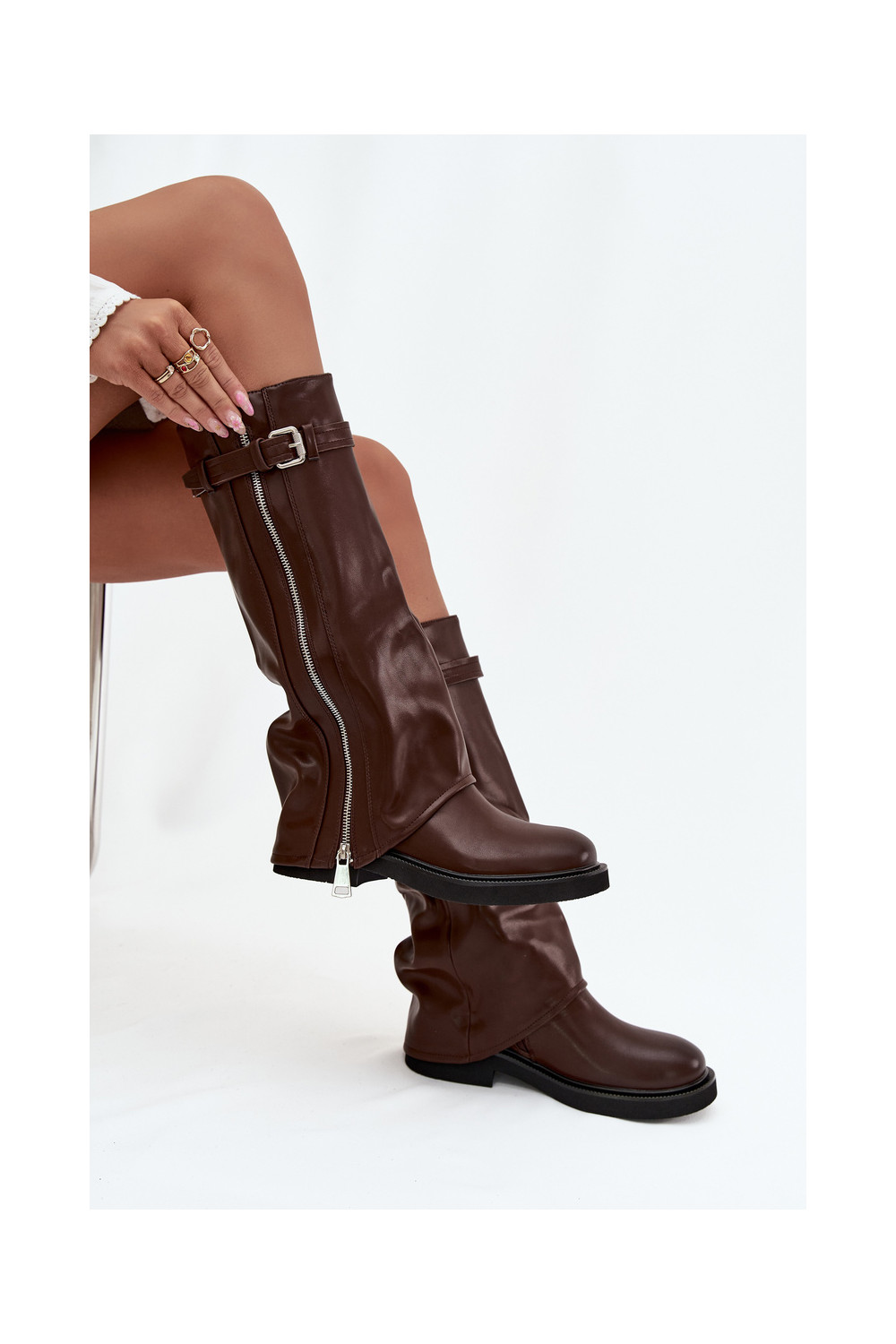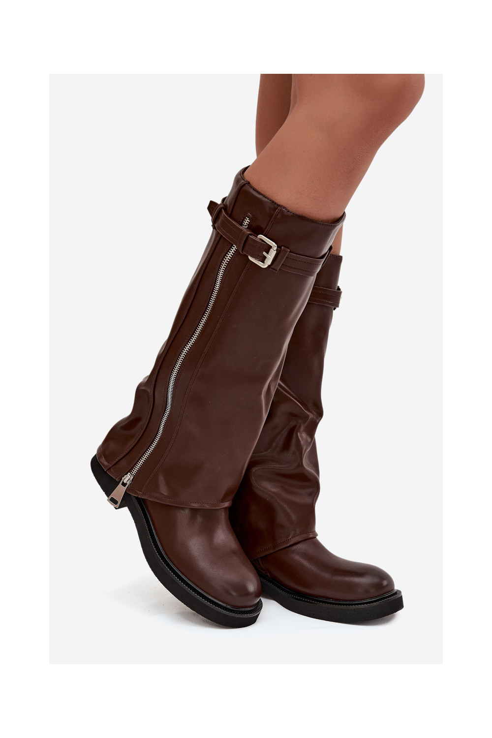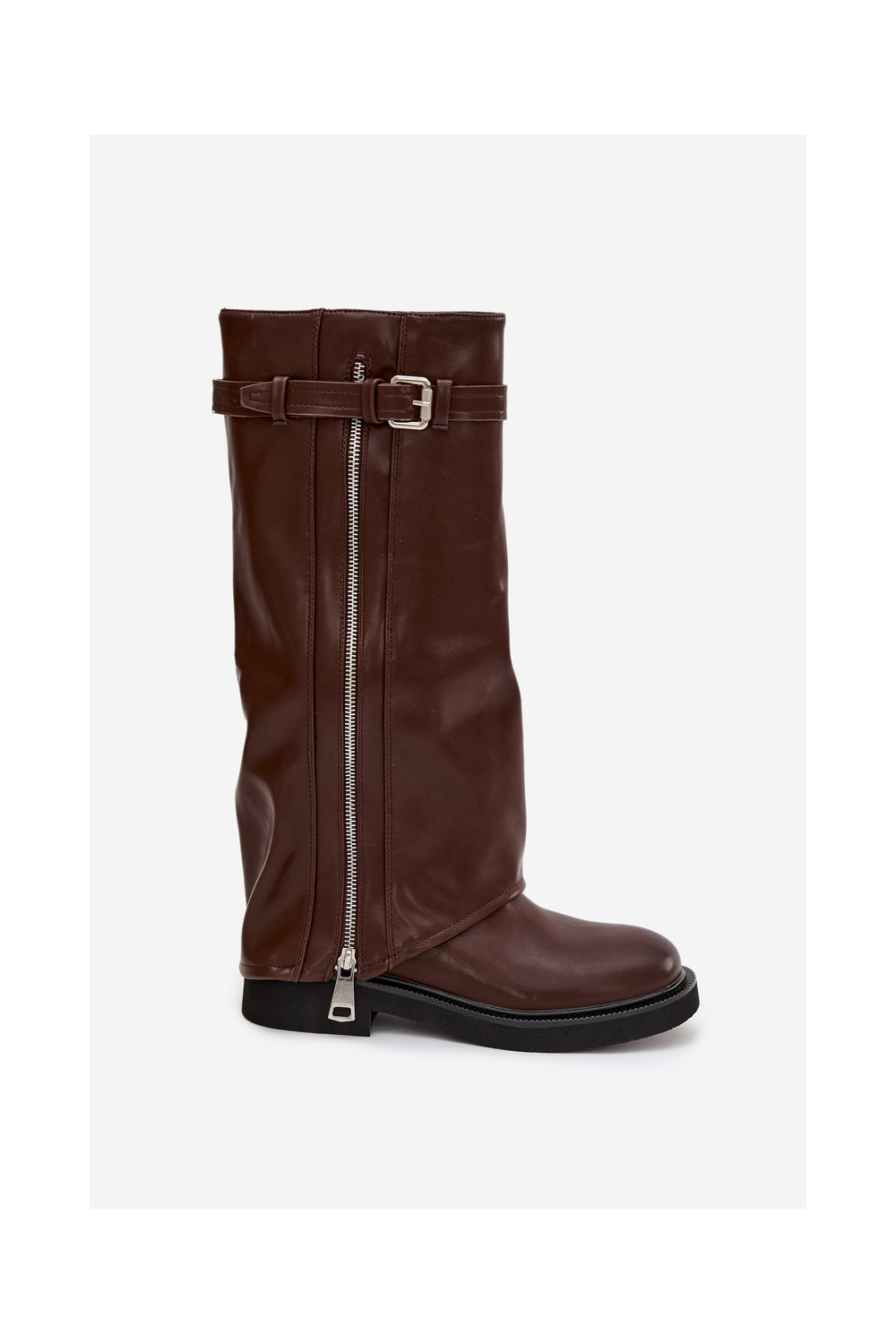 Sieviešu garie zābaki ar paplatinātu zoli, sprādzēm un sudraba rāvējslēdzēju, siltināti, brūnā krāsā Bressa