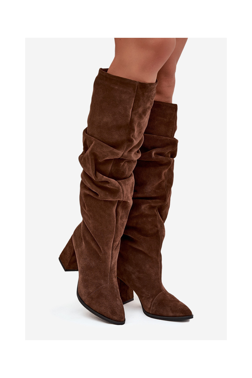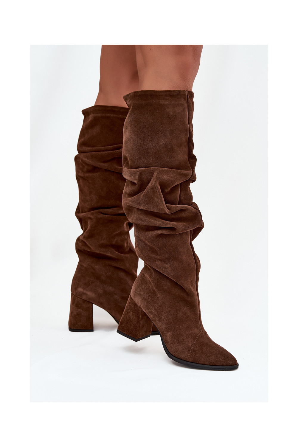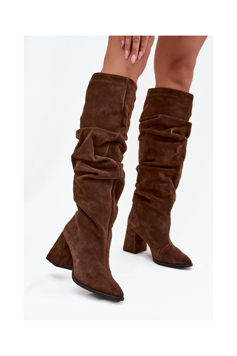 krunkainas dabīgās zamšādas garie zābaki ar papēžiem siltināti Zazoo 4228 brūnā krāsā