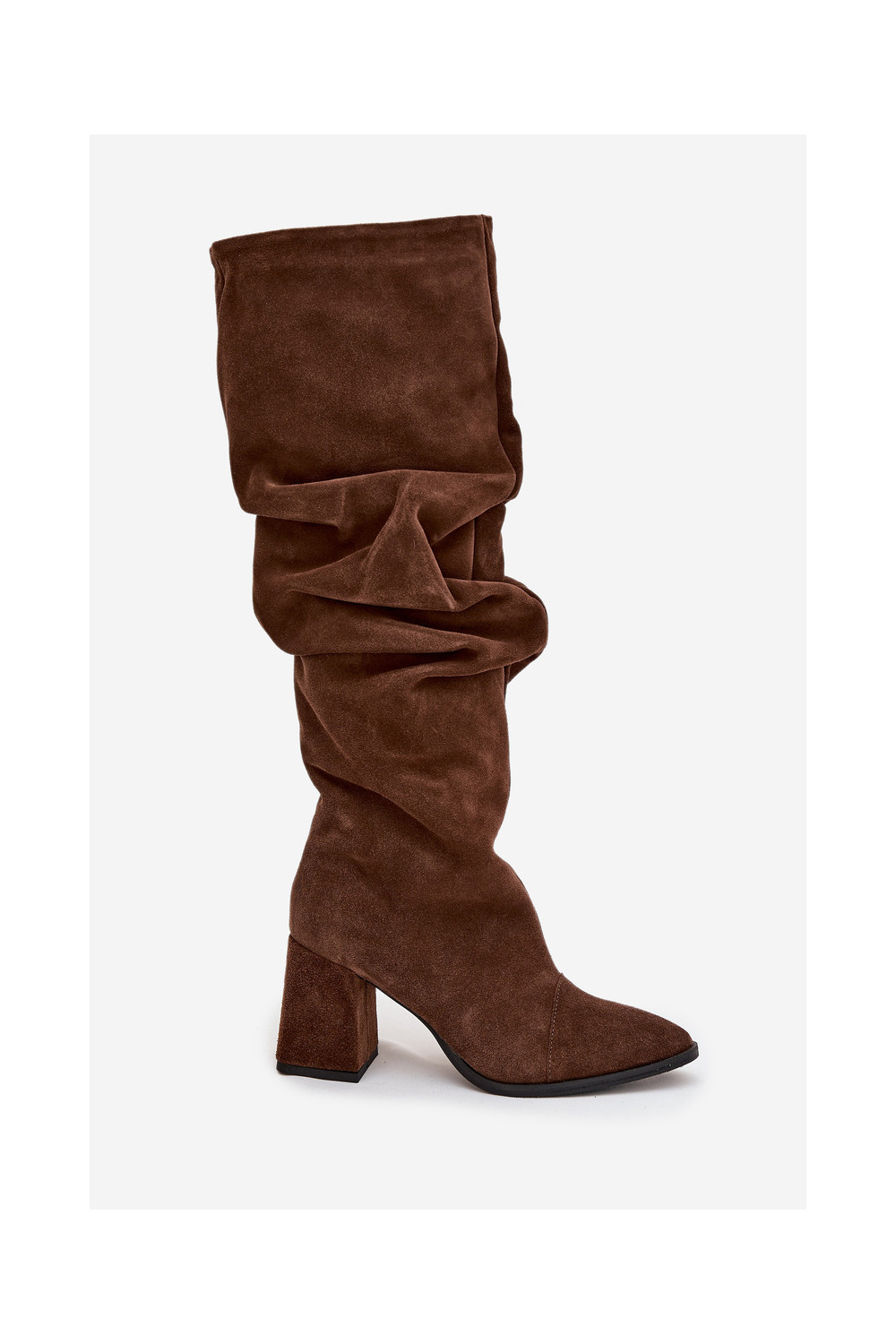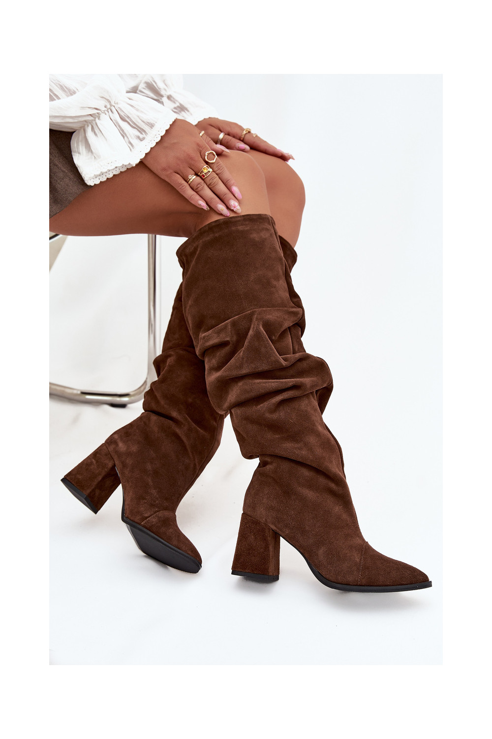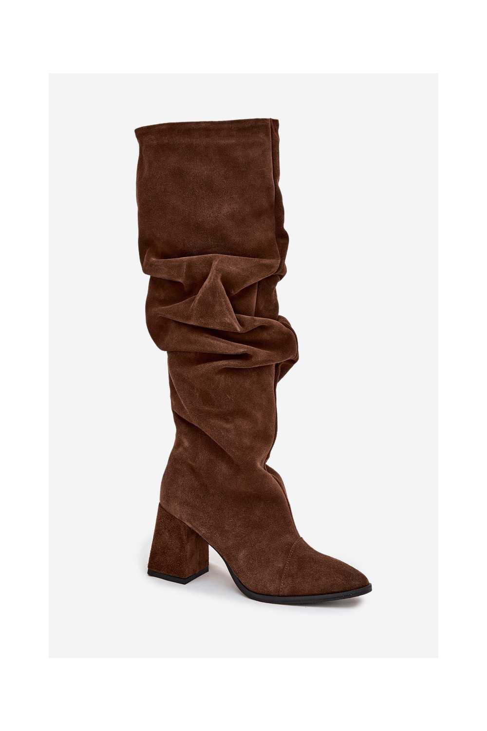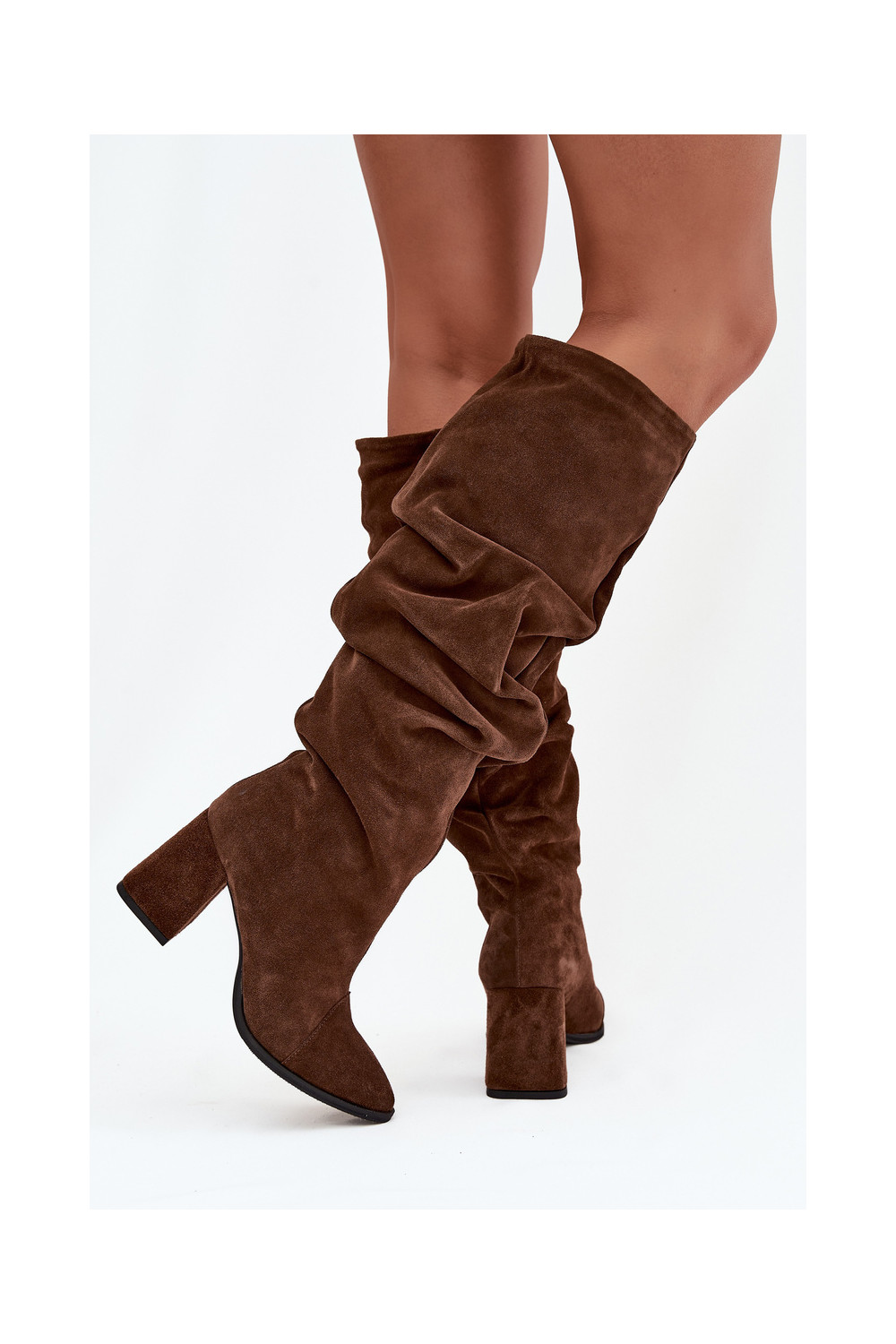 krunkainas dabīgās zamšādas garie zābaki ar papēžiem siltināti Zazoo 4228 brūnā krāsā