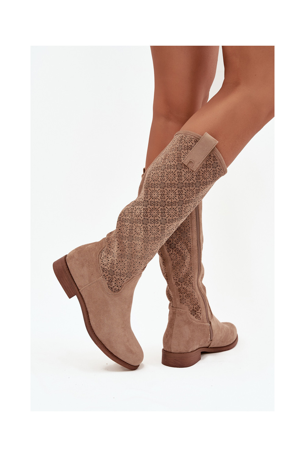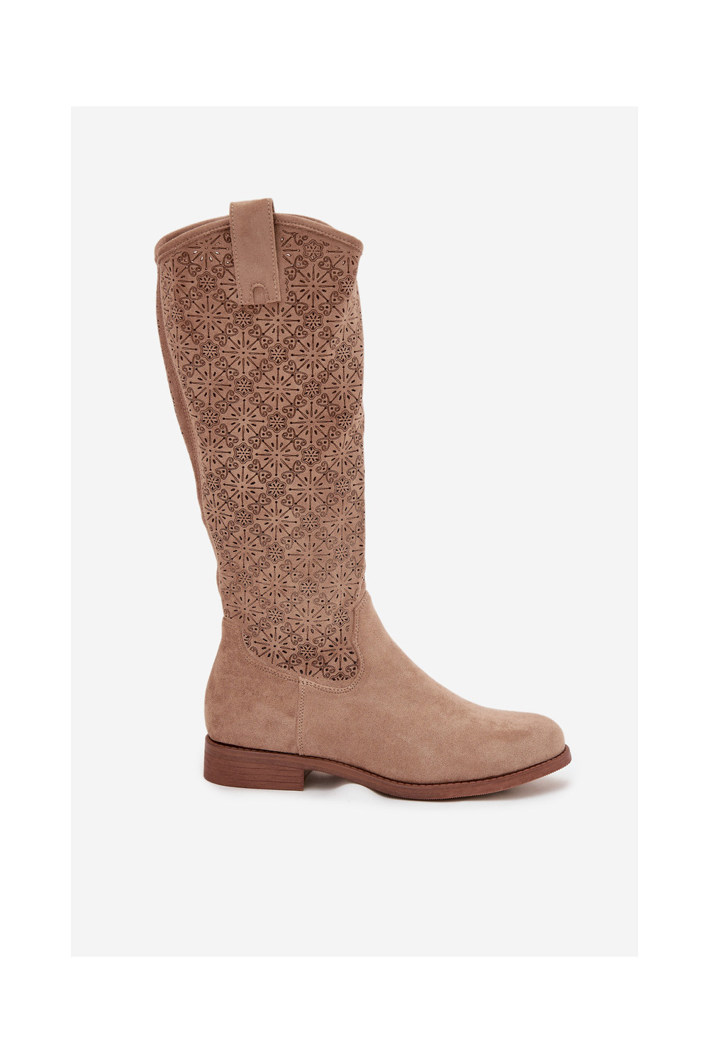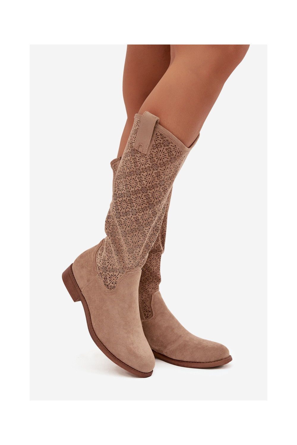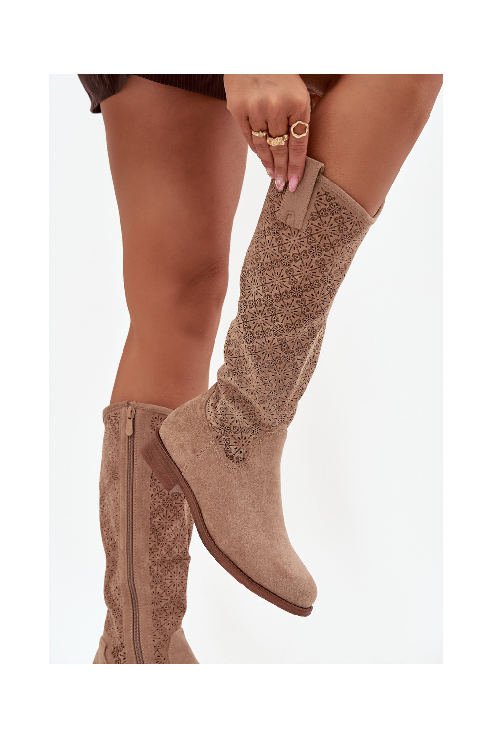 Sieviešu augstie zābaki ar ažūra elementiem un platām papēžiem S.Barski HY52-534 smilšu krāsā