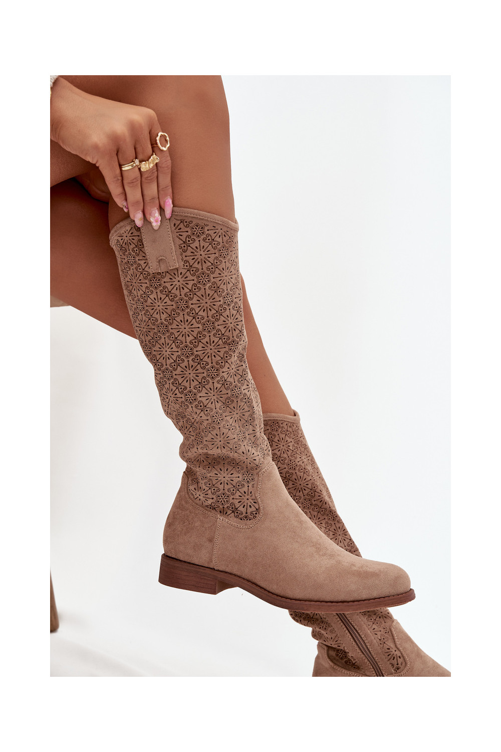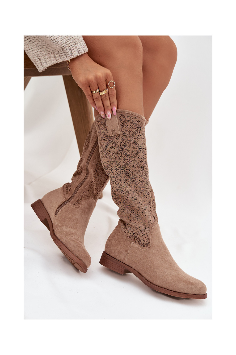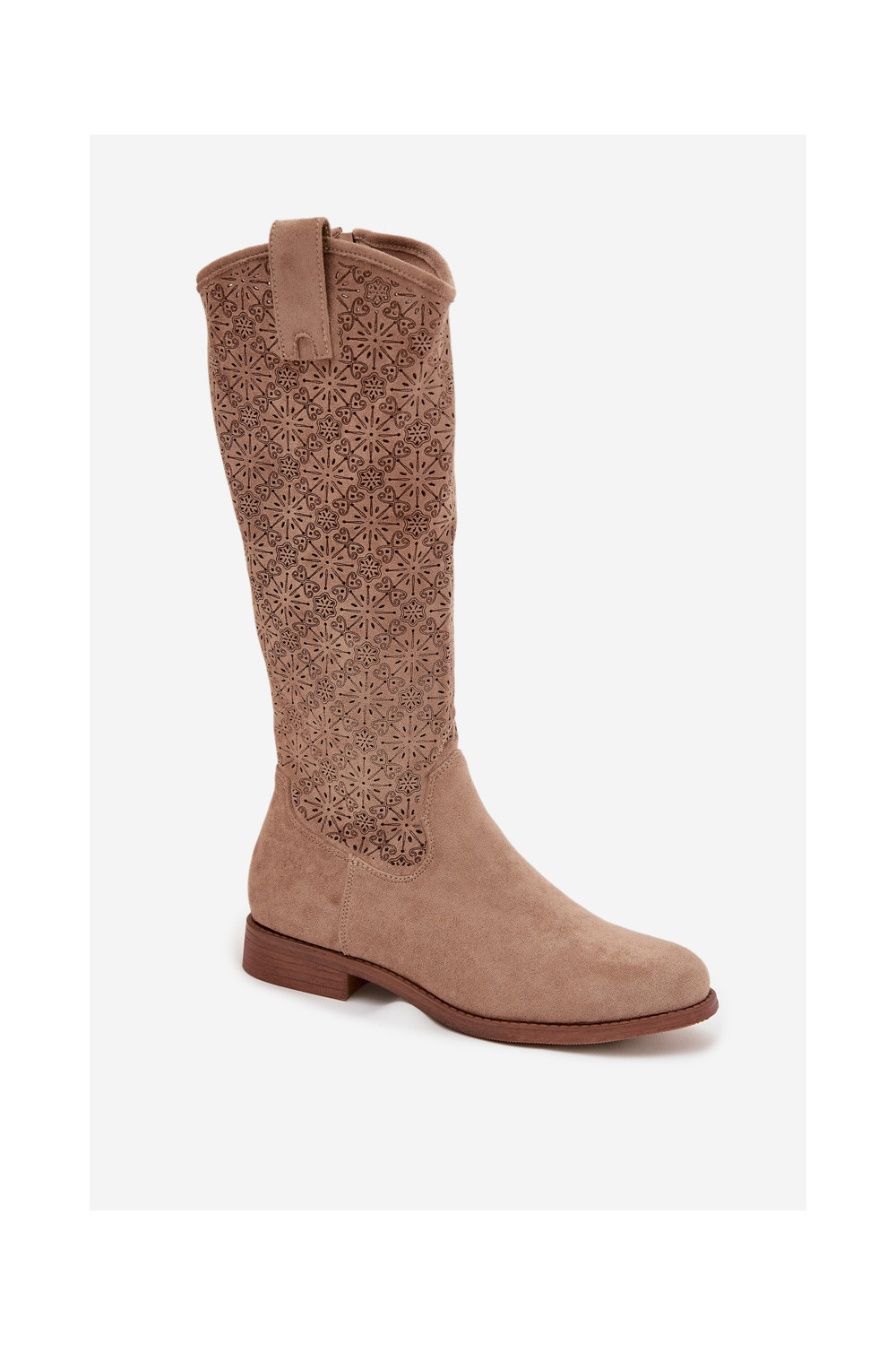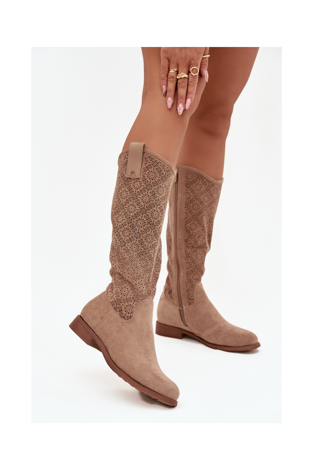Sieviešu augstie zābaki ar ažūra elementiem un platām papēžiem S.Barski HY52-534 smilšu krāsā