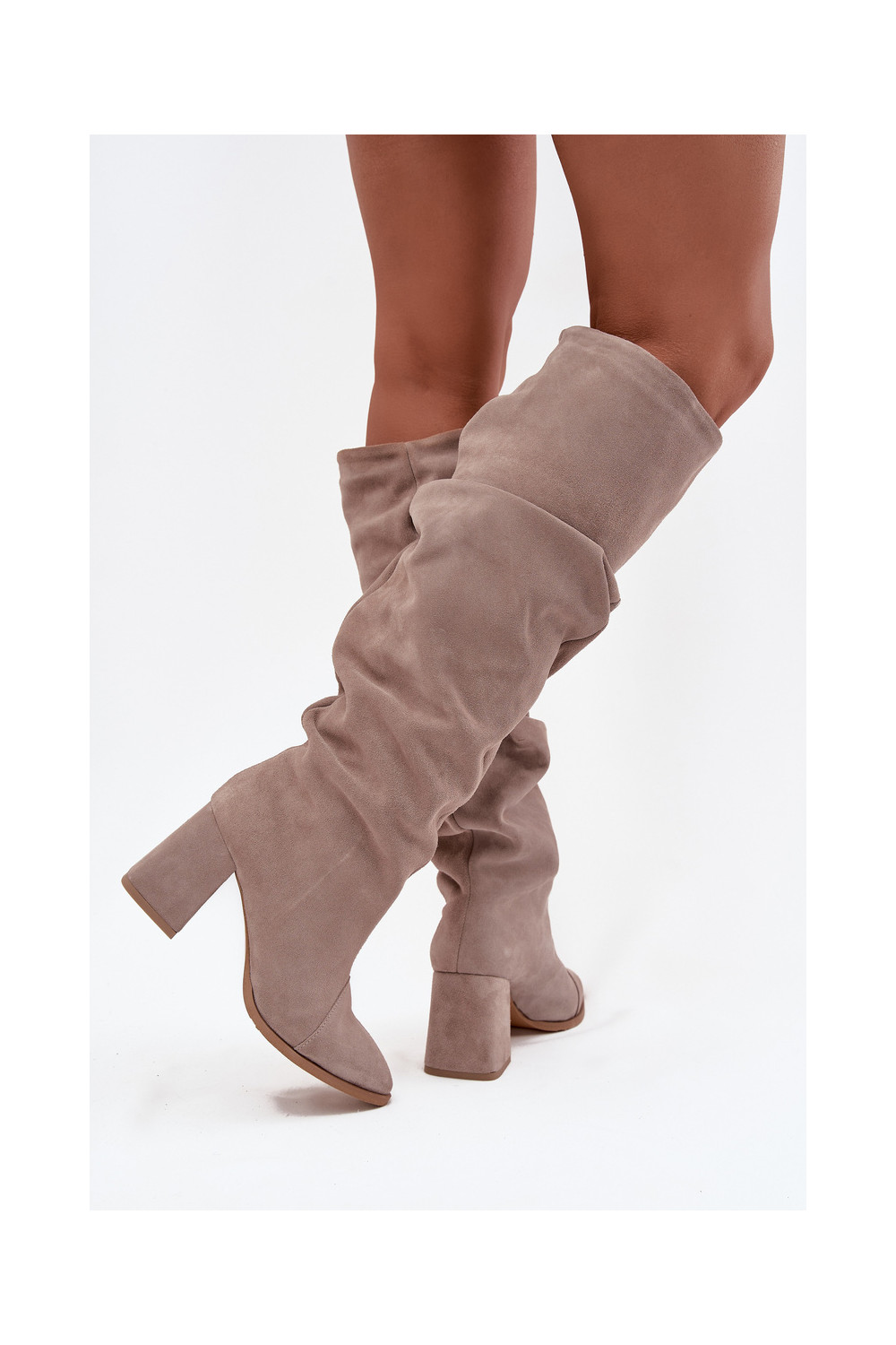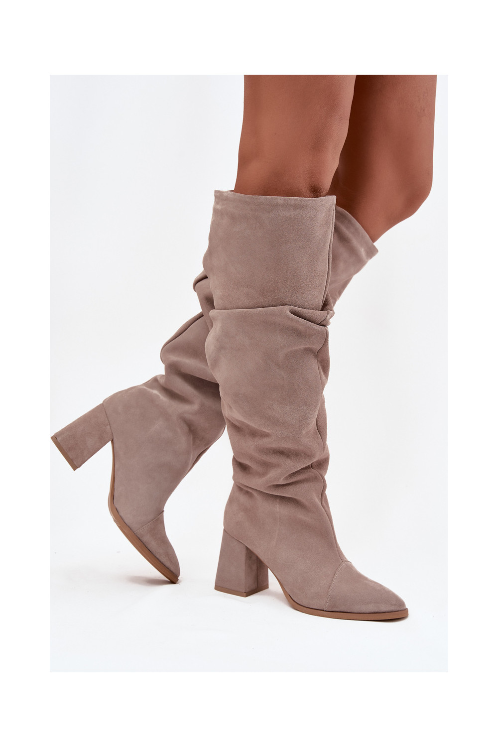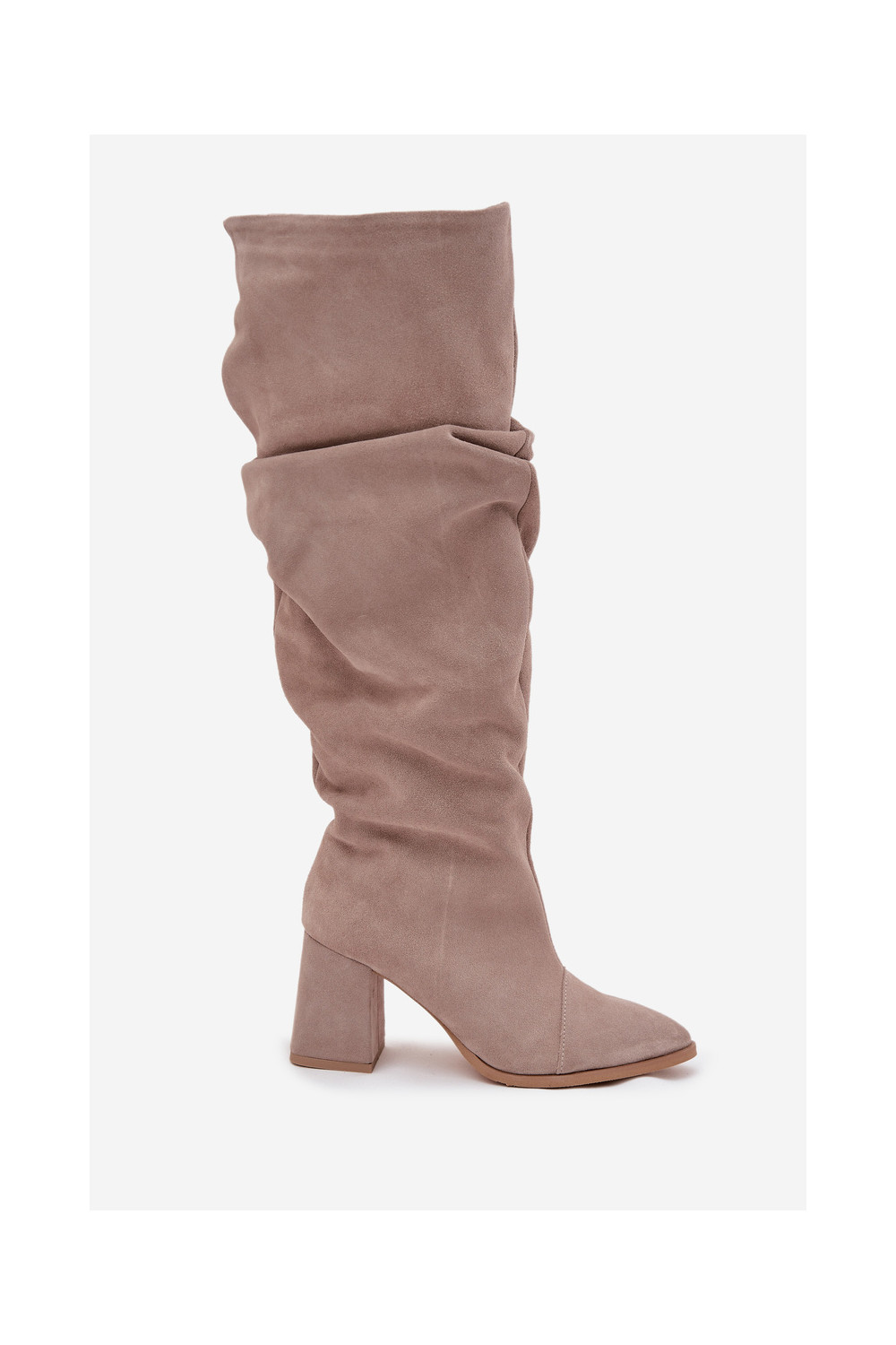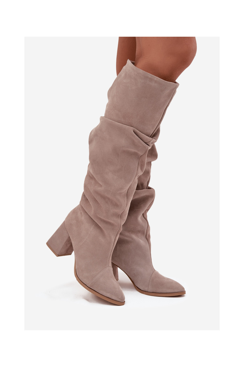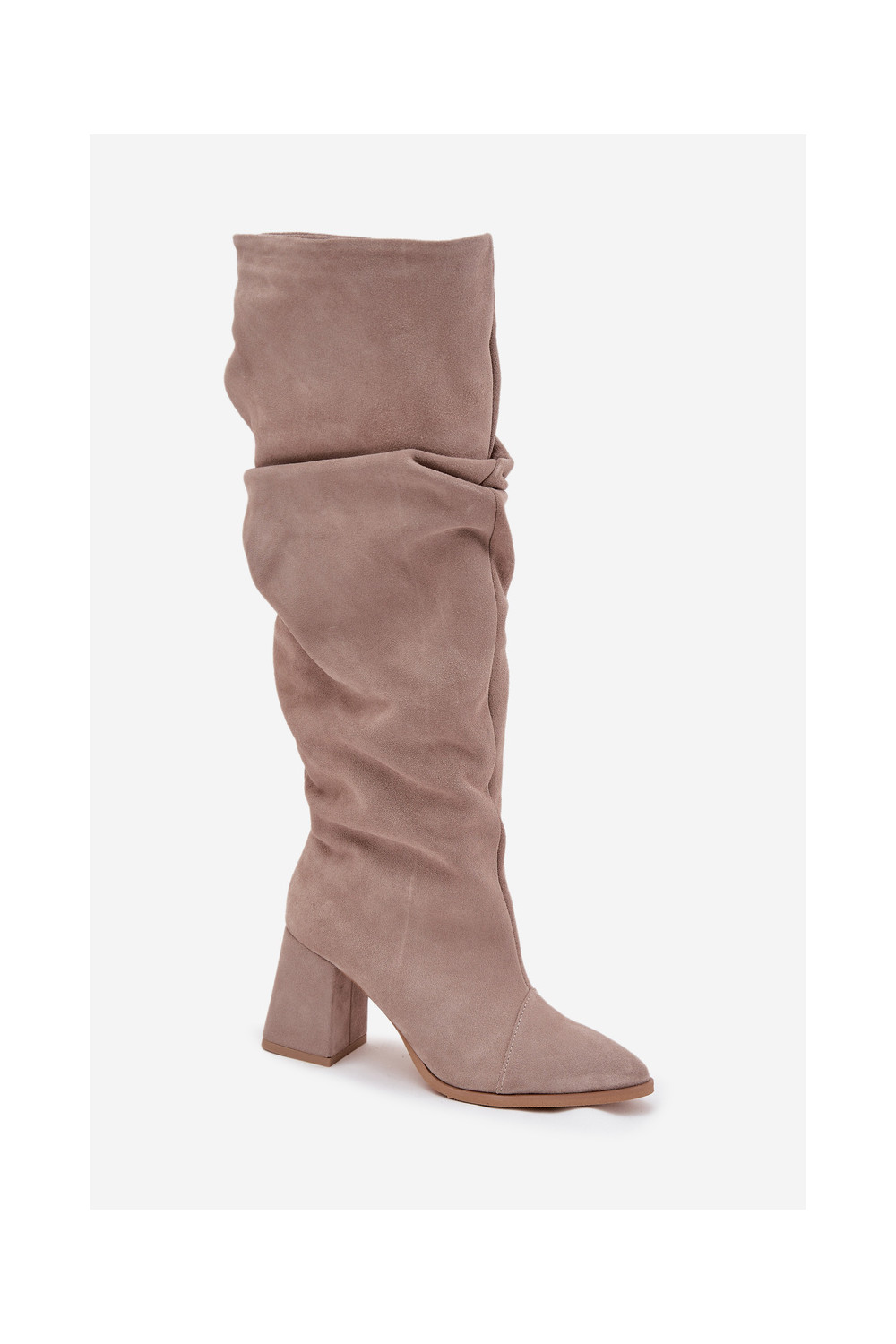 Susiraukšlējuši ilgaauliai zābaki no dabīgās zamšas ar papēžiem siltināti Zazoo 4228 smilšu krāsā