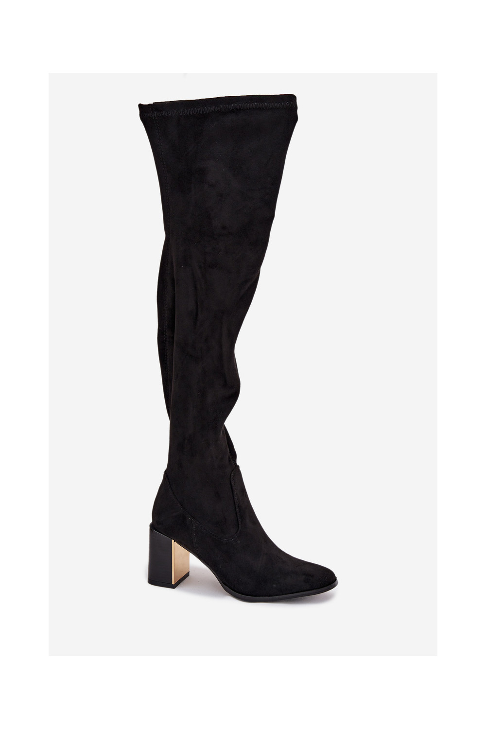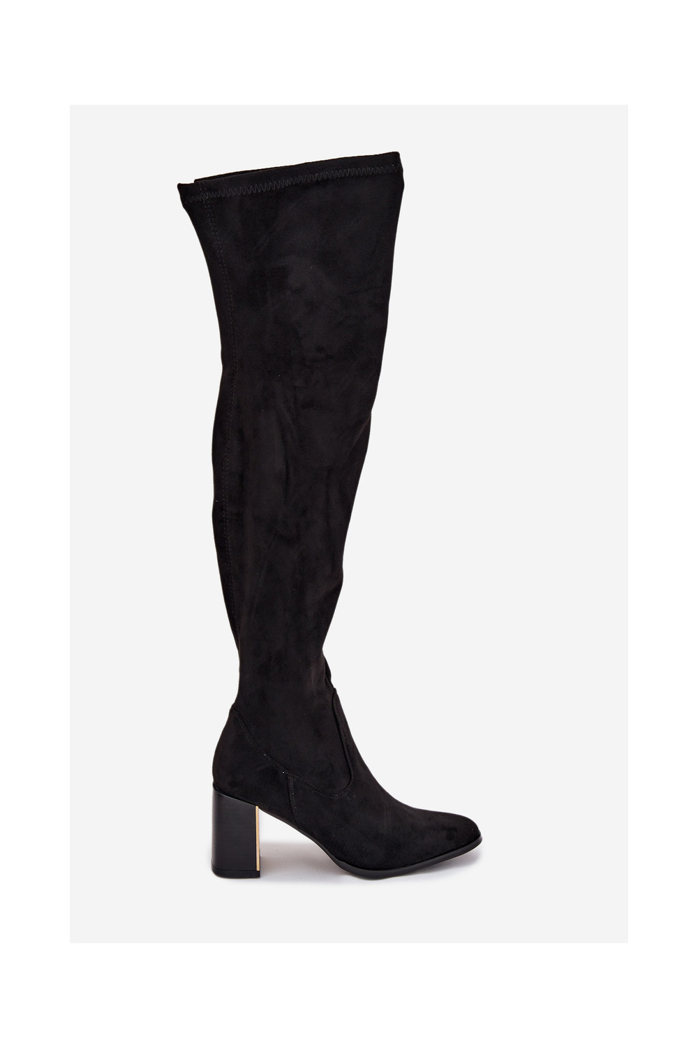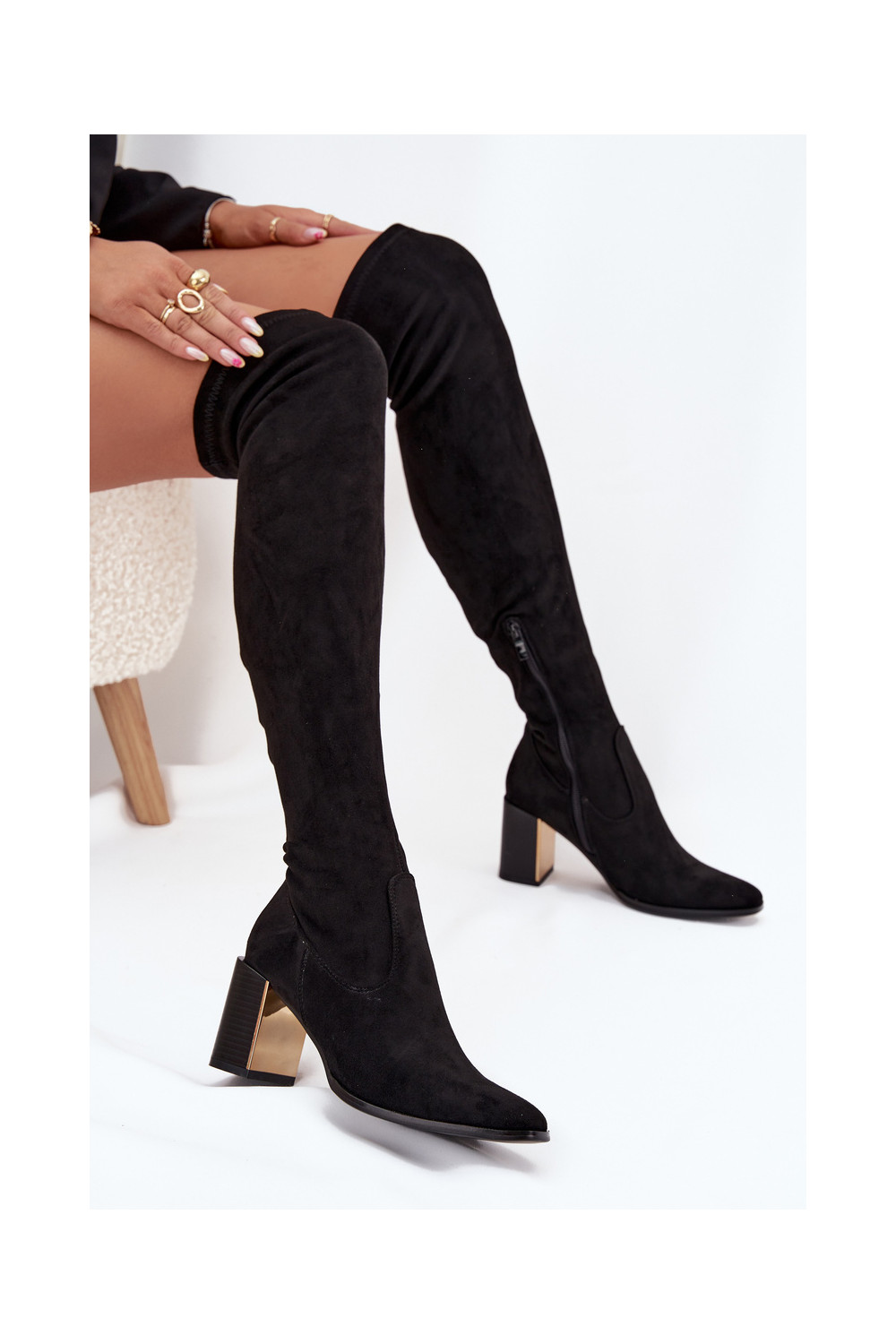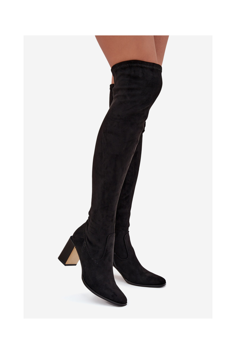 Sieviešu ilgaulīši virs ceļgala ar papēžiem no melnā mākslīgā zamša Jelina