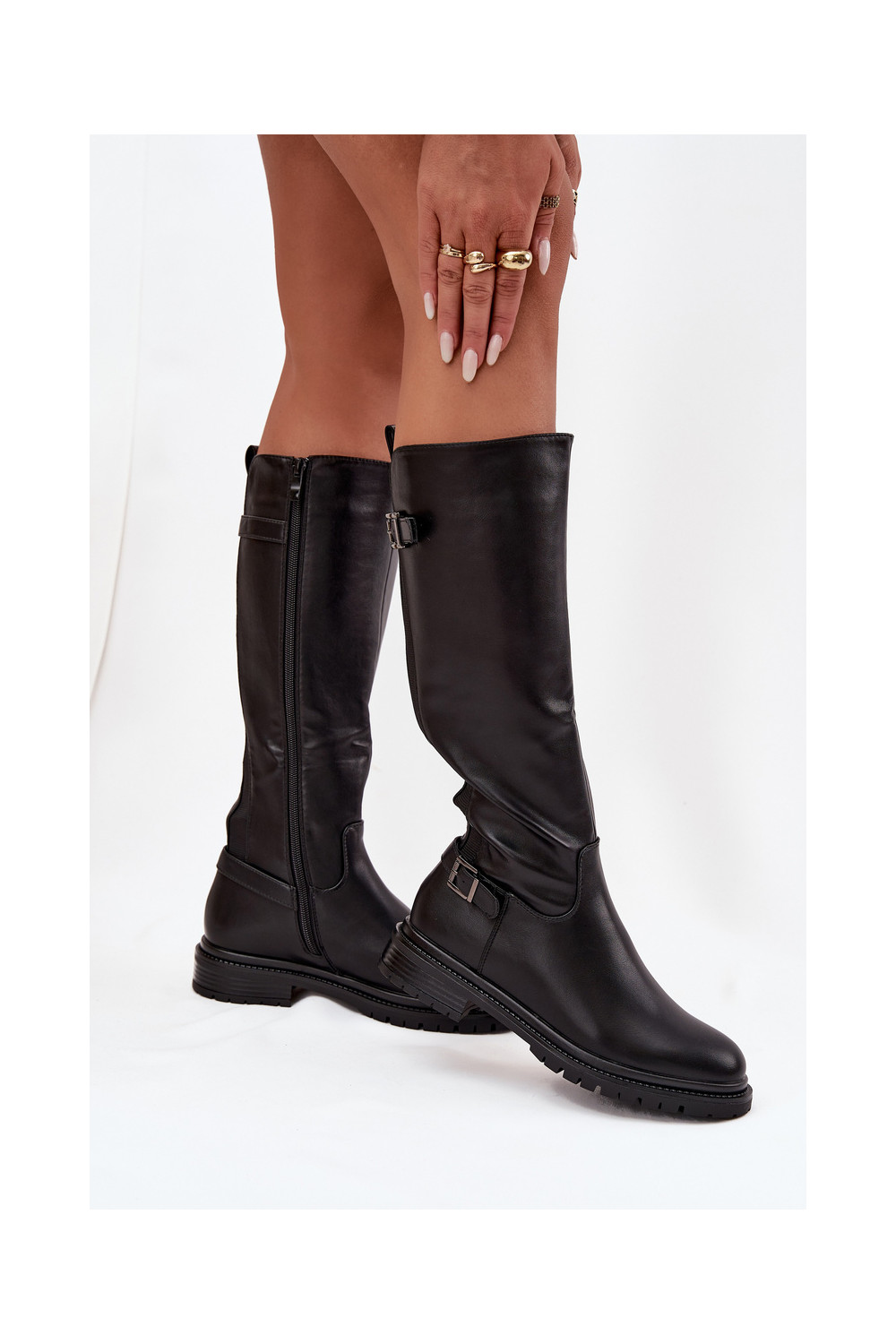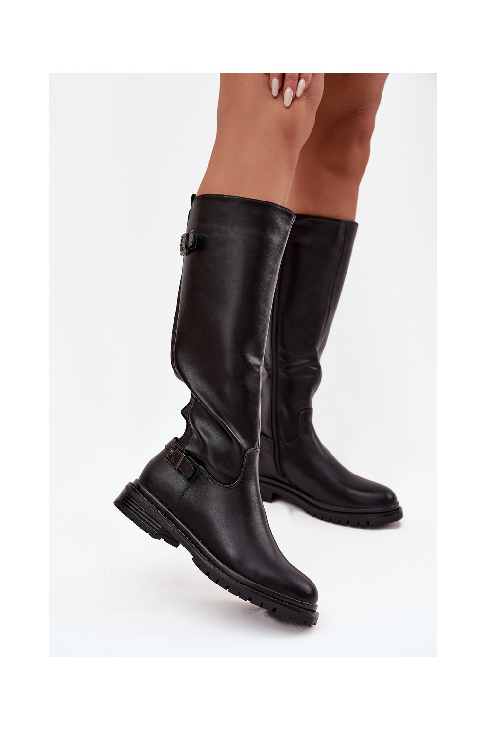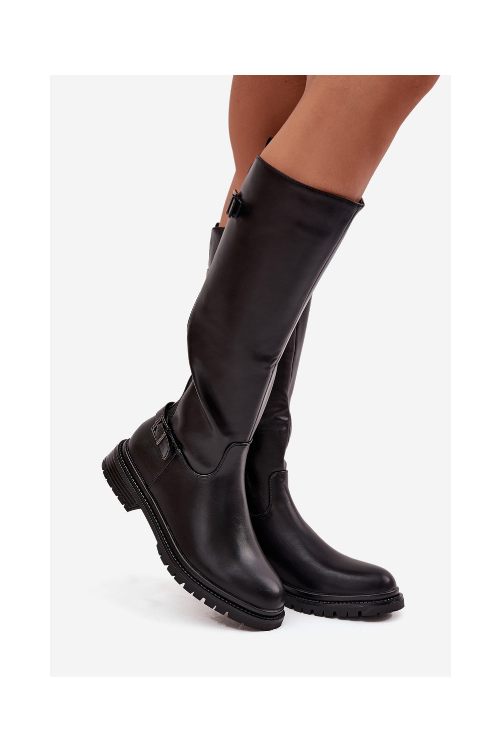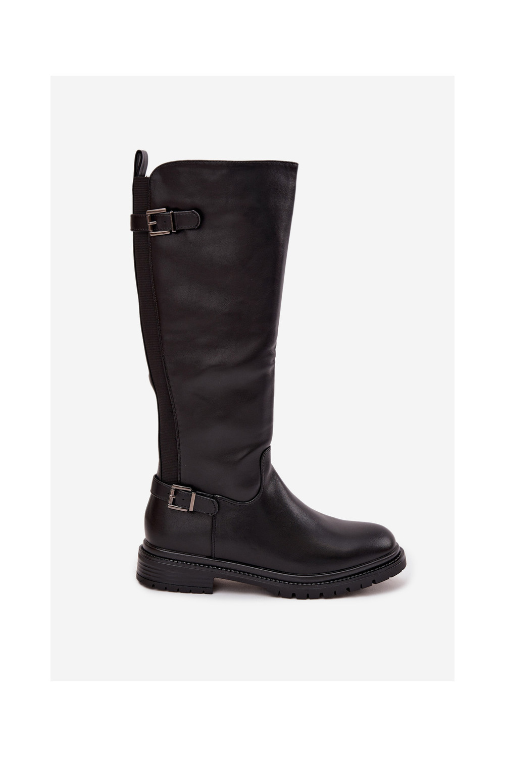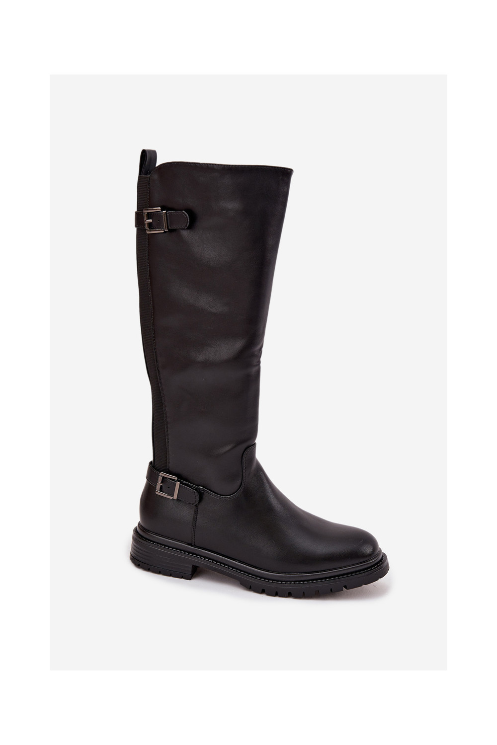 siltināti sieviešu garie zābaki ar platiem papēžiem ar sprādzēm melnas krāsas Sorelle