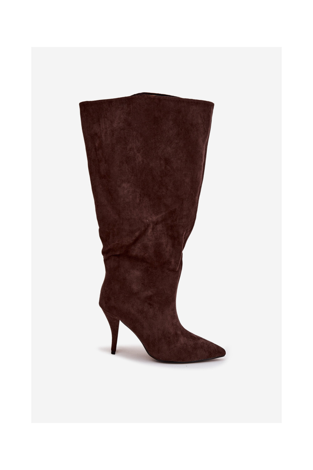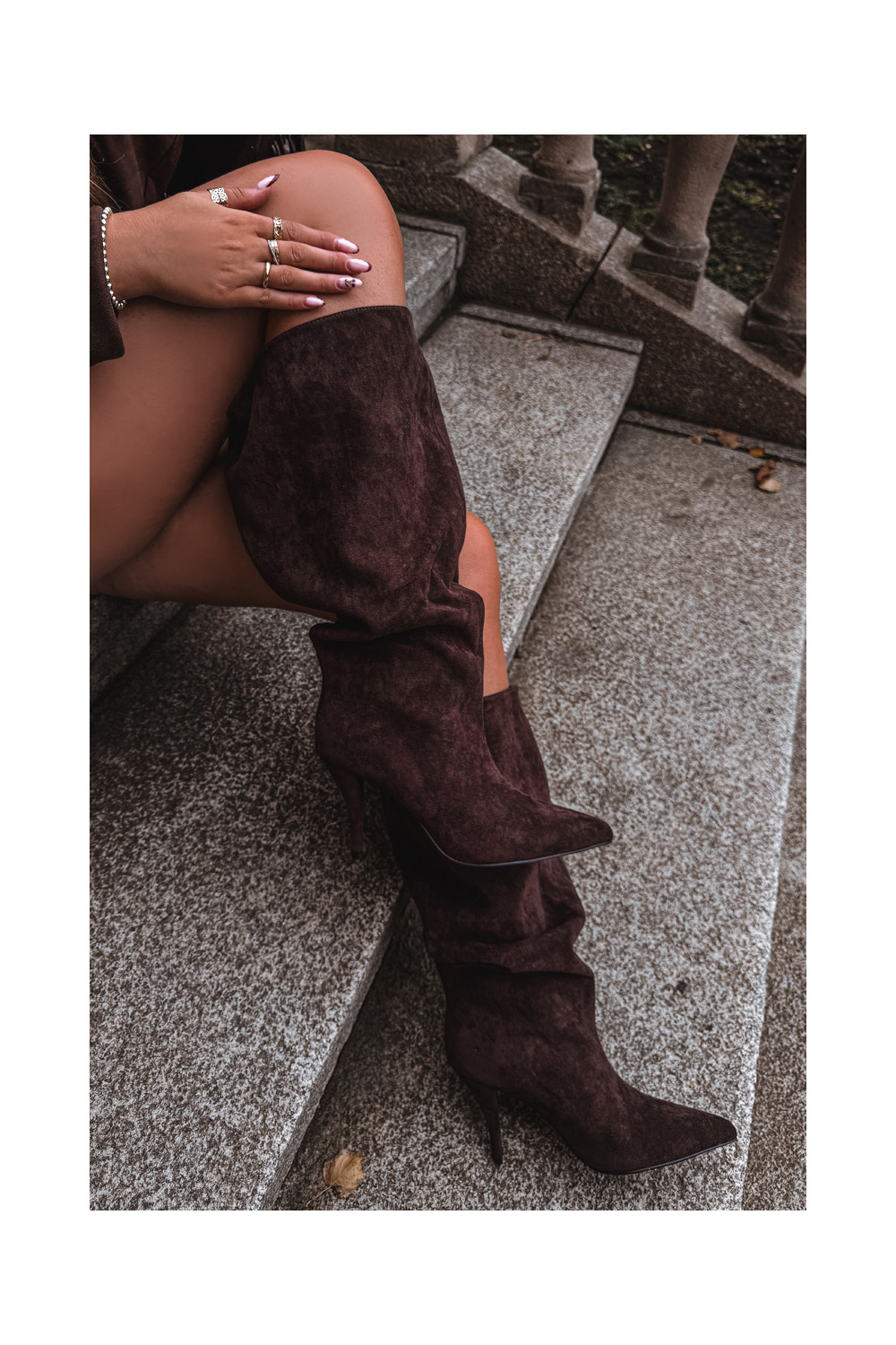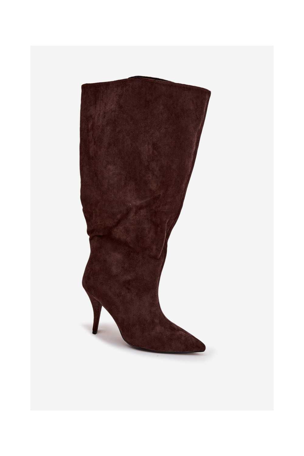 Iespraužami modeļa sieviešu garie zābaki ar plāniem papēžiem no mākslīgā zābaka šokolādes krāsā Noretta
