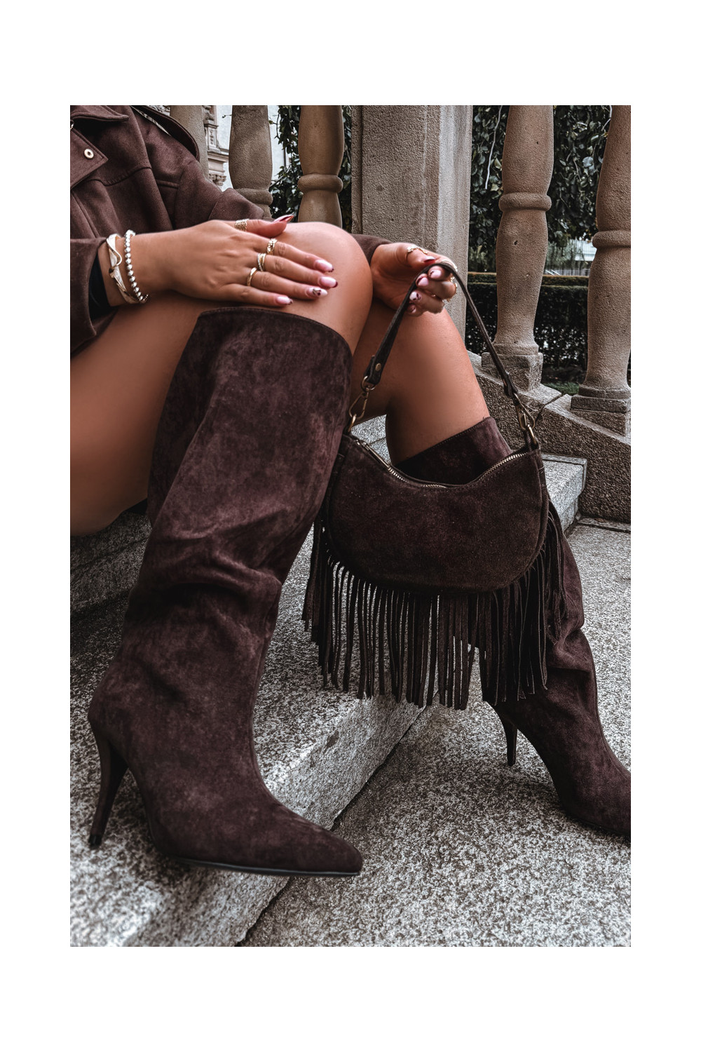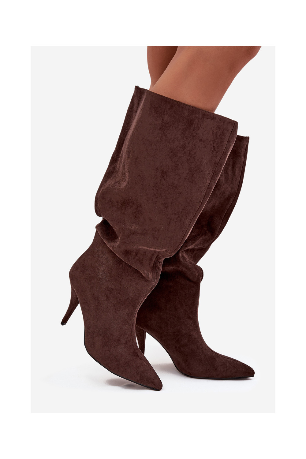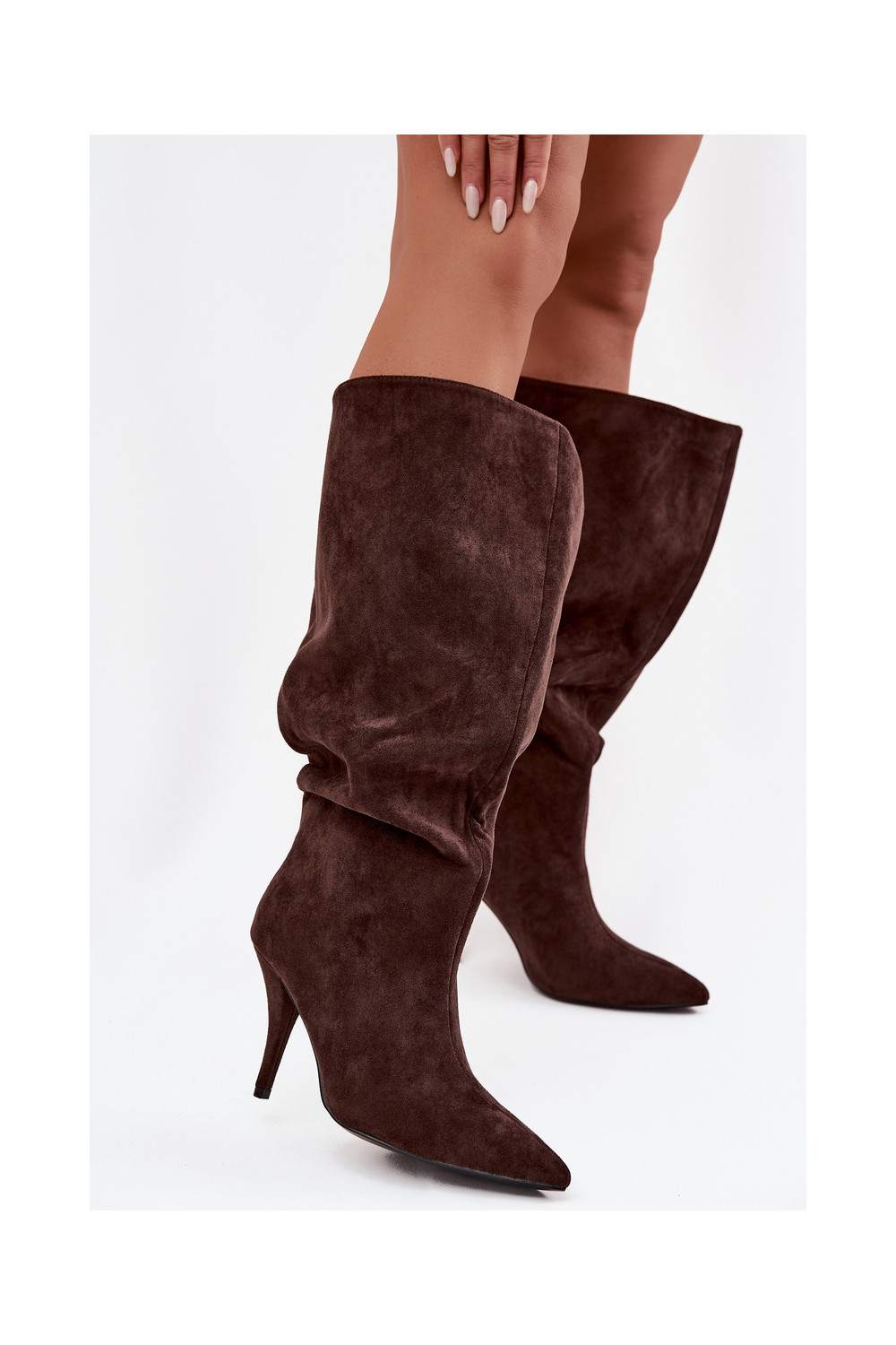 Iespraužami modeļa sieviešu garie zābaki ar plāniem papēžiem no mākslīgā zābaka šokolādes krāsā Noretta