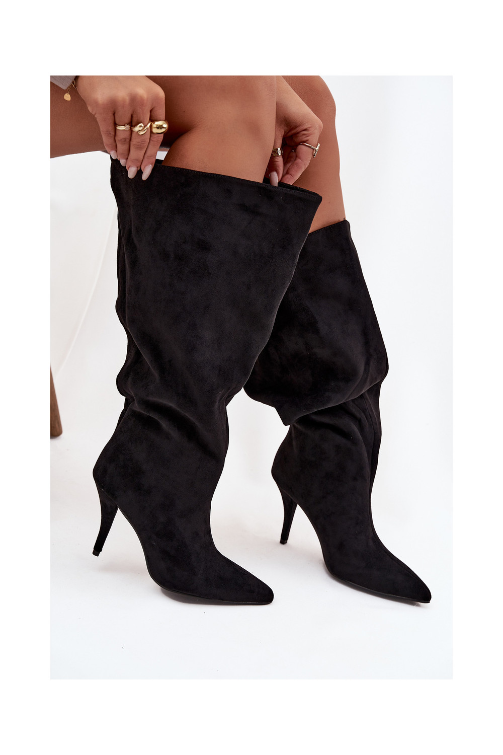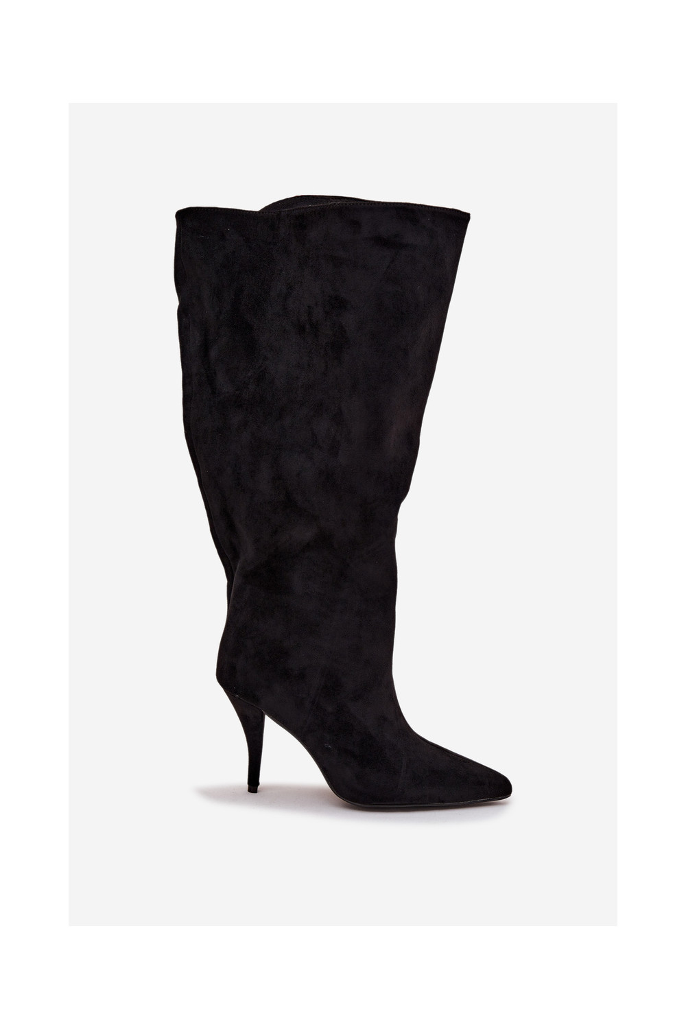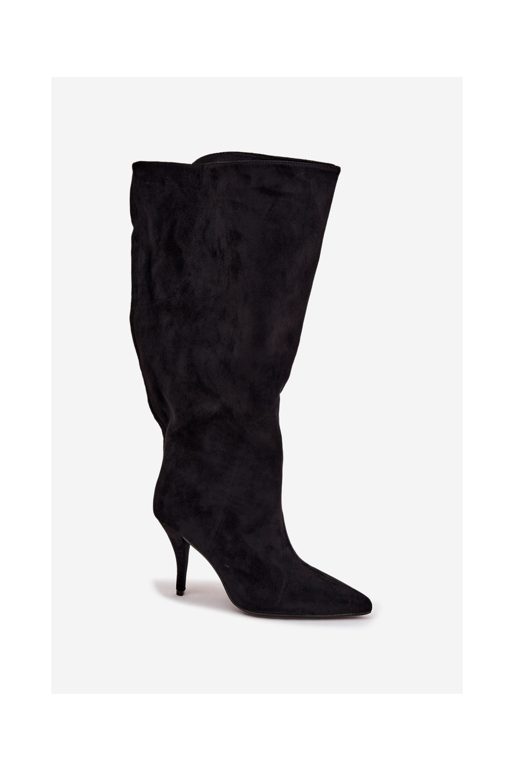 Iespraužami modeļa sieviešu garie zābaki ar plāniem papēžiem no mākslīgā zābaka melnā krāsā Noretta